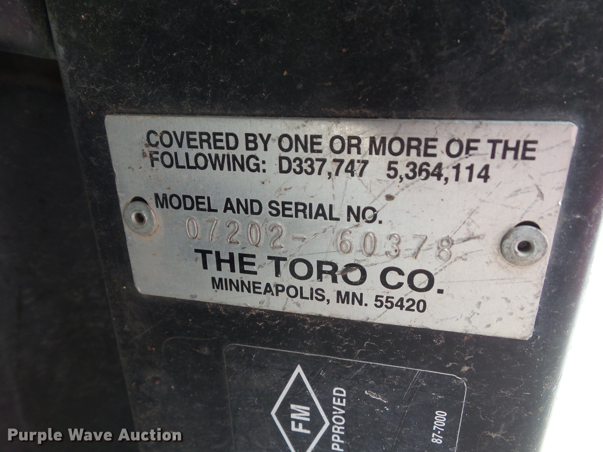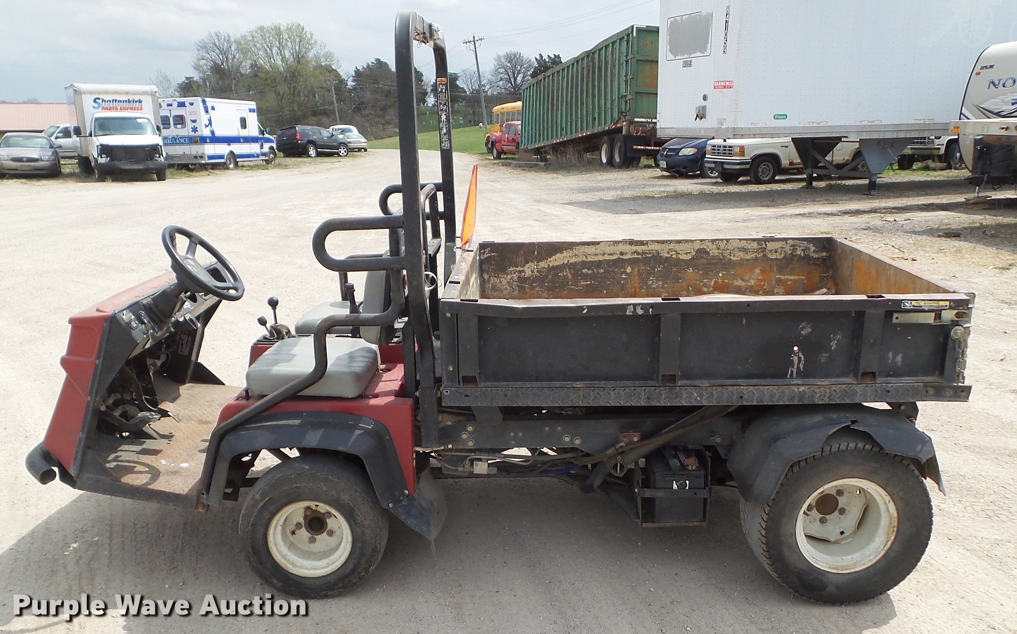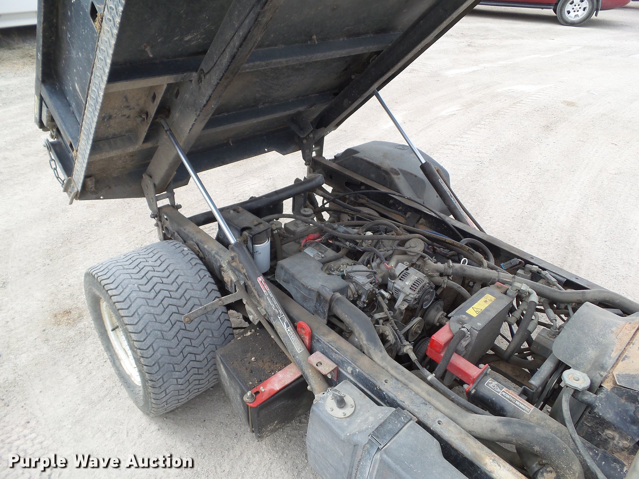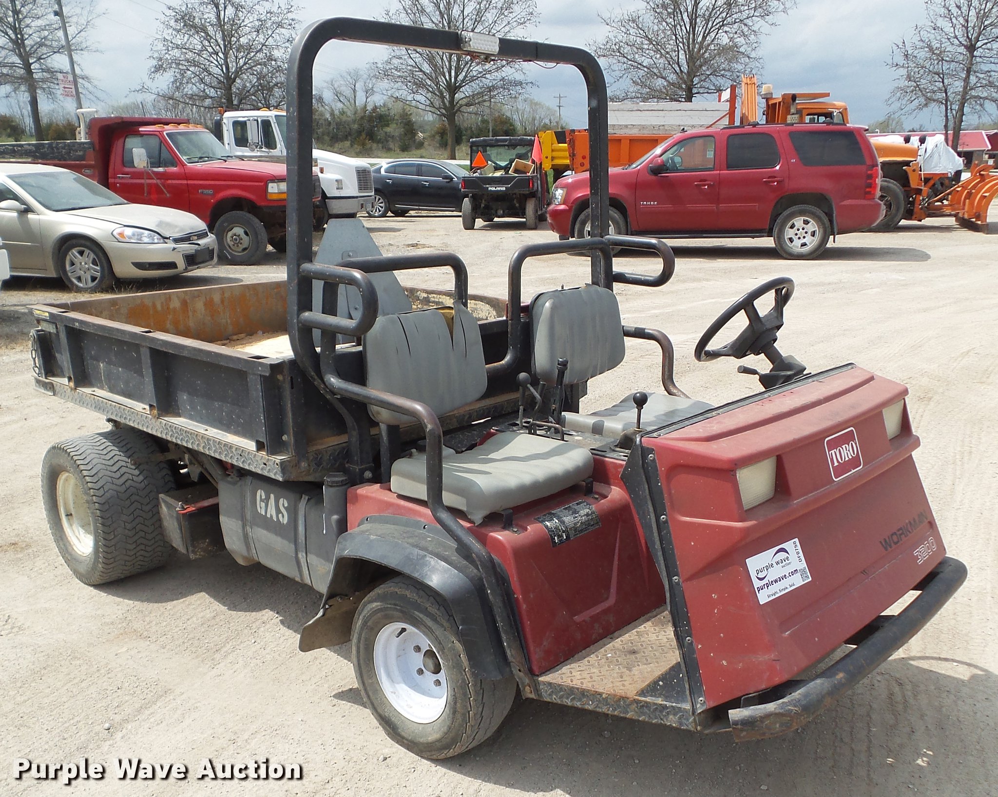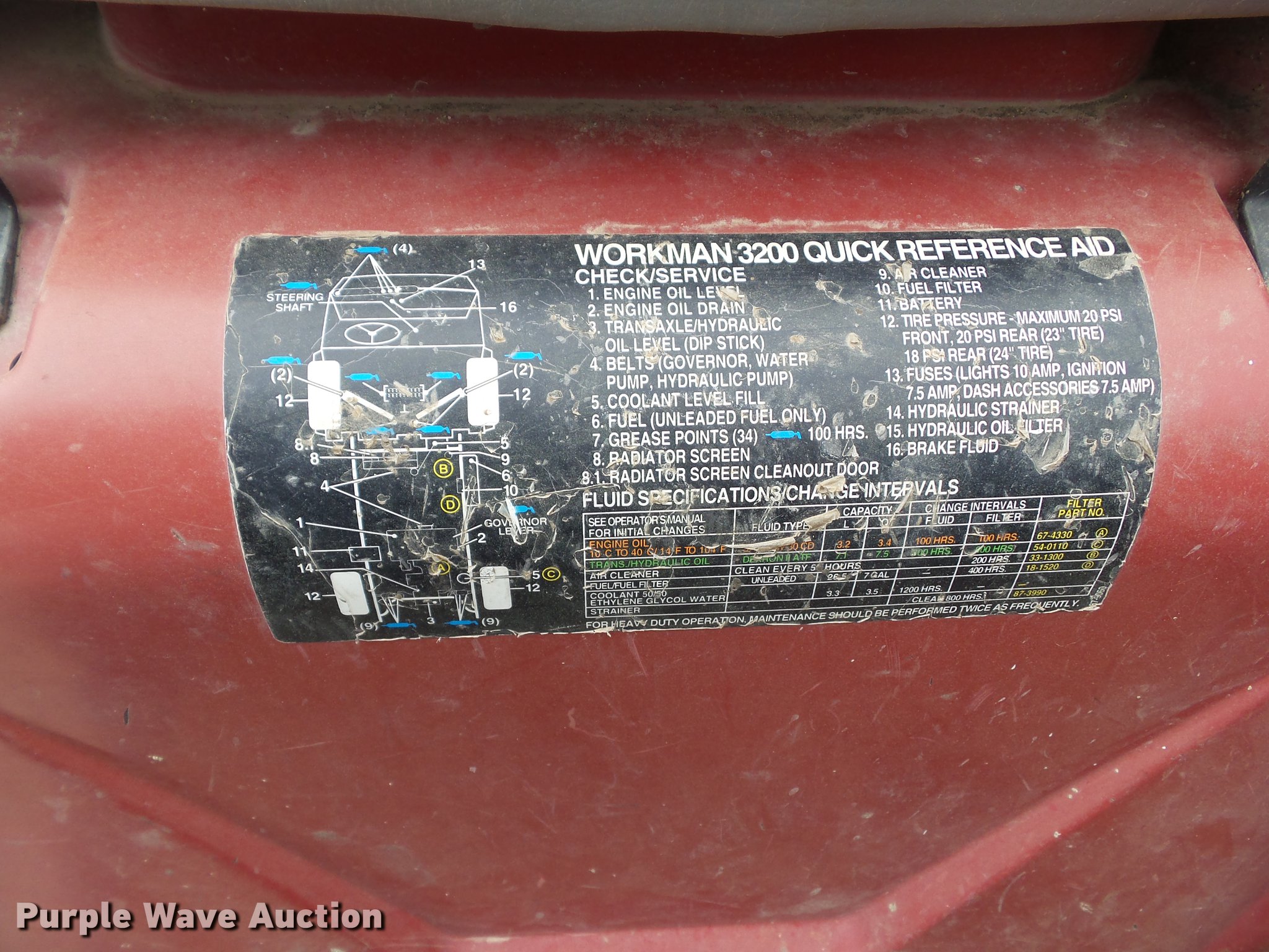 Purple Wave is selling a used Utility Vehicle in Iowa. This item is a 1996 Toro Workman 3200 utility vehcicle with the following: 5,139 hours on meter, Three cylinder gas engine, 3F-3R gears, Hi-Lo, Locking differential, 66" x 56" dump bed, 11" side height, Manual operated end gate, Stake side pockets, 20.5 x 8.0-10 front tires, 24 x 13.00-12 rear tires, Serial 0720260378