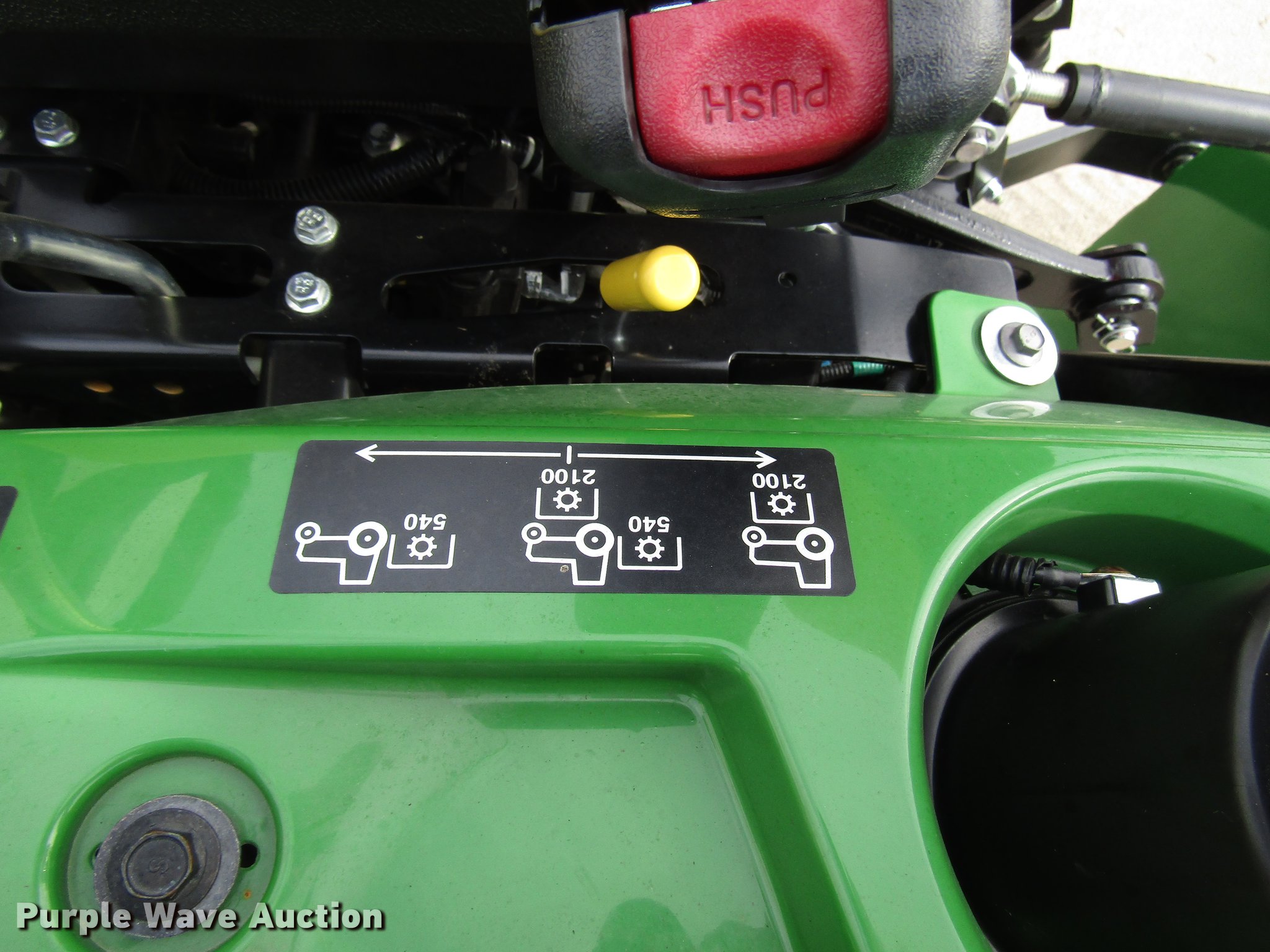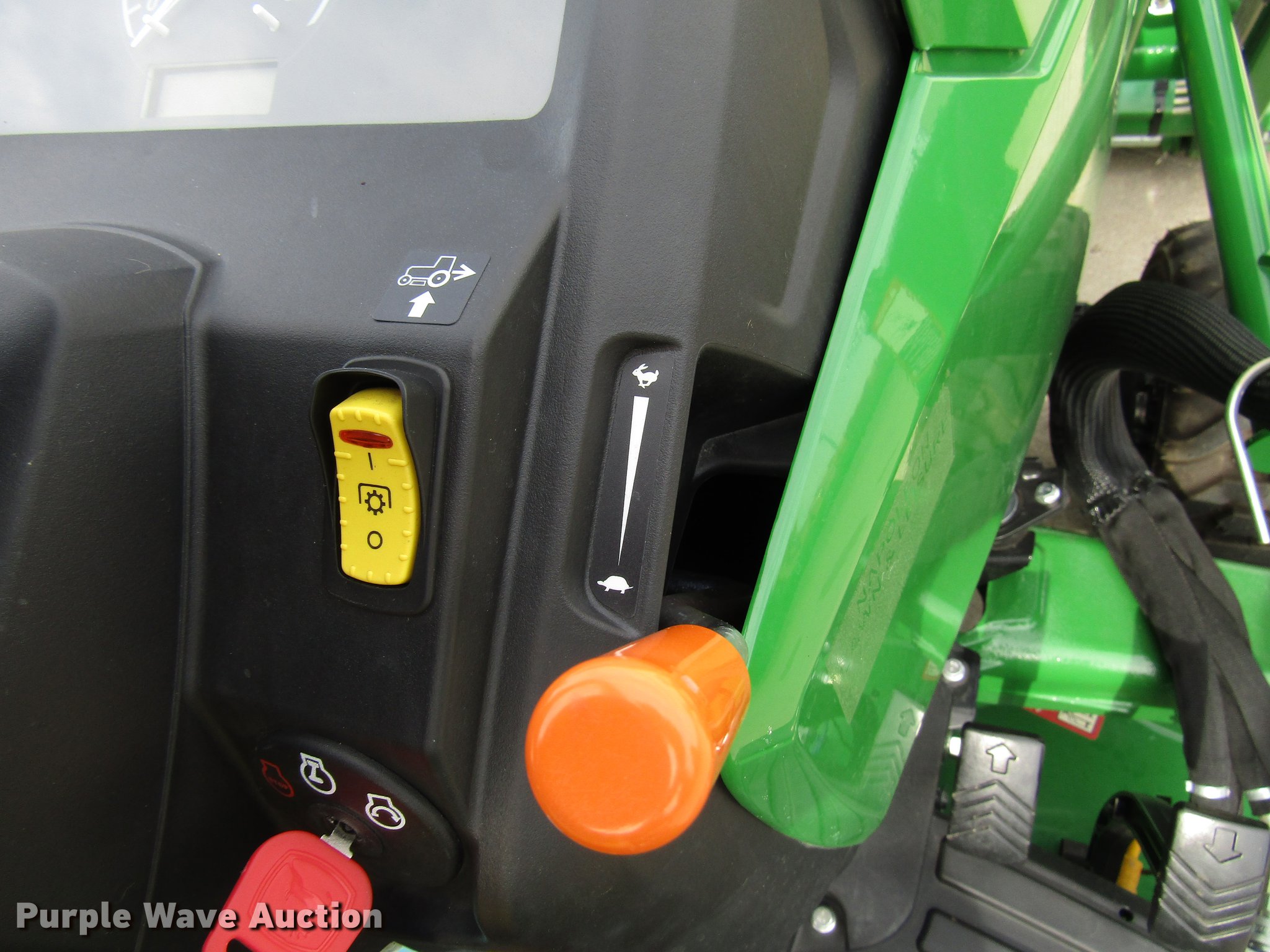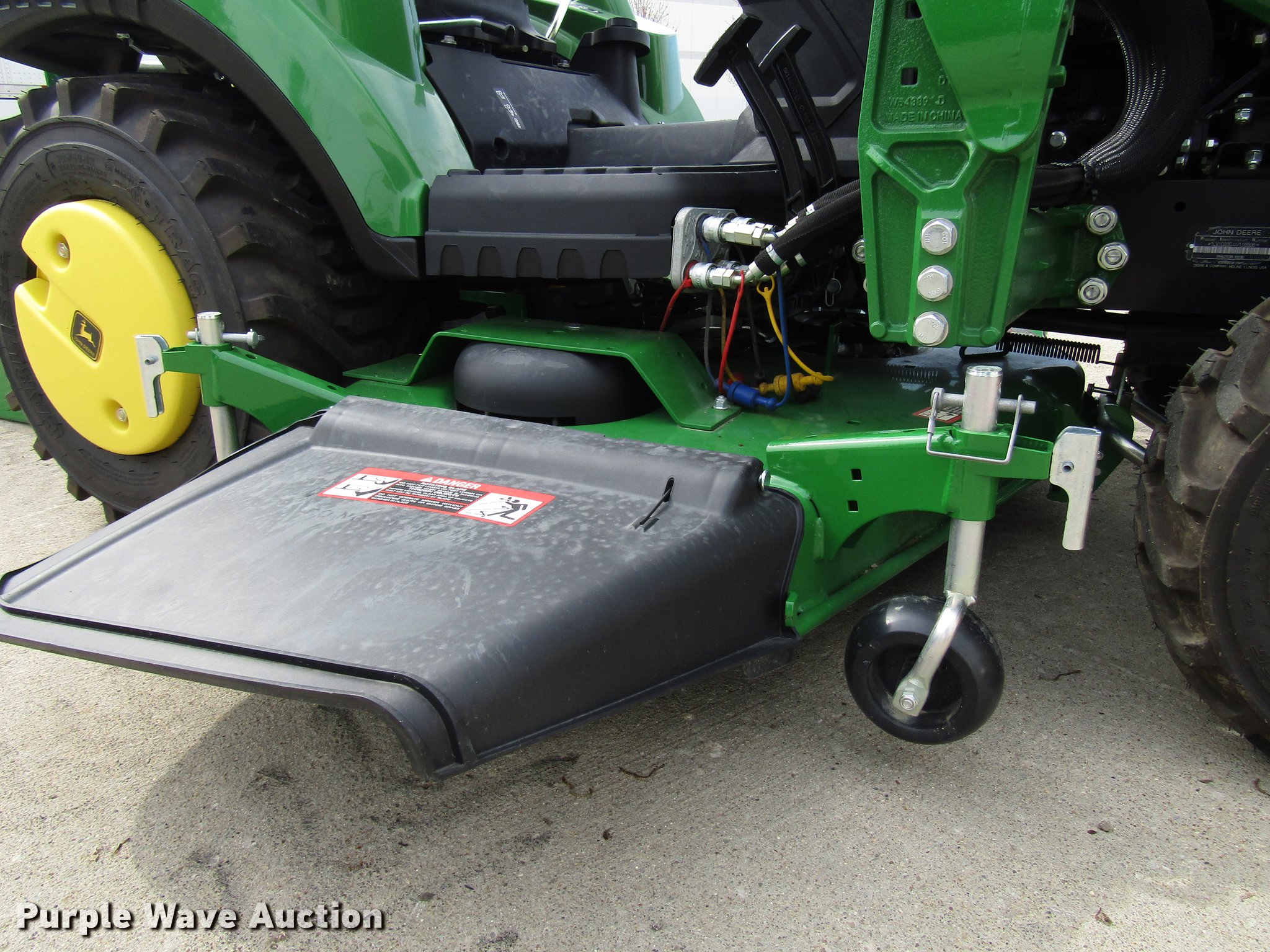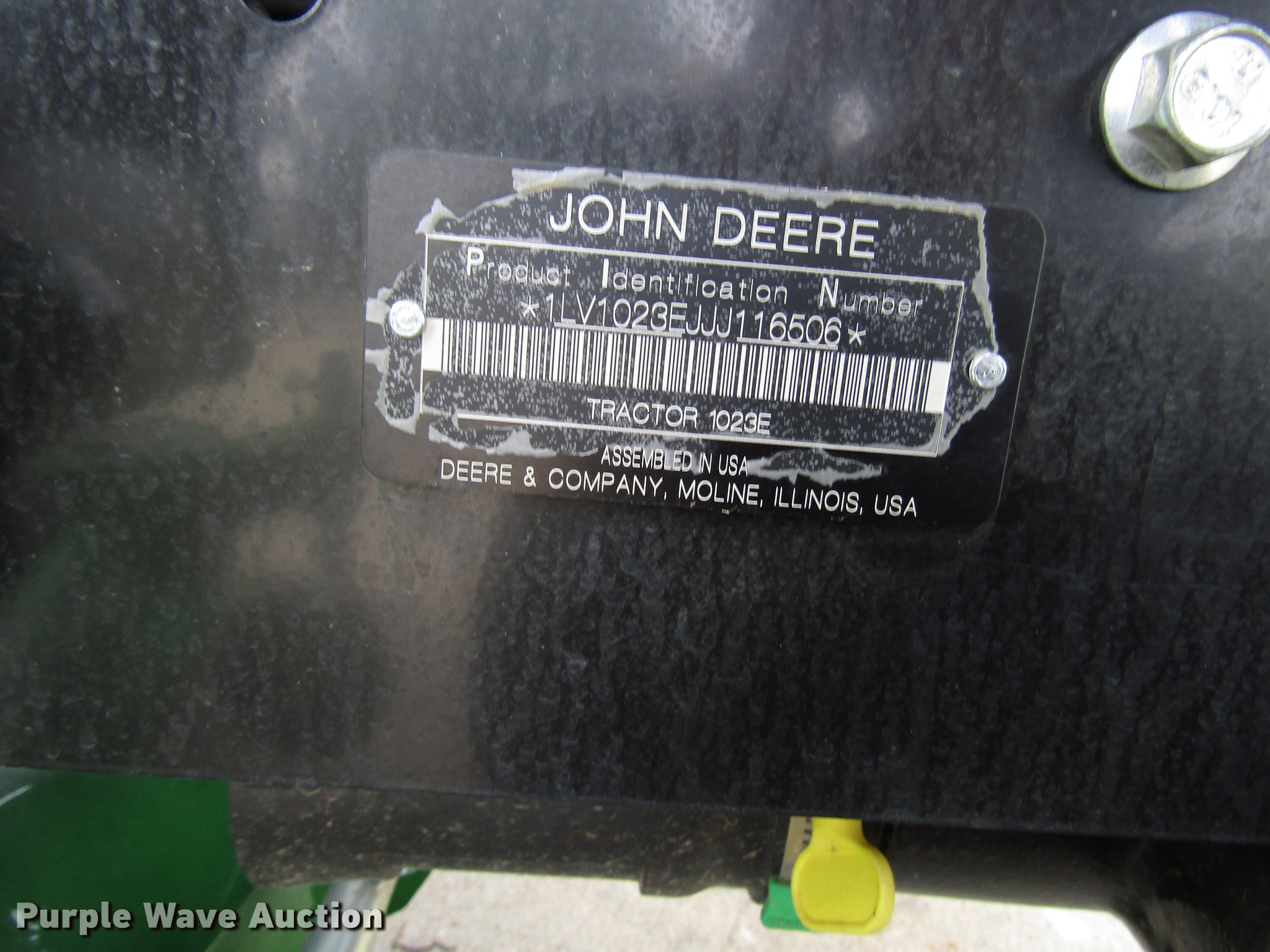 Purple Wave is selling a used Tractor in Ohio. This item is a 2018 John Deere 1023E MFWD tractor with the following: 6 hours on meter, Yanmar 3TNM74F-NCJT three cylinder diesel engine, Serial CH3U09D038359, Hydrostatic transmission, 2F-2R gears, Differential lock, John Deere 120R loader, 53"W bucket, Quick attach, Joystick controls, Serial 1P0120RXCHC017337, Three point, Top link, 540 PTO, (2) front hydraulic remote sets, John Deere weight ballast box, Mower deck, Model 60D, 60"W, Serial 1M01060DKHM089729, (2) wheel weights, 58" wheelbase, 215/50-10 front tires, 305/60-12 rear tires, Manufacture basic warranty until 2020, Manufacture power-train warranty until 2024, Serial 1LV1023EJJJ116506
