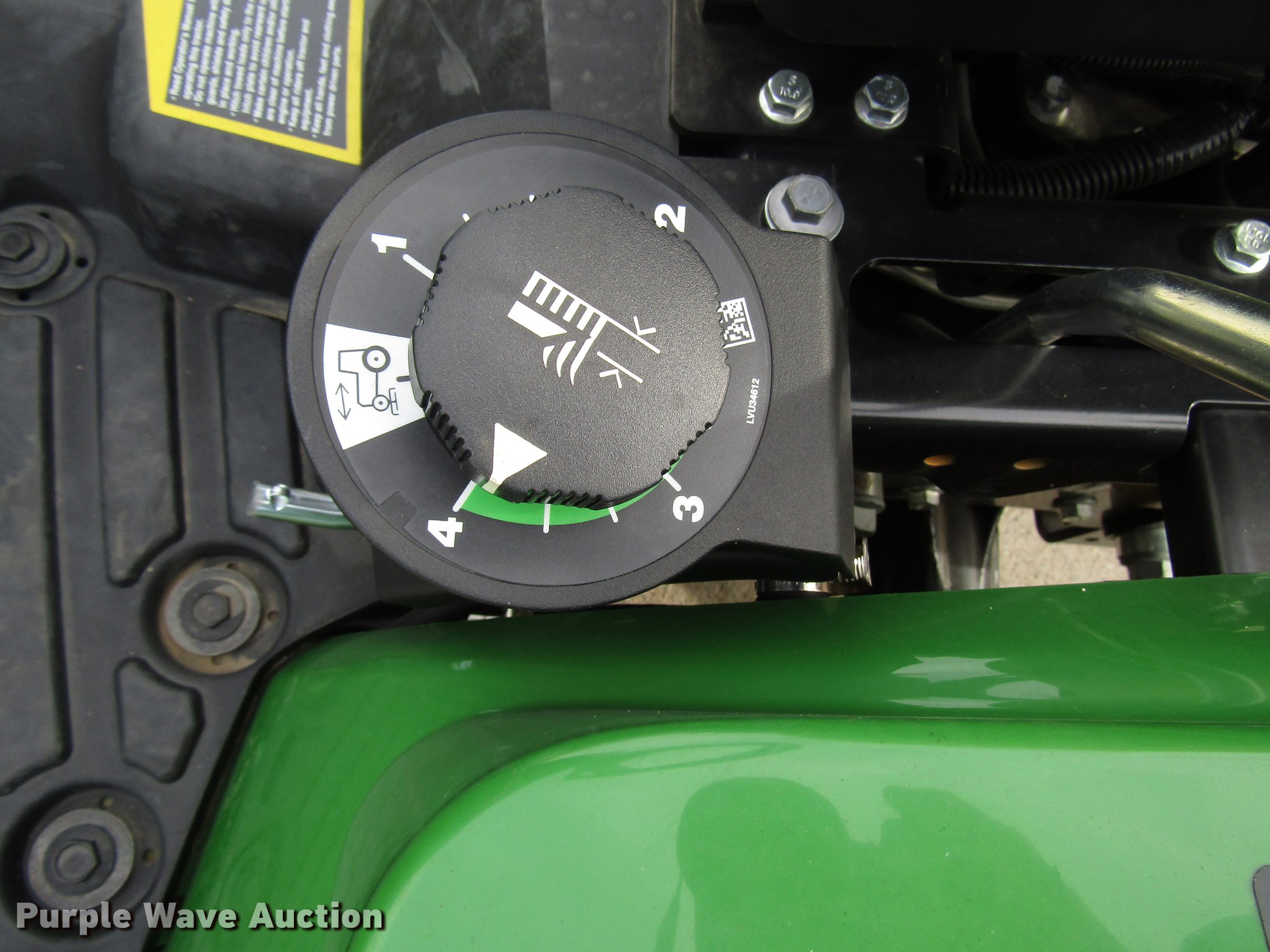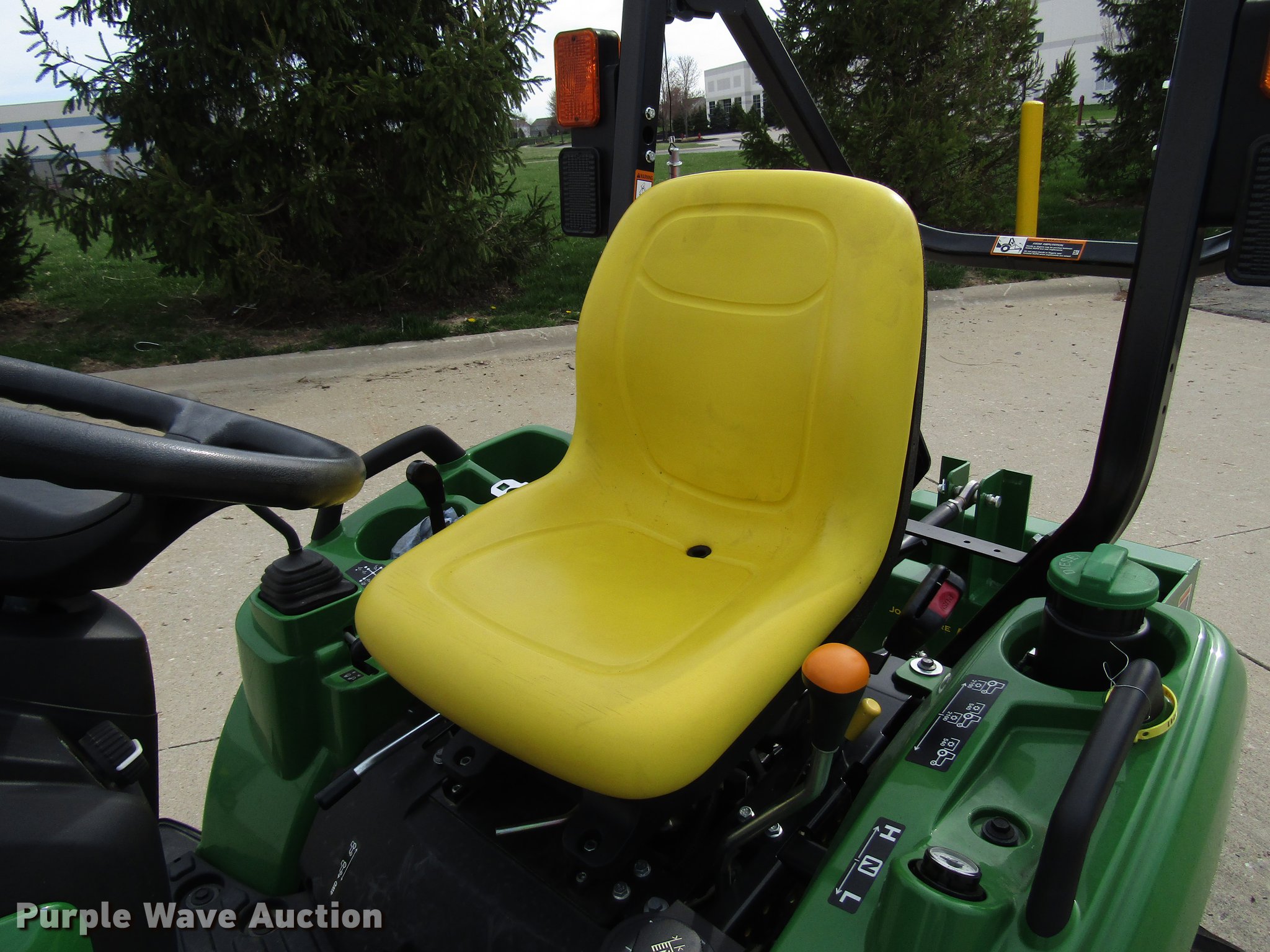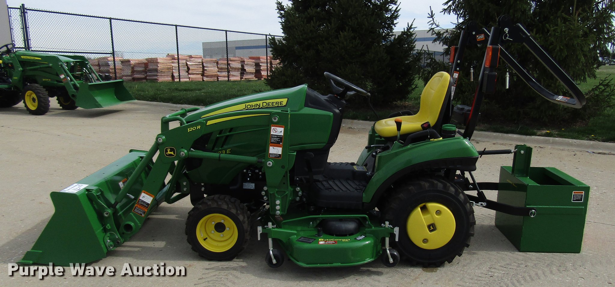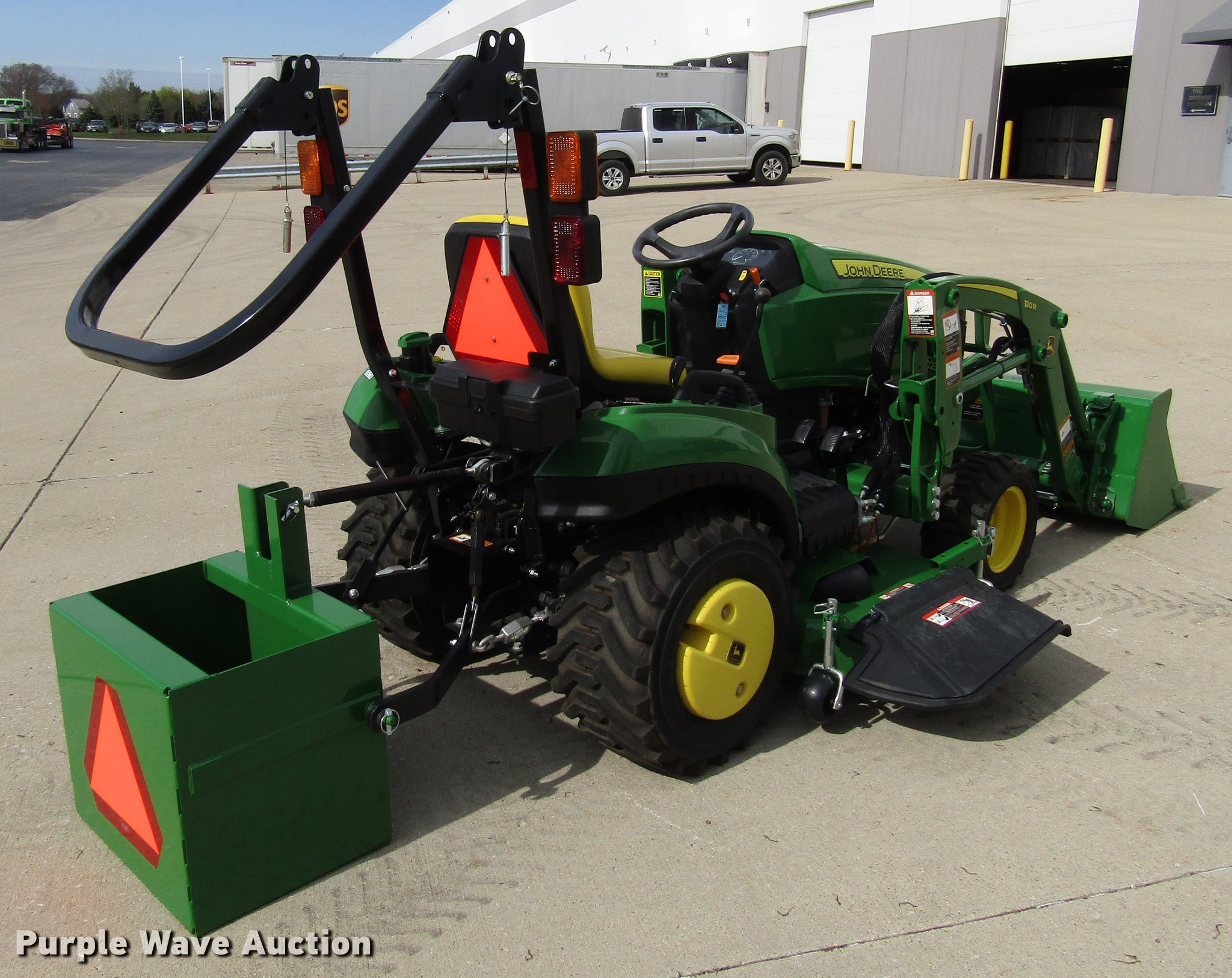 Purple Wave is selling a used Tractor in Ohio. This item is a 2018 John Deere 1023E MFWD tractor with the following: 6 hours on meter, Yanmar 3TNM74F-NCJT three cylinder diesel engine, Serial CH3U09D038359, Hydrostatic transmission, 2F-2R gears, Differential lock, John Deere 120R loader, 53"W bucket, Quick attach, Joystick controls, Serial 1P0120RXCHC017337, Three point, Top link, 540 PTO, (2) front hydraulic remote sets, John Deere weight ballast box, Mower deck, Model 60D, 60"W, Serial 1M01060DKHM089729, (2) wheel weights, 58" wheelbase, 215/50-10 front tires, 305/60-12 rear tires, Manufacture basic warranty until 2020, Manufacture power-train warranty until 2024, Serial 1LV1023EJJJ116506