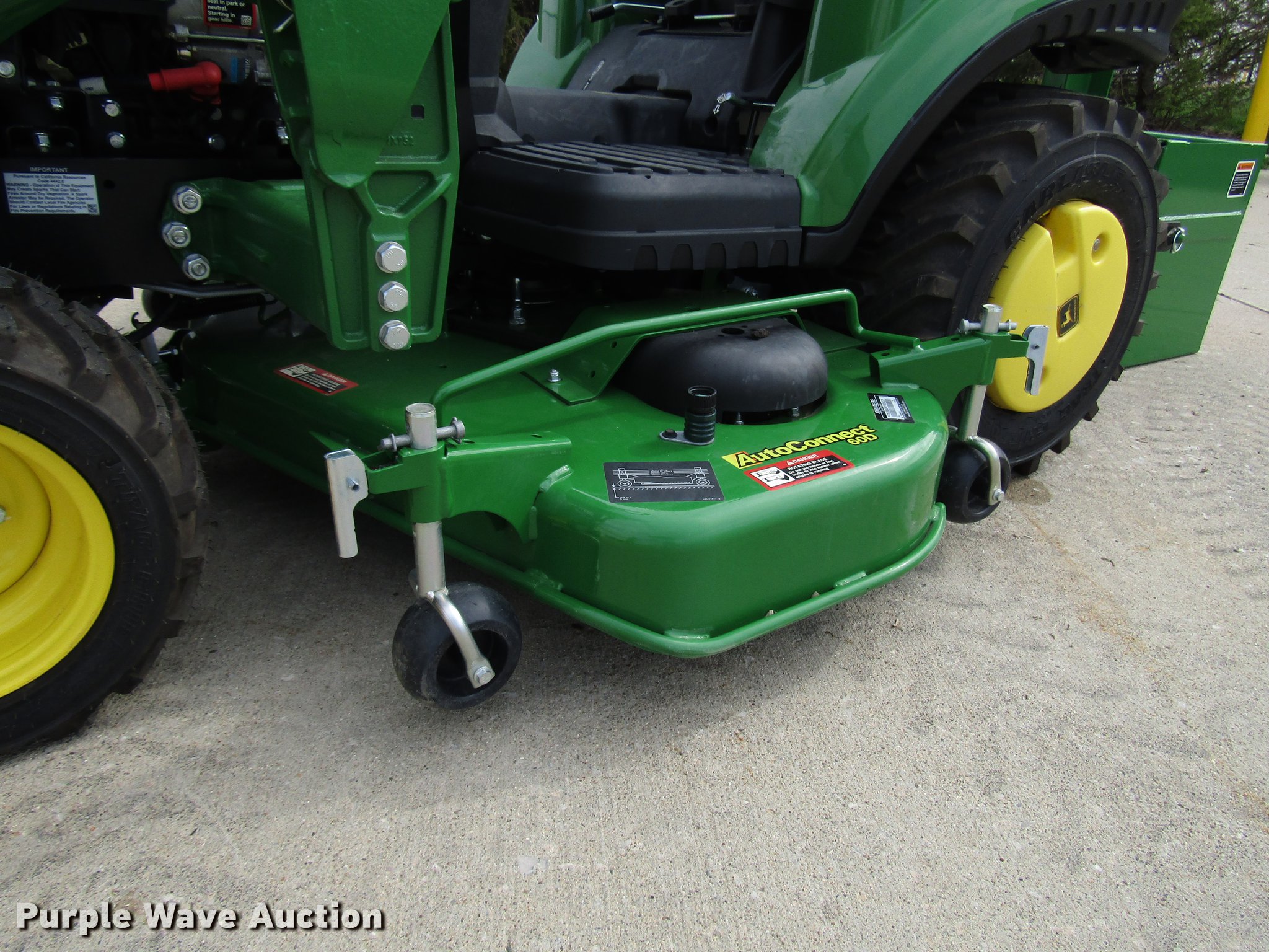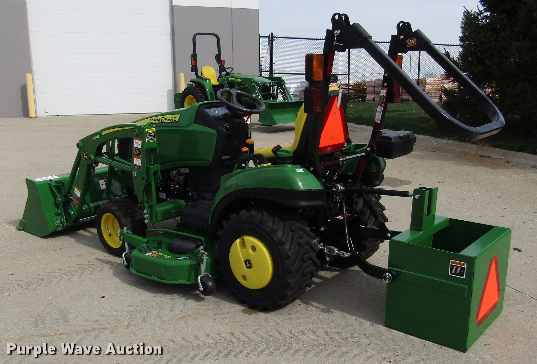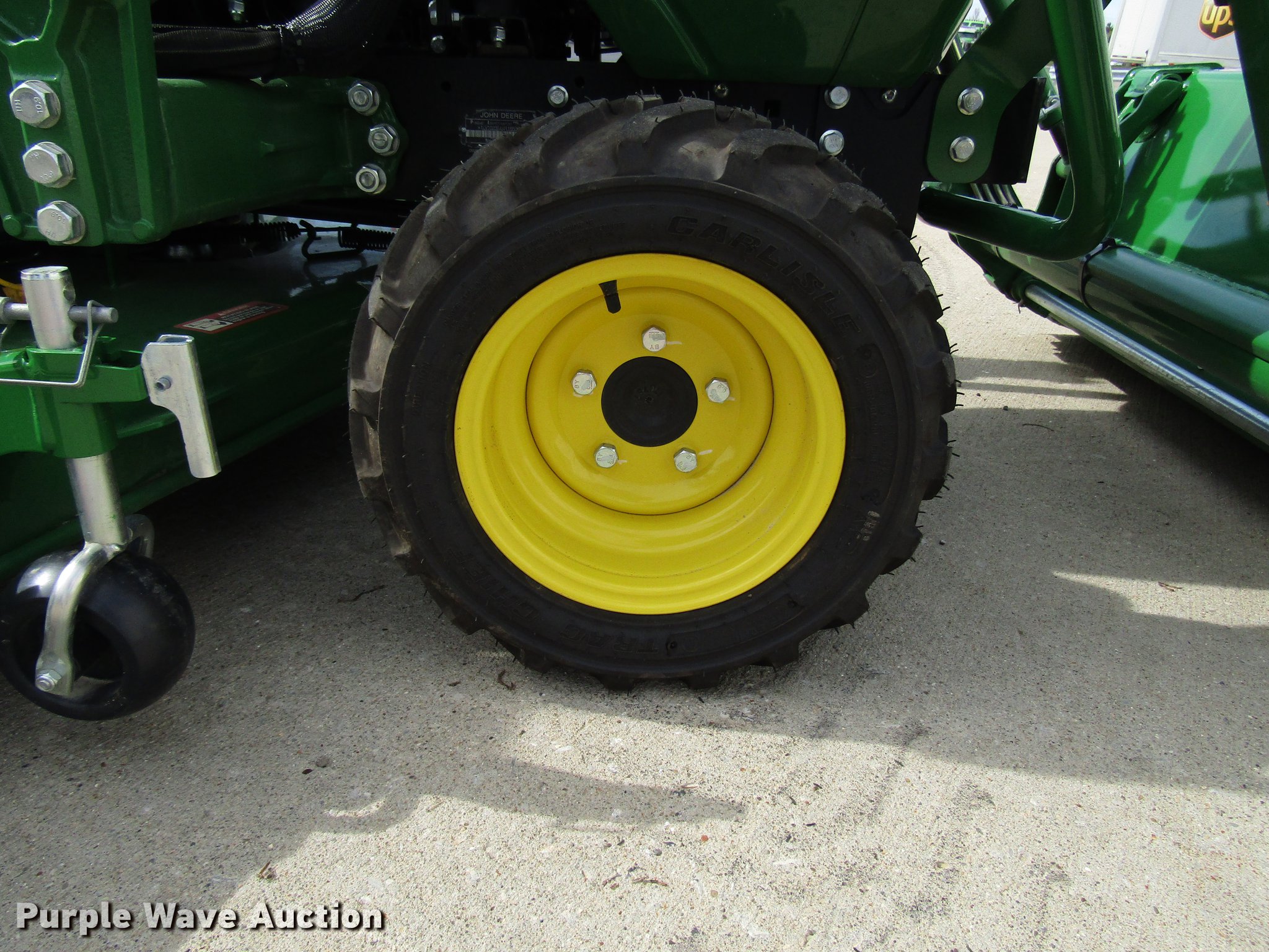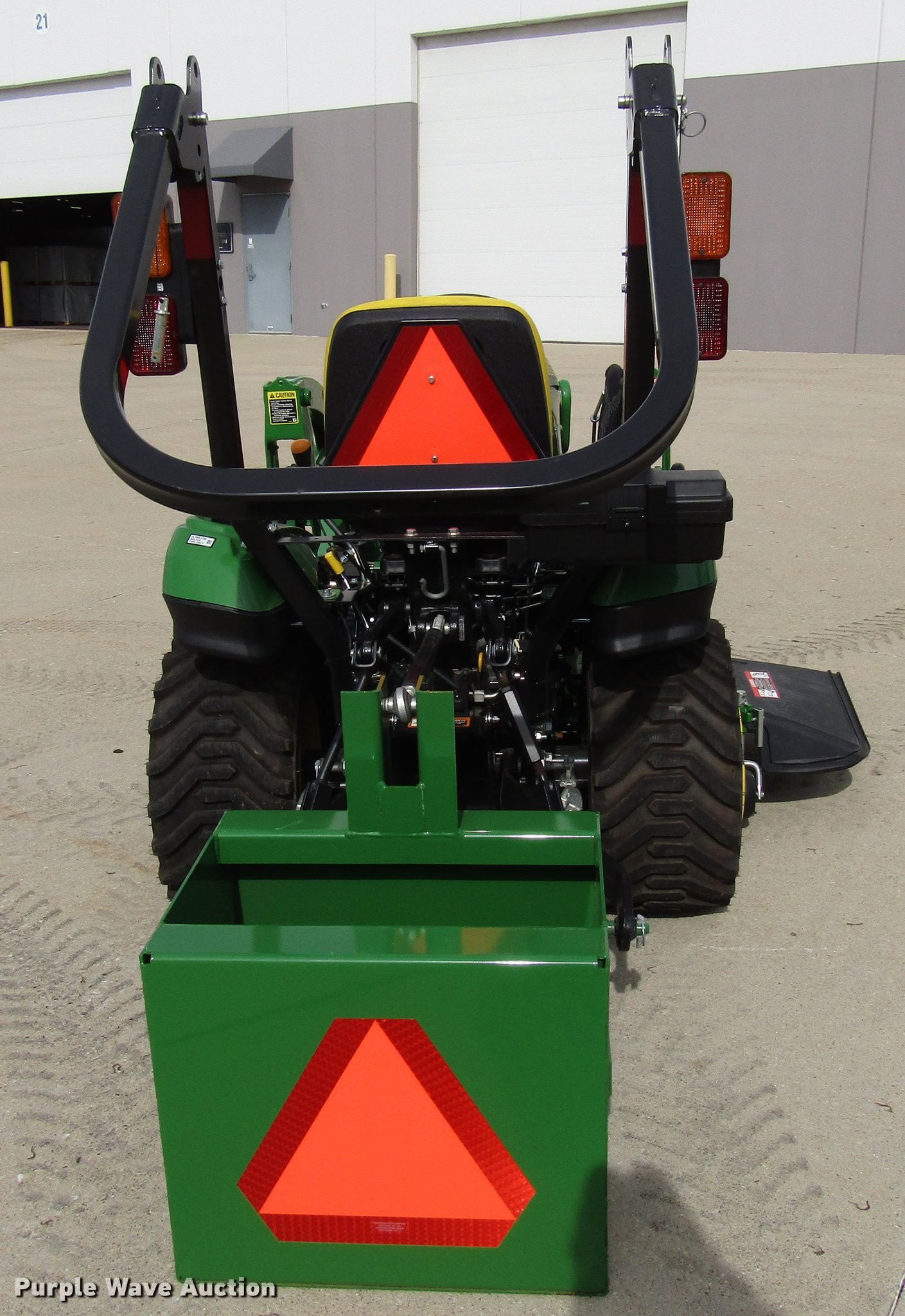Purple Wave is selling a used Tractor in Ohio. This item is a 2018 John Deere 1023E MFWD tractor with the following: 6 hours on meter, Yanmar 3TNM74F-NCJT three cylinder diesel engine, Serial CH3U09D038359, Hydrostatic transmission, 2F-2R gears, Differential lock, John Deere 120R loader, 53"W bucket, Quick attach, Joystick controls, Serial 1P0120RXCHC017337, Three point, Top link, 540 PTO, (2) front hydraulic remote sets, John Deere weight ballast box, Mower deck, Model 60D, 60"W, Serial 1M01060DKHM089729, (2) wheel weights, 58" wheelbase, 215/50-10 front tires, 305/60-12 rear tires, Manufacture basic warranty until 2020, Manufacture power-train warranty until 2024, Serial 1LV1023EJJJ116506