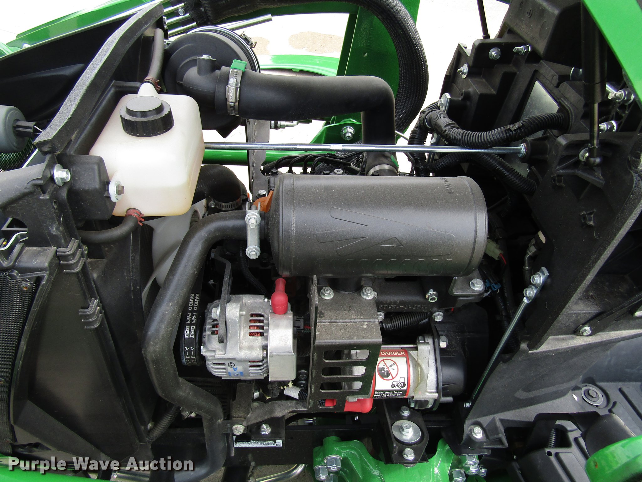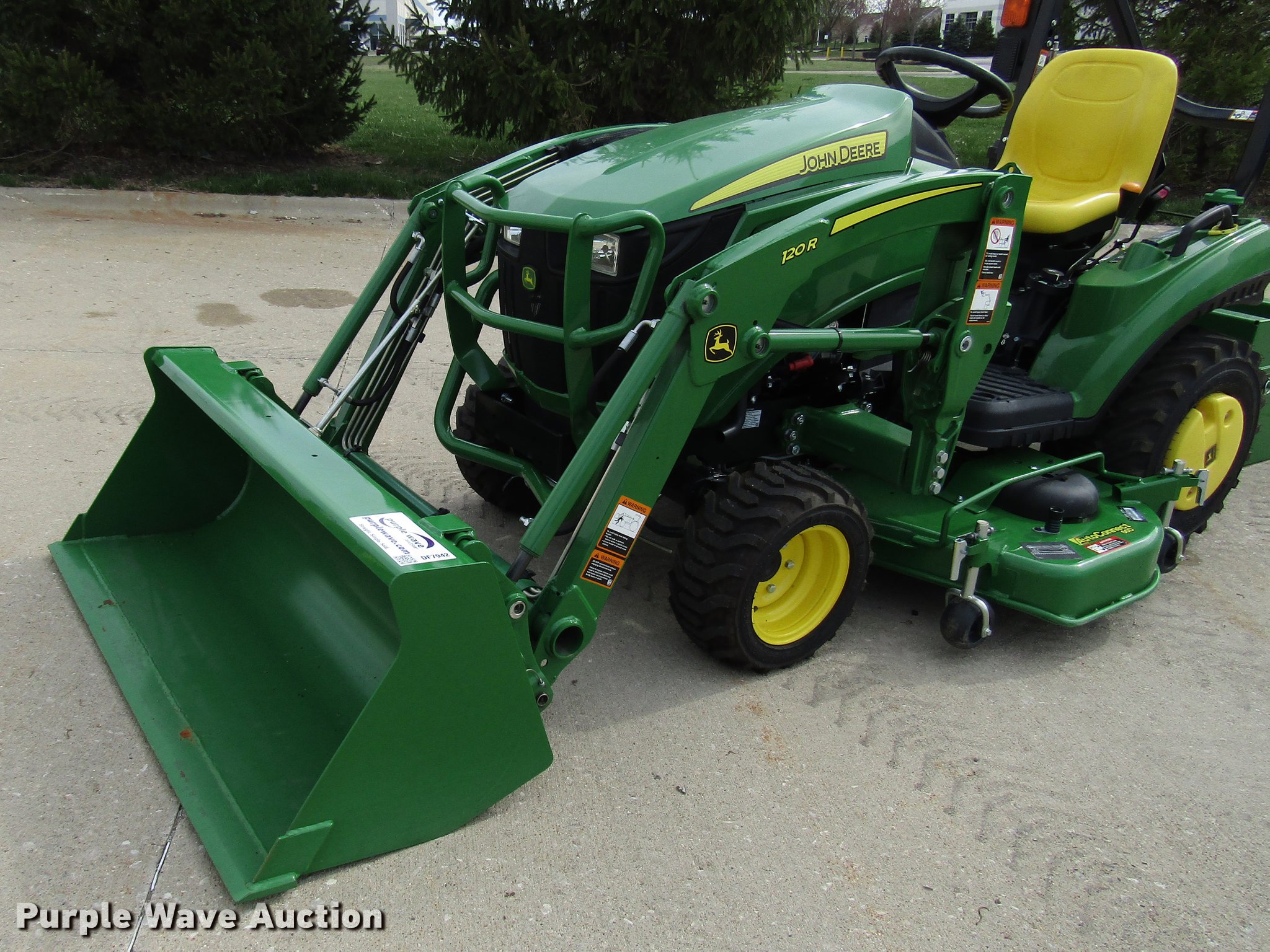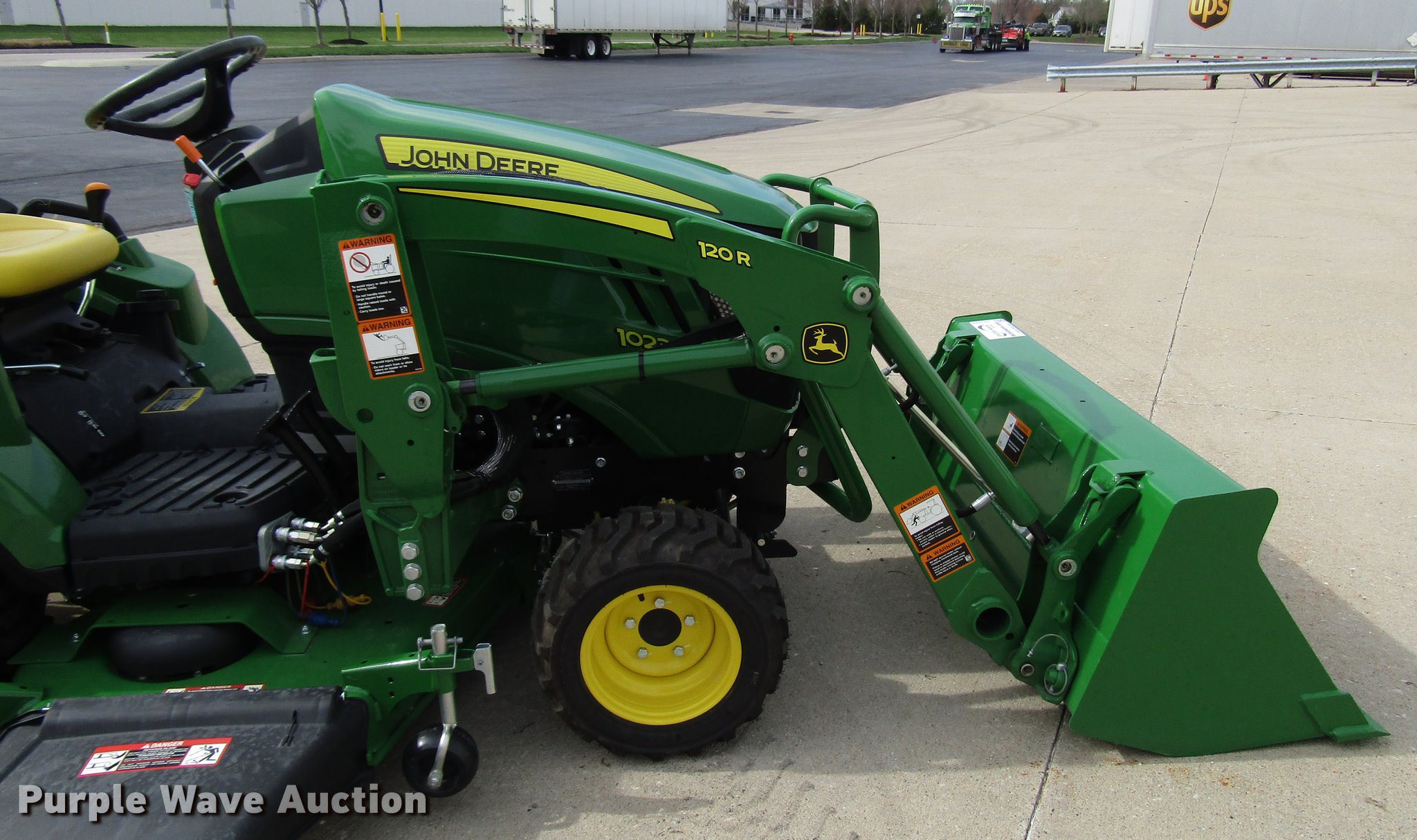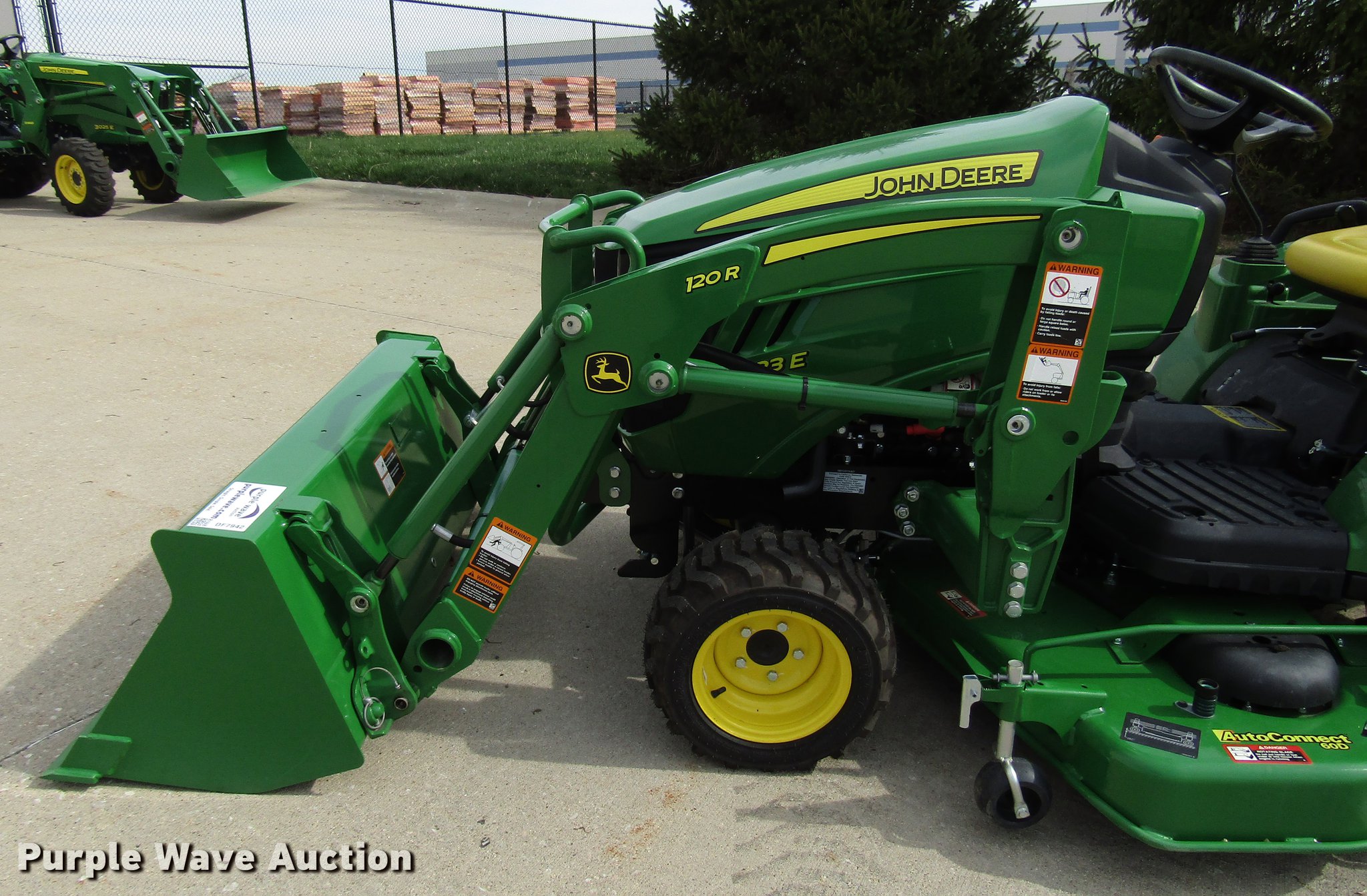 Purple Wave is selling a used Tractor in Ohio. This item is a 2018 John Deere 1023E MFWD tractor with the following: 6 hours on meter, Yanmar 3TNM74F-NCJT three cylinder diesel engine, Serial CH3U09D038359, Hydrostatic transmission, 2F-2R gears, Differential lock, John Deere 120R loader, 53"W bucket, Quick attach, Joystick controls, Serial 1P0120RXCHC017337, Three point, Top link, 540 PTO, (2) front hydraulic remote sets, John Deere weight ballast box, Mower deck, Model 60D, 60"W, Serial 1M01060DKHM089729, (2) wheel weights, 58" wheelbase, 215/50-10 front tires, 305/60-12 rear tires, Manufacture basic warranty until 2020, Manufacture power-train warranty until 2024, Serial 1LV1023EJJJ116506