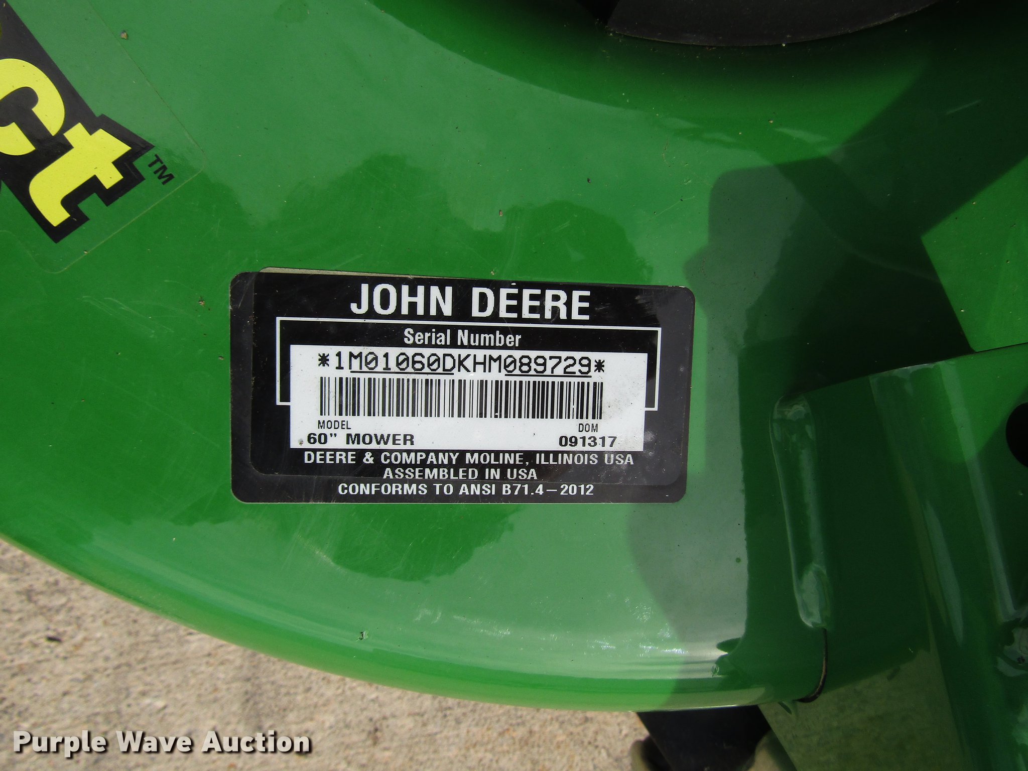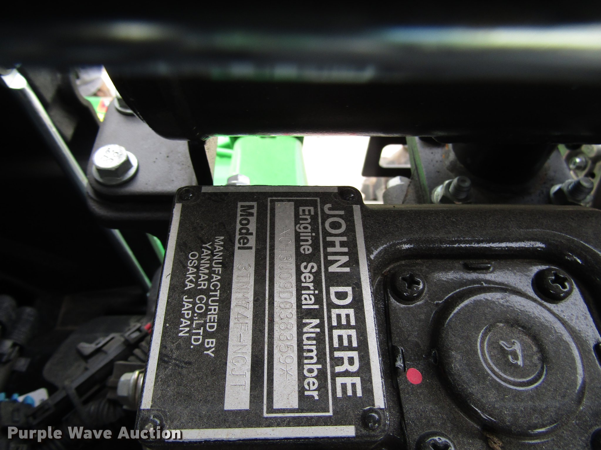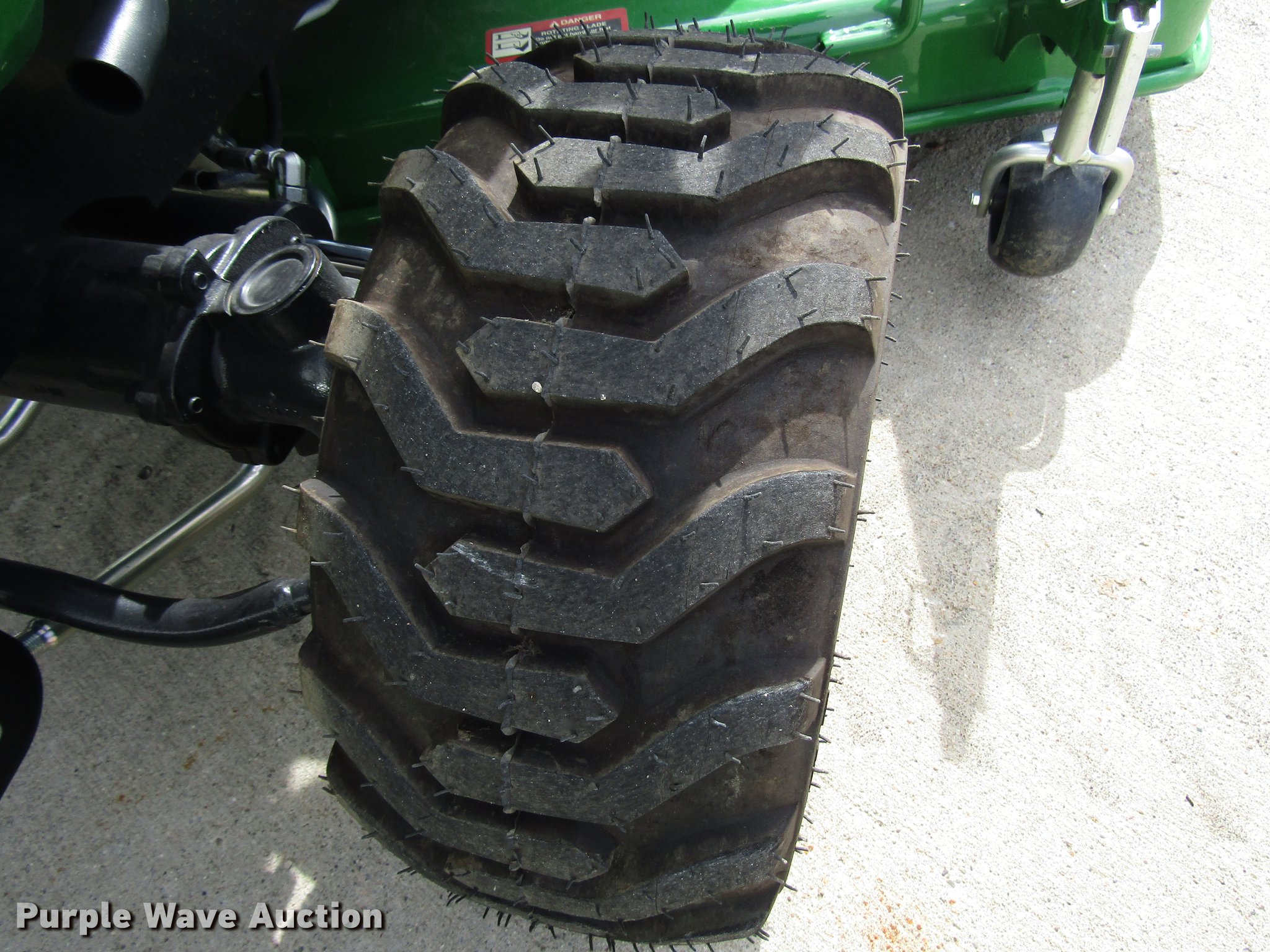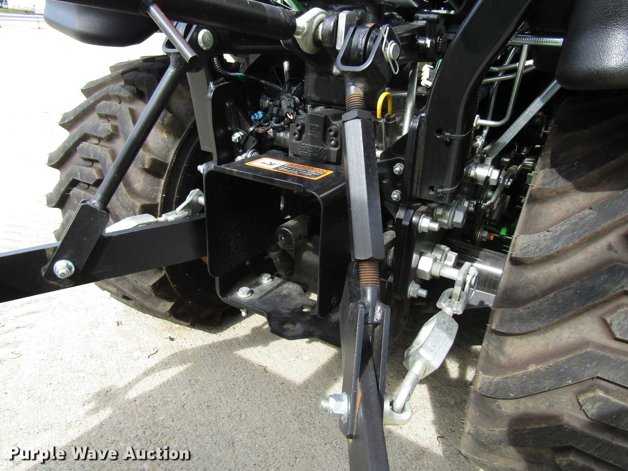 2018 John Deere 1023E MFWD tractor. 6 hours on meter, Yanmar 3TNM74F-NCJT three cylinder diesel engine Serial CH3U09D038359, Hydrostatic transmission 2F-2R gears, Differential lock, John Deere 120R loader 53"W bucket, Quick attach, Joystick controls, Serial 1P0120RXCHC017337, Three point Top link, 540 PTO, (2) front hydraulic remote sets, John Deere weight ballast box, Mower deck Model 60D, 60"W, Serial 1M01060DKHM089729, (2) wheel weights, 58" wheelbase, 215/50-10 front tires, 305/60-12 rear tires, Manufacture basic warranty until 2020, Manufacture power-train warranty until 2024, Serial 1LV1023EJJJ116506. Kubota Tractor Corp. 6300 1 Kubota Way. Groveport, OH 44057