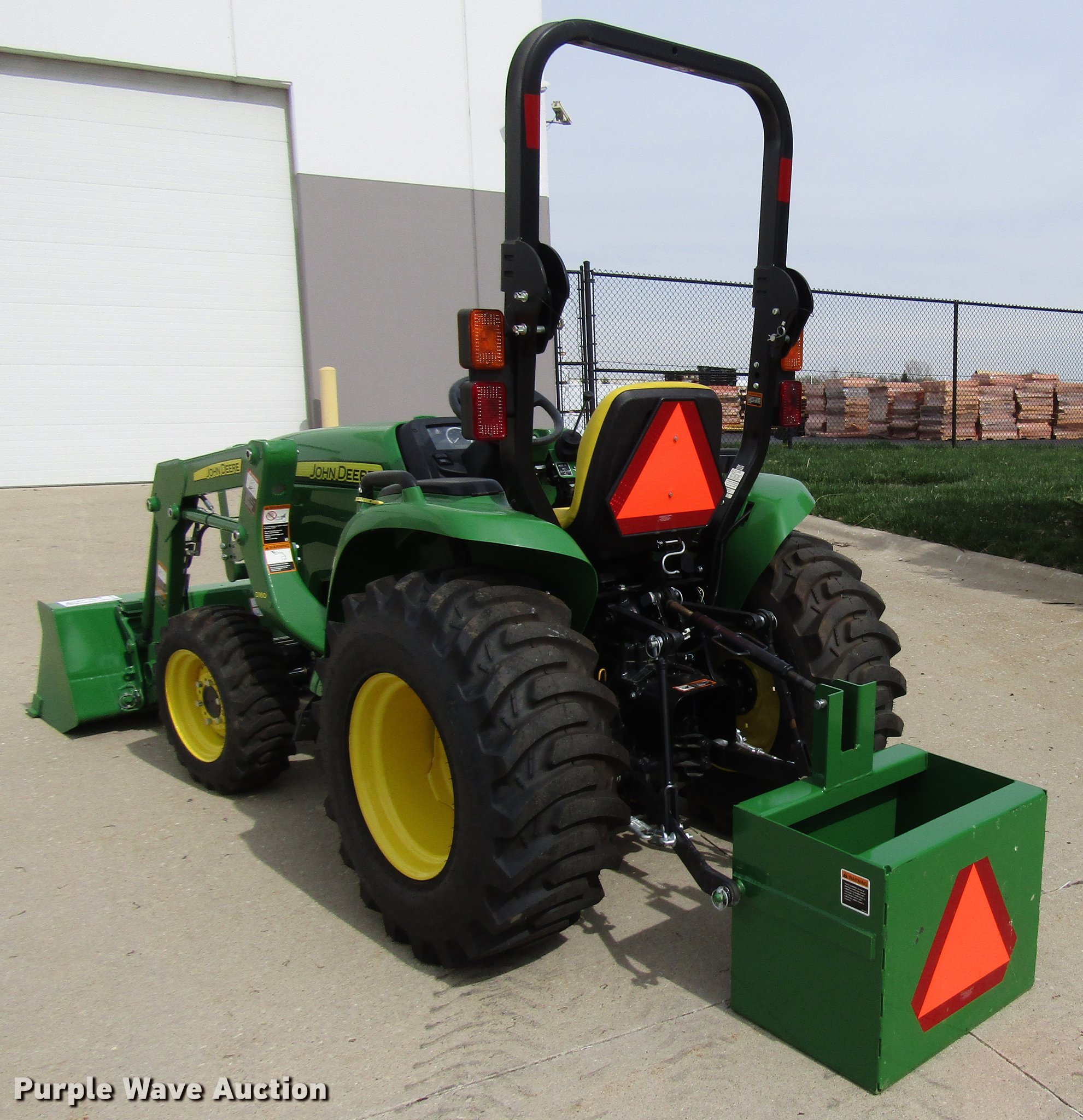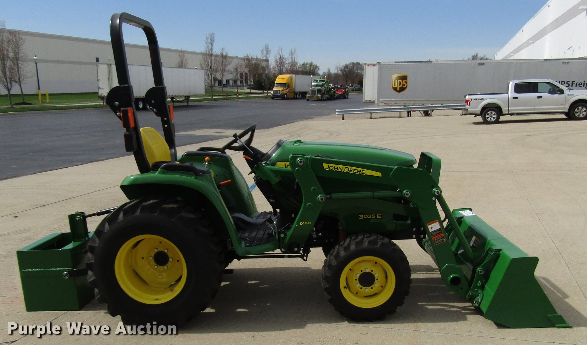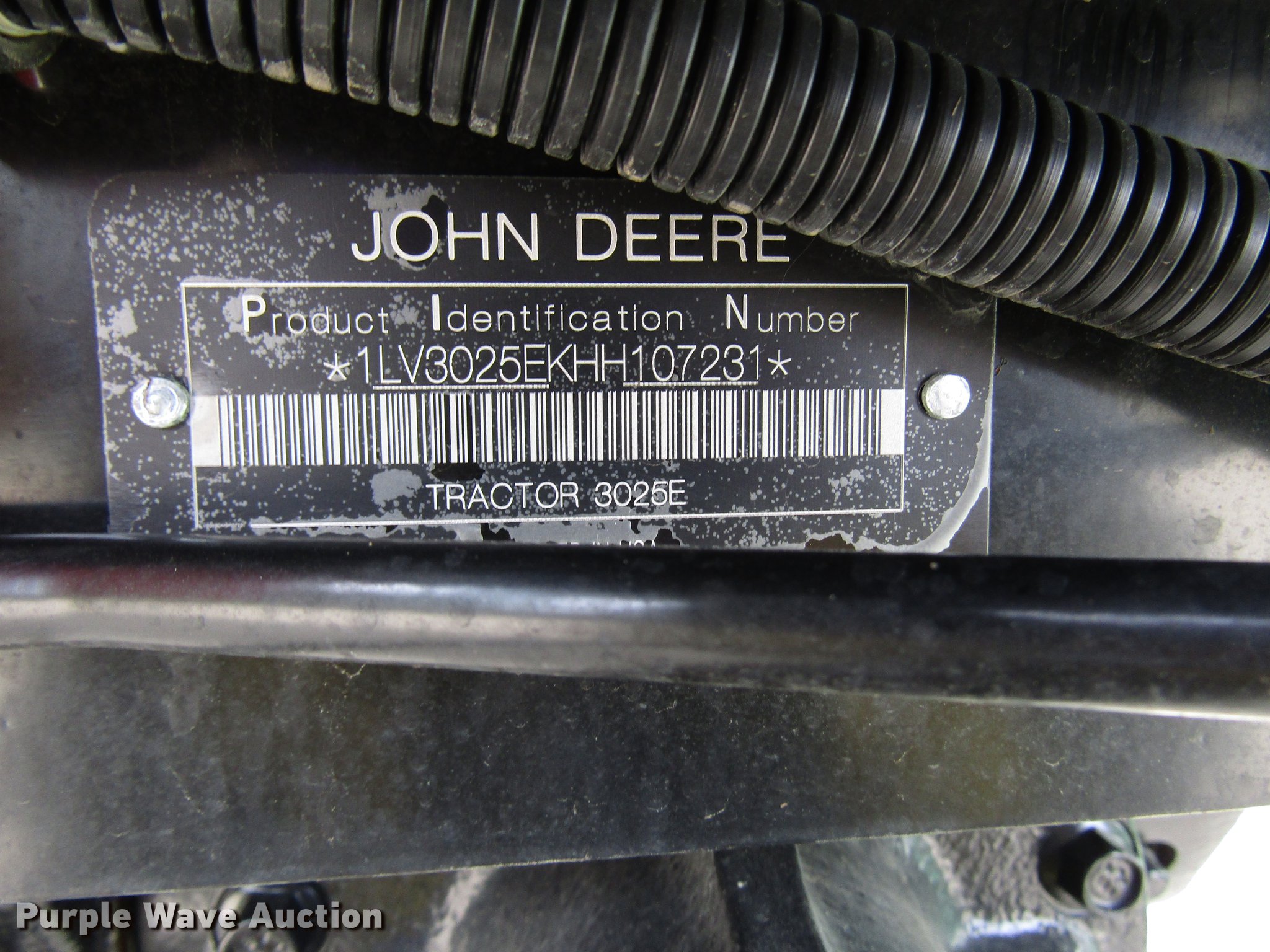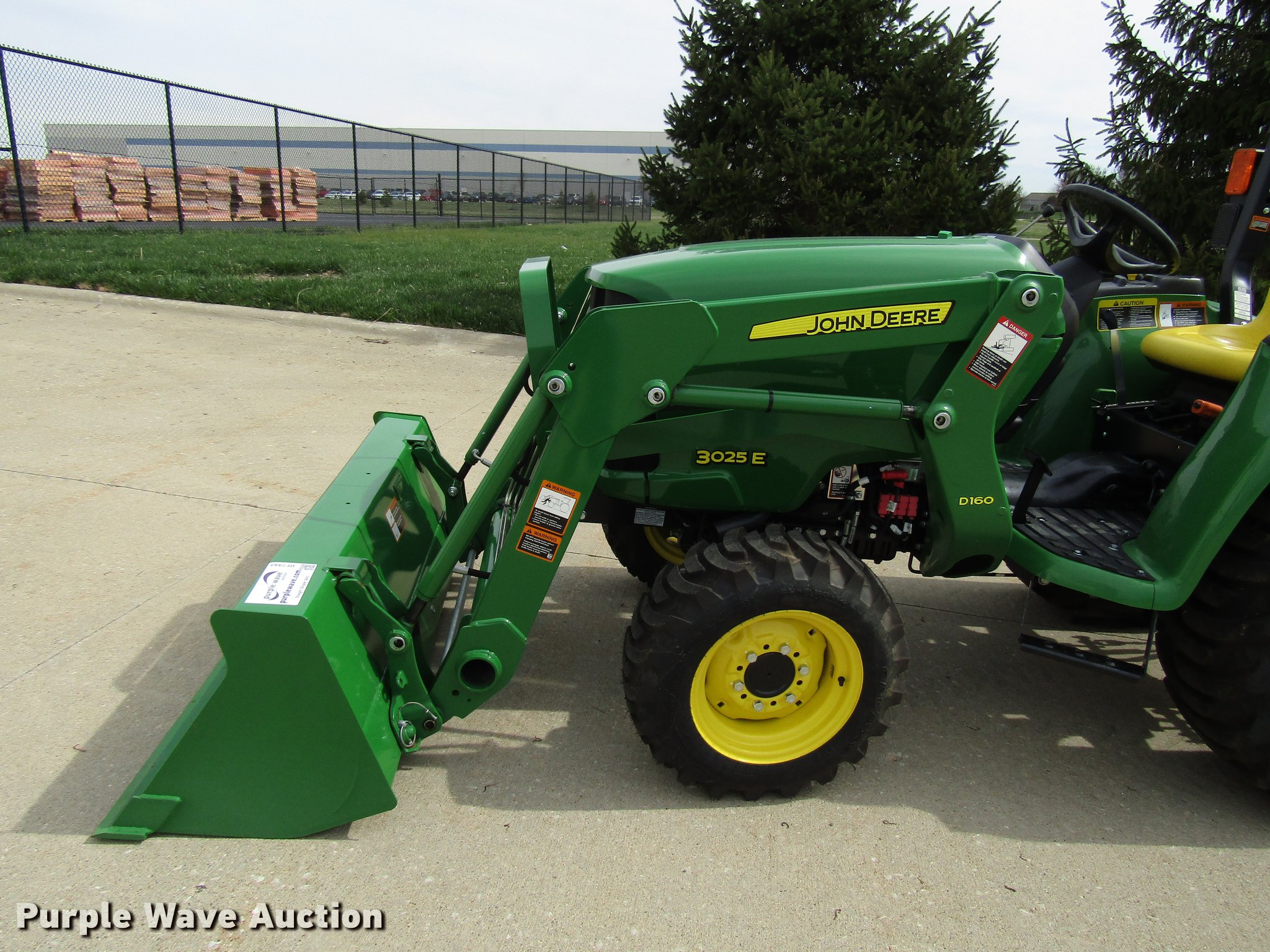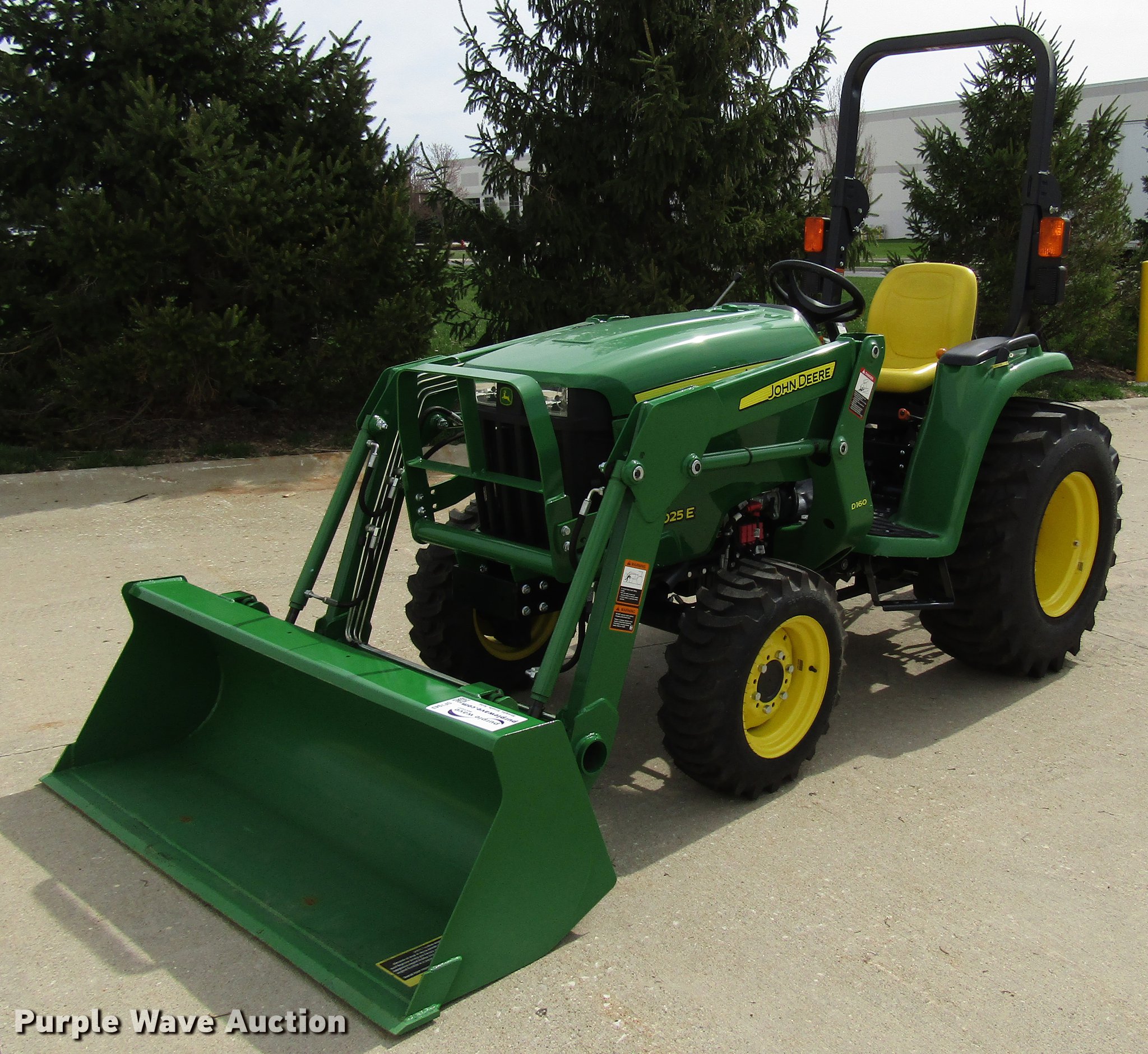 Purple Wave is selling a used Tractor in Ohio. This item is a 2017 John Deere 3025E MFWD tractor with the following: 9 hours on meter, Yanmar 3TNV88F-EPJT1 1.6L three cylinder diesel engine, Serial CH3N17D007434, Hydrostatic transmission, 2F-2R gears, Differential lock, John Deere D160 loader, 61"W bucket, Quick attach, Joystick controls, Serial 1P0D160XHHX046321, Three point, 540 PTO, (2) front hydraulic remote sets, John Deere weight ballast box, 60" wheelbase, 25x8.50-14 front tires, 15-19.5 rear tires, Serial 1LV3025EKHH107231