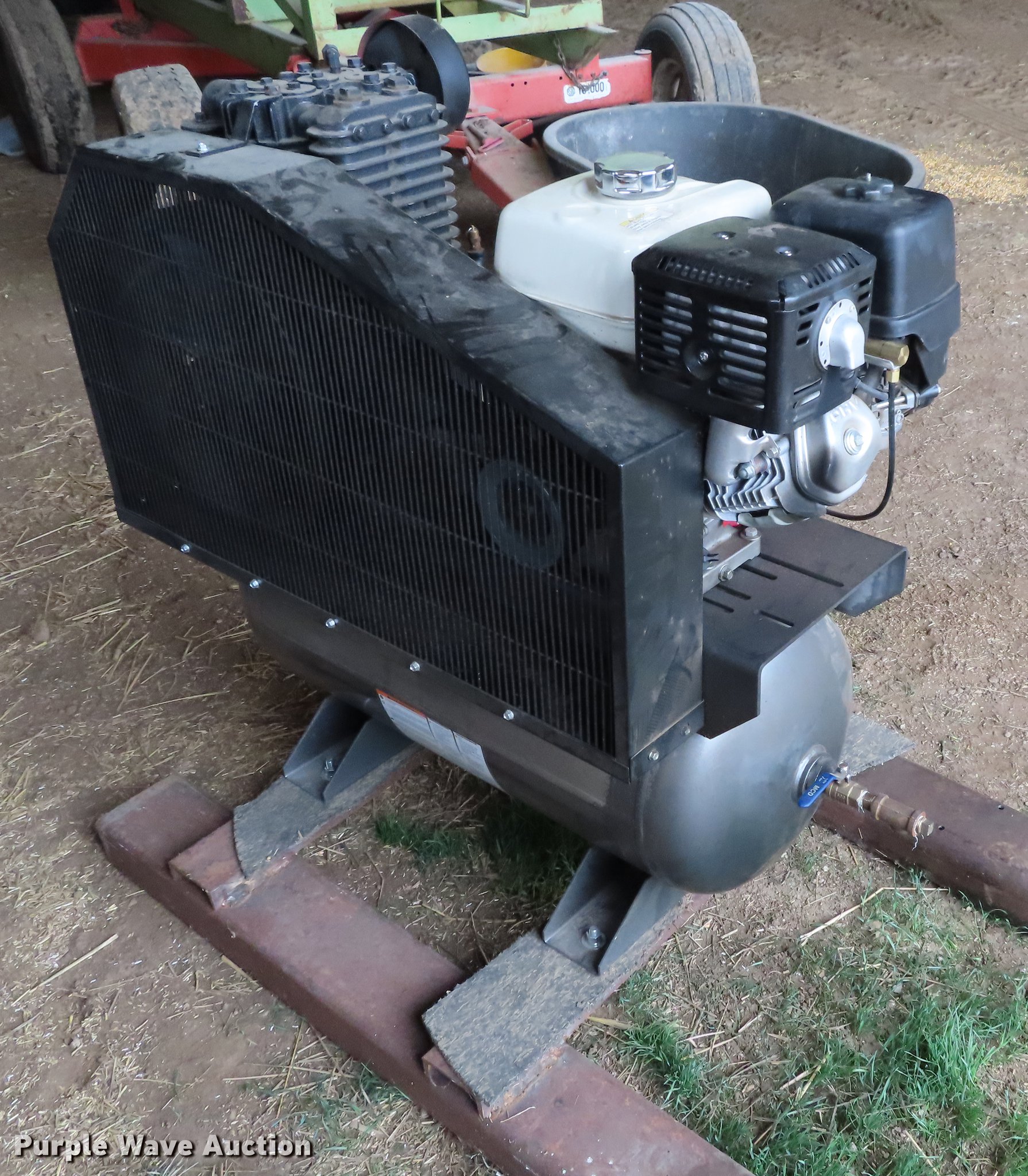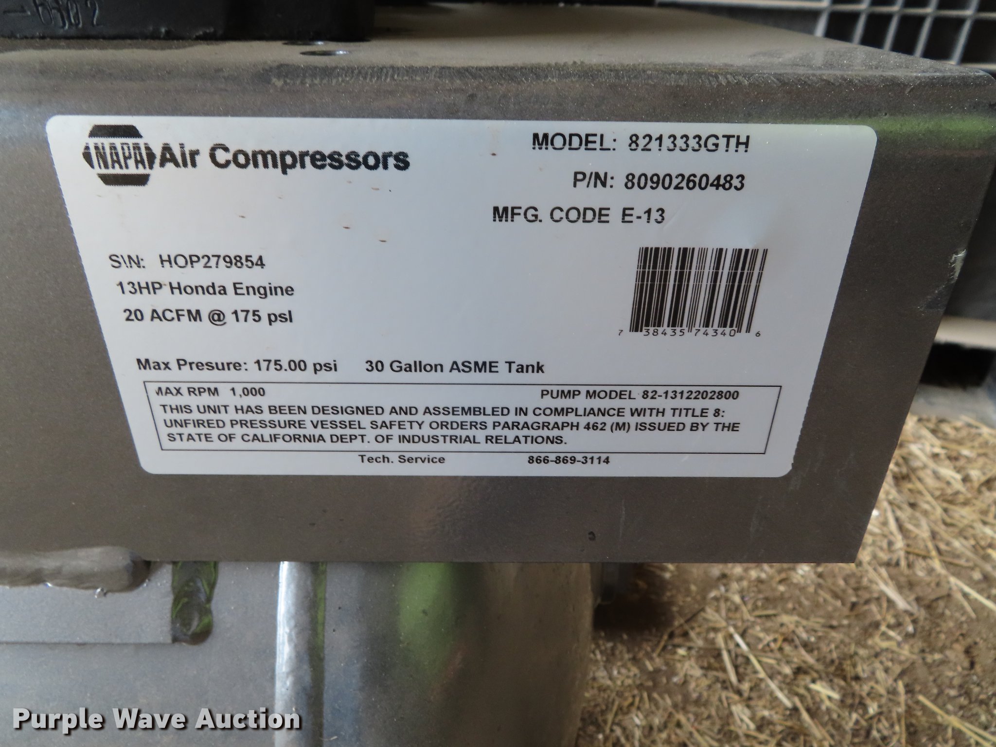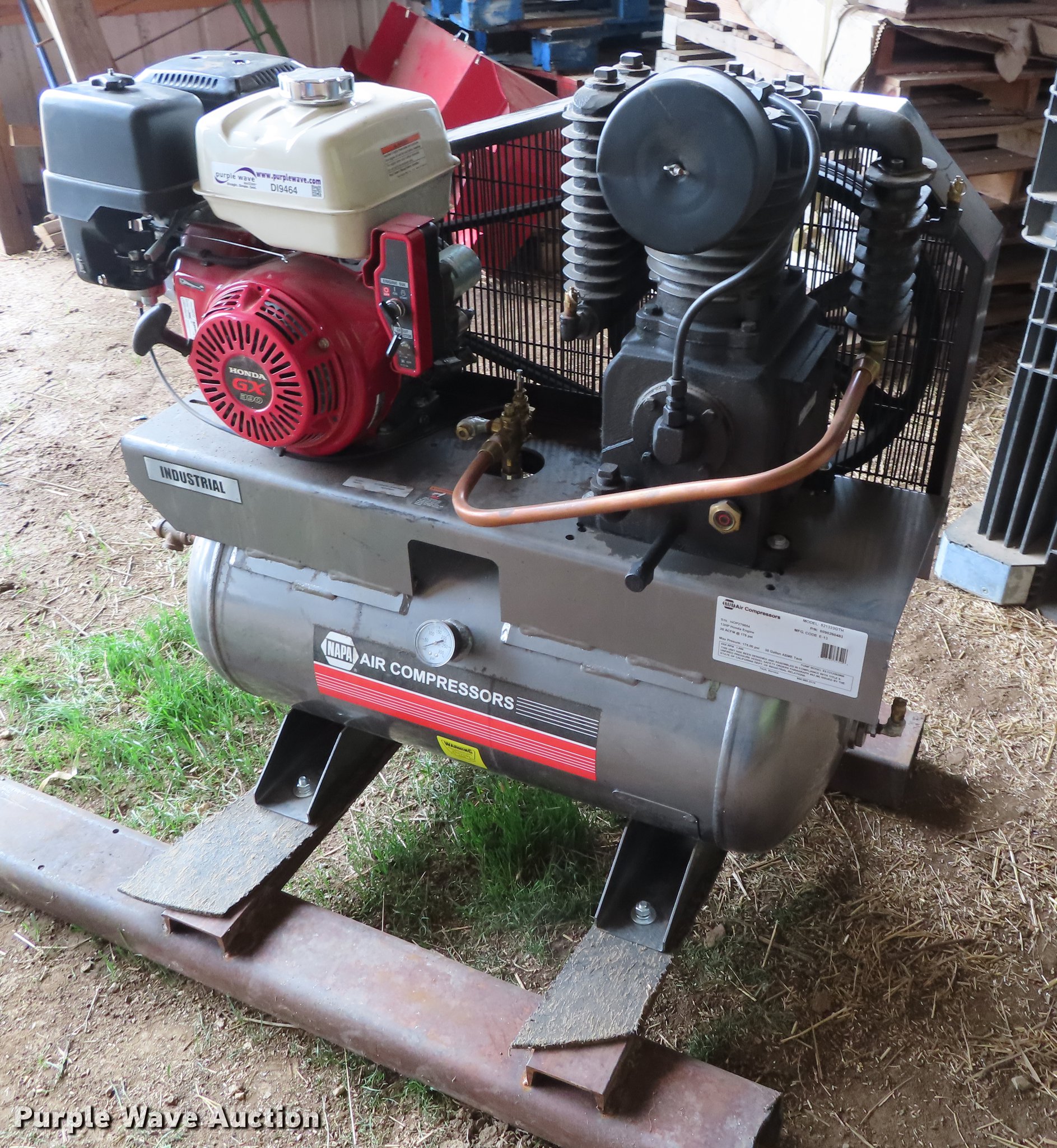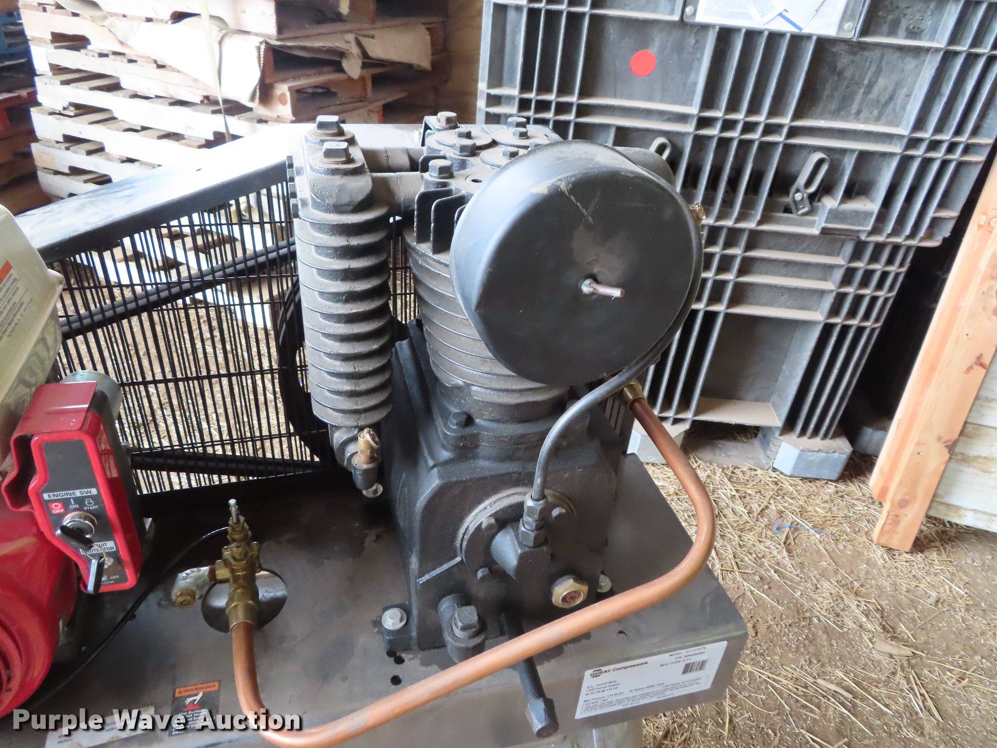 Purple Wave is selling a used Air Compressor in Kansas. This item is a Napa 821333GTH air compressor with the following: Honda gas engine, 13 HP, 20 acfm at 175 psi, 30 gallon tank