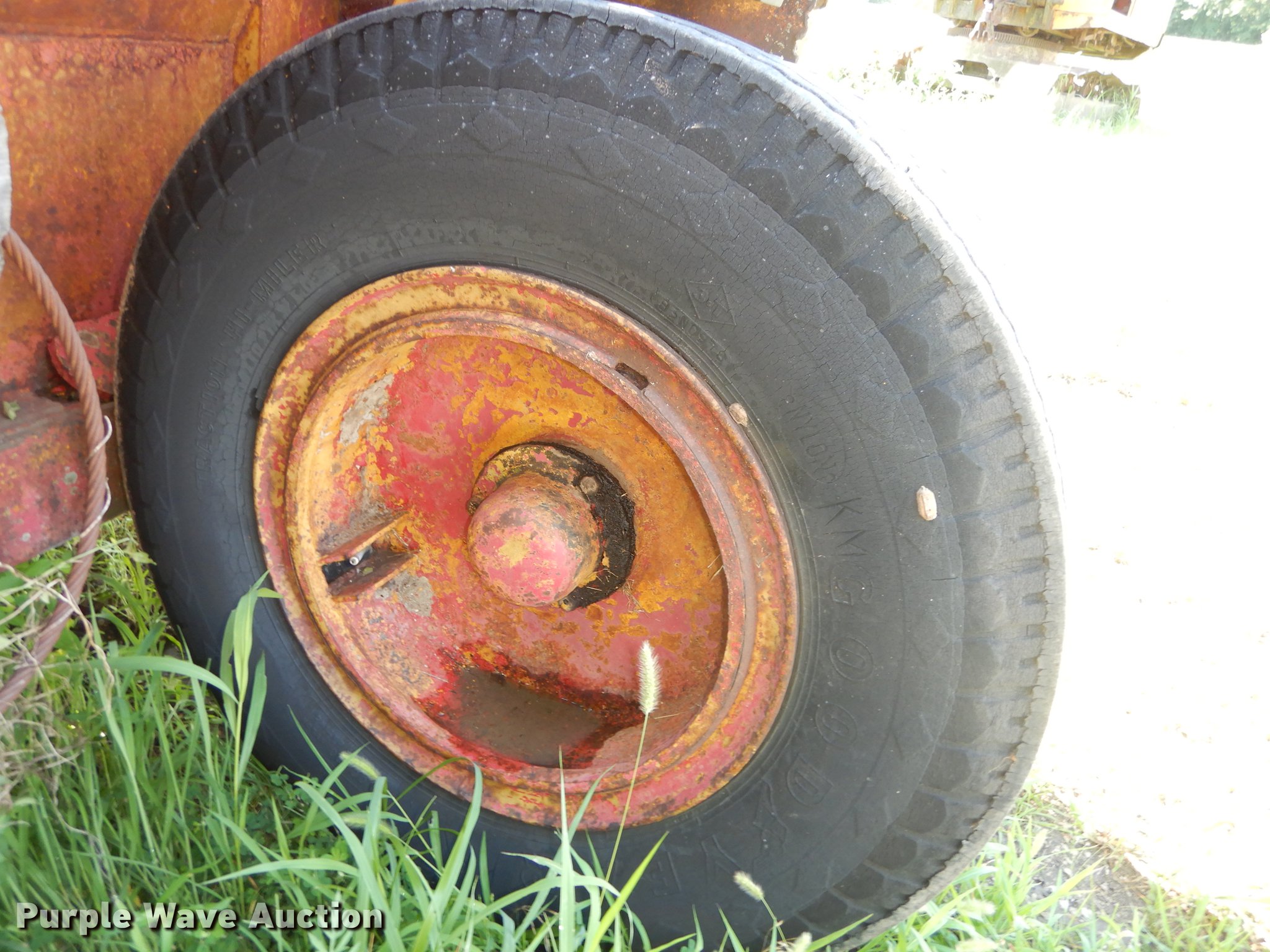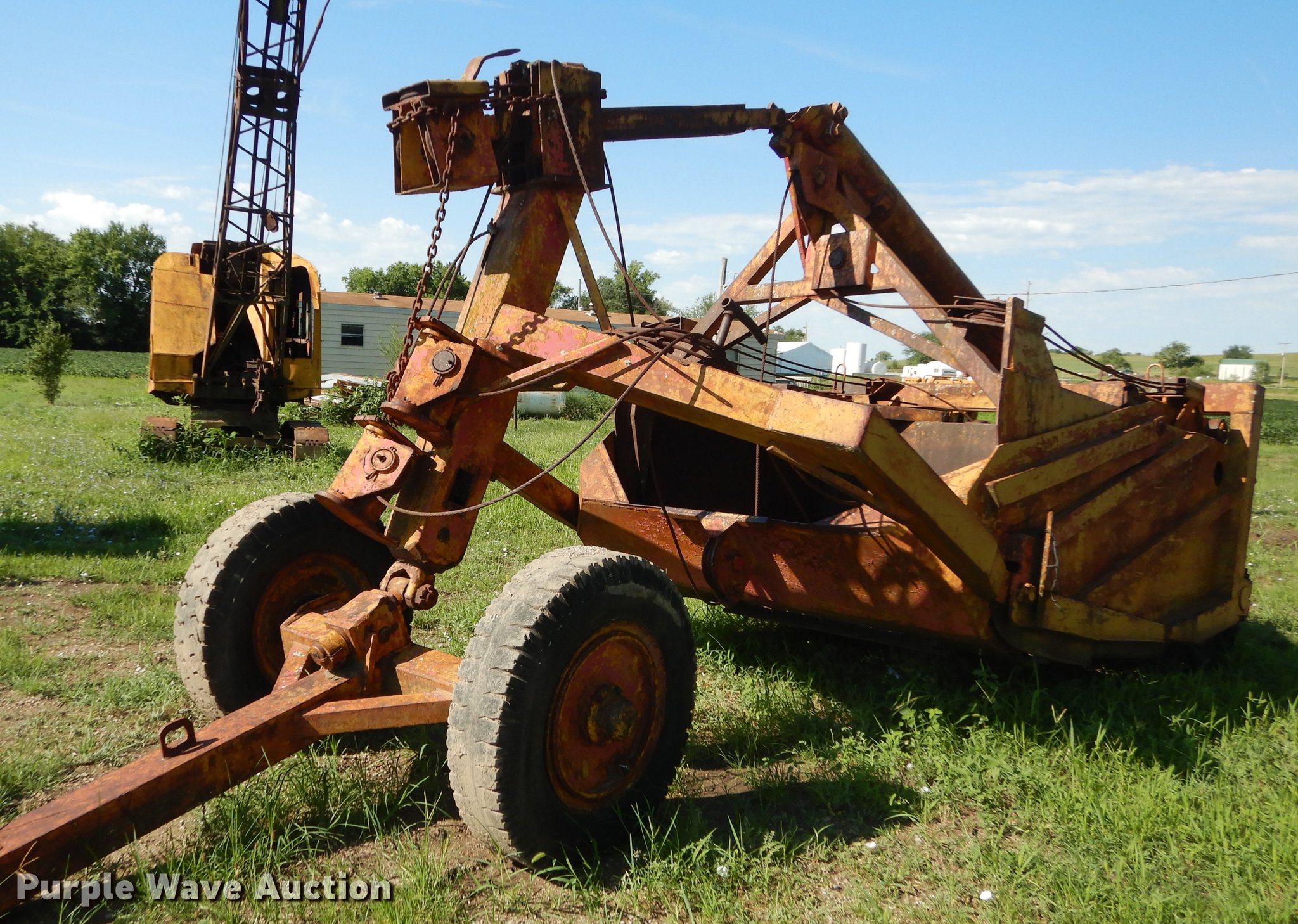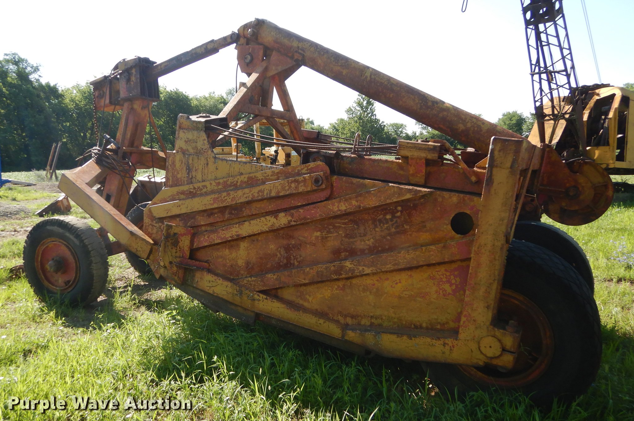 Purple Wave is selling a used Pull Type Scraper in Kansas. This item is a R.G. LeTourneau M cable scraper with the following: Eight cubic yard capacity, Adjustable cutting edge, Convertible to ripper, Pin hitch, Goodyear 10.00-20 tires, Lip base cracked, Serial JR6G
