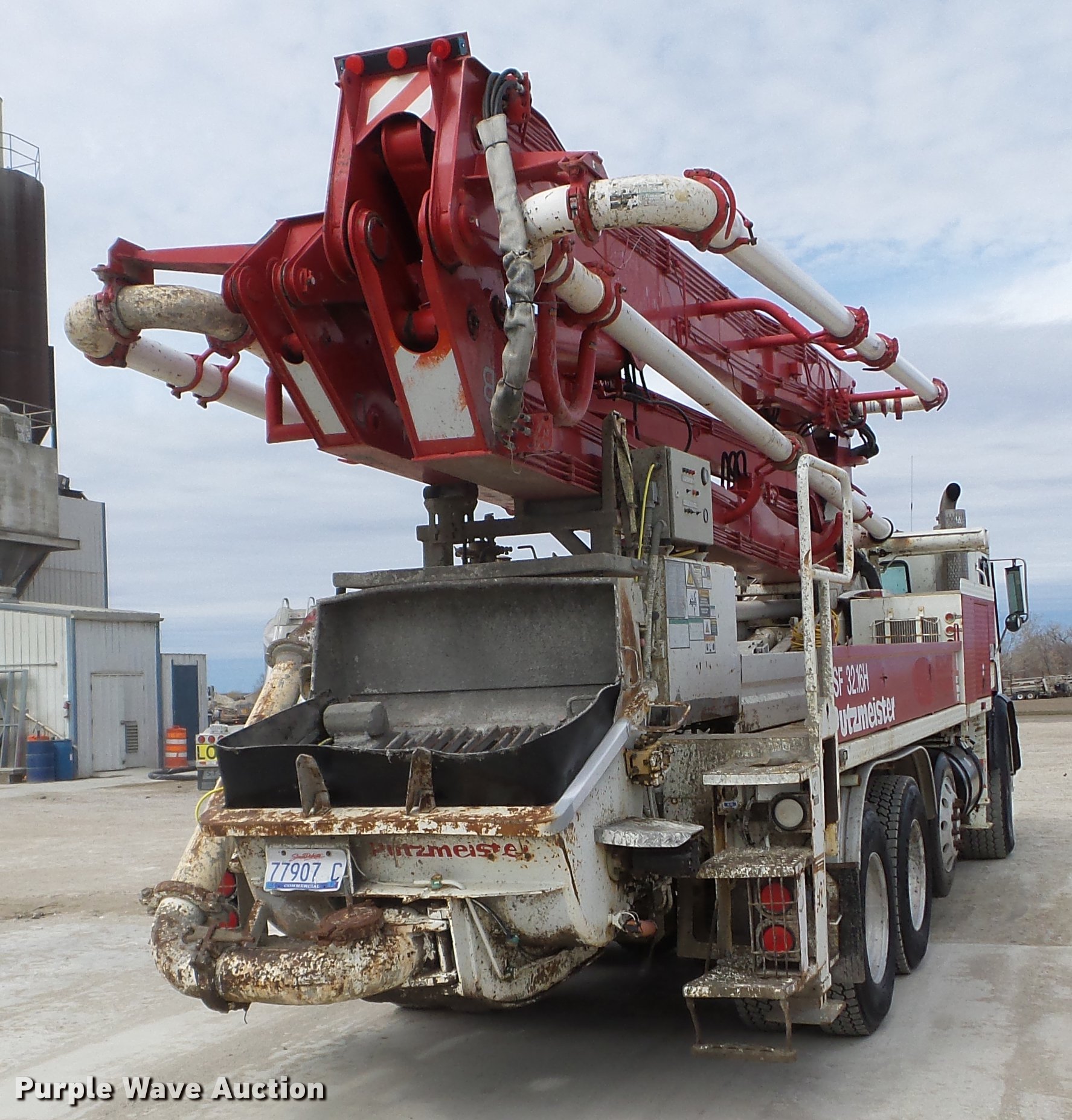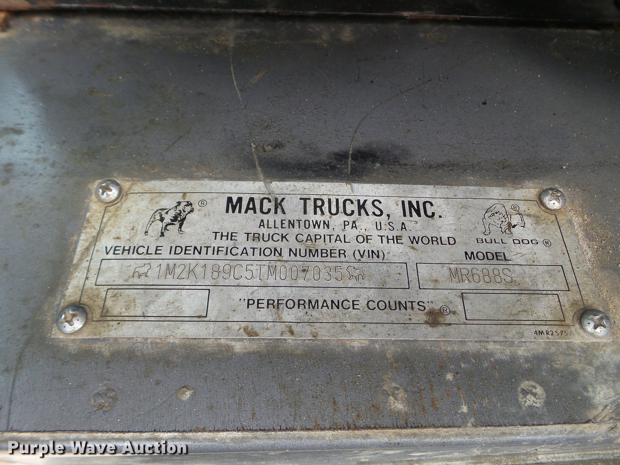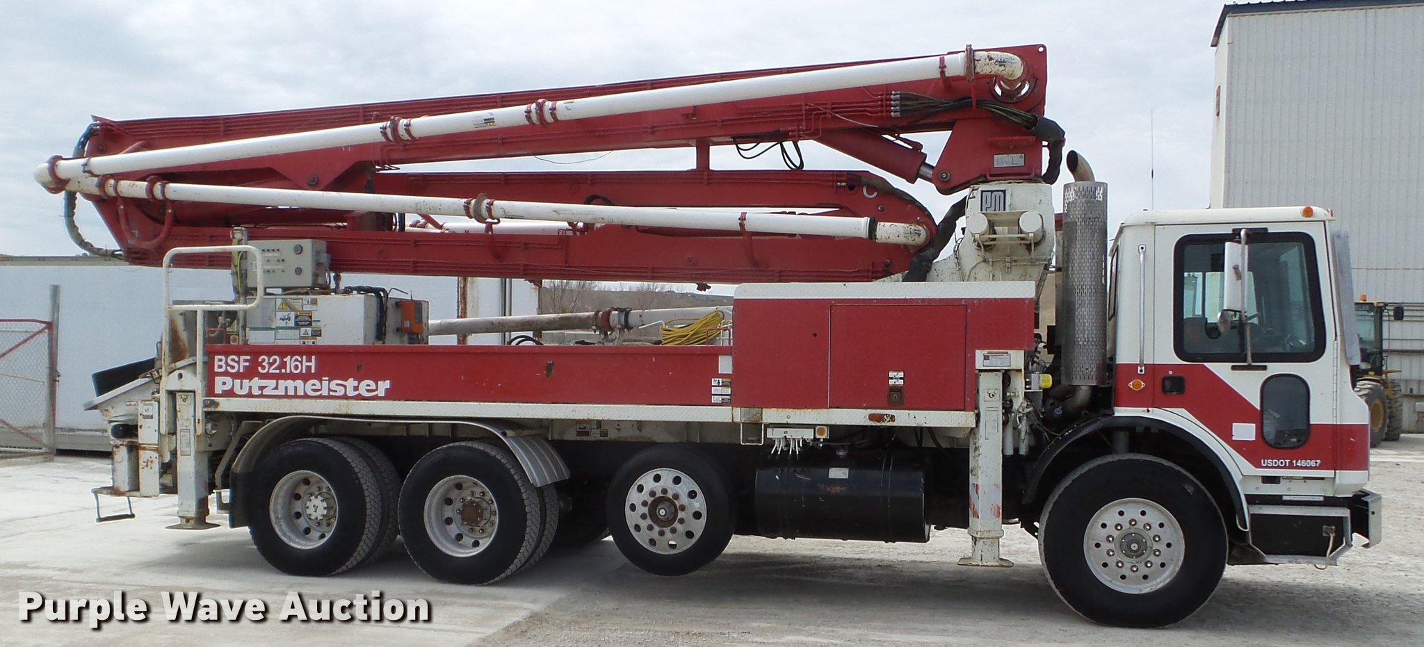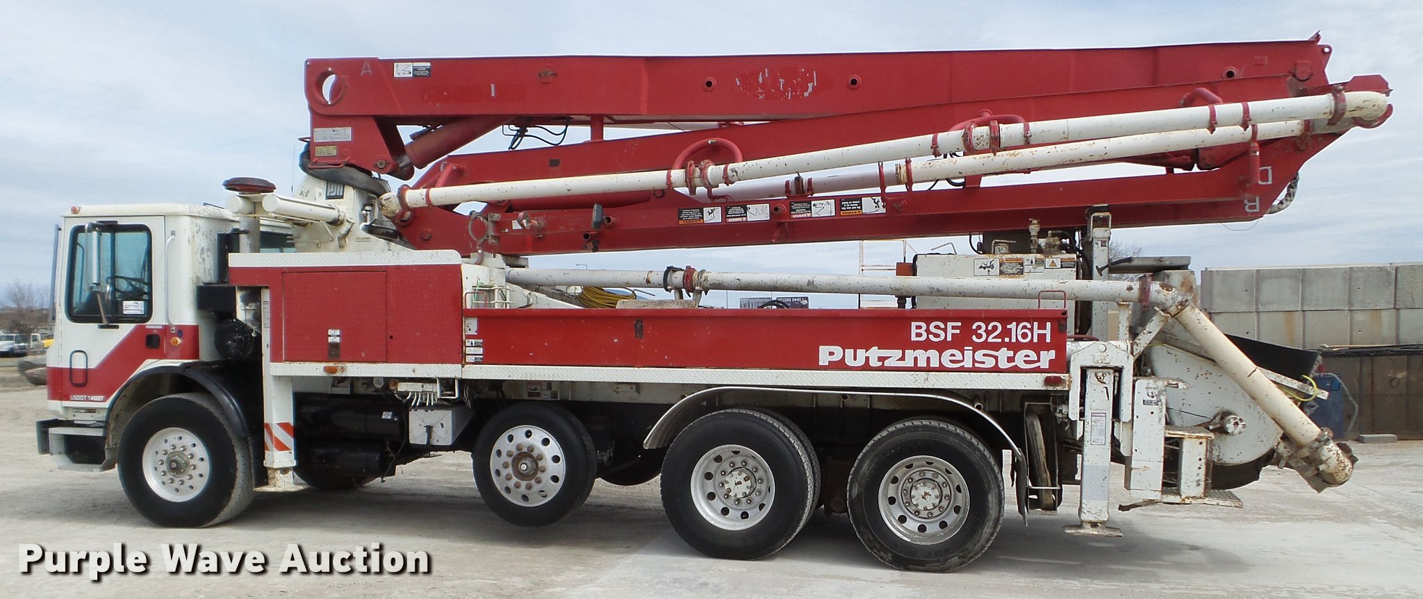 Purple Wave is selling a used Ready Mix or Pump Truck in South Dakota. This item is a 1996 Mack MR688S pump truck with the following: 447,216 miles on odometer, 15,702 hours on meter, Mack 12.0L L6 diesel engine, Nine speed manual transmission, Tandem axle, Air lift tag axle, Inter-axle differential lock, AC and heat, PTO, Putzmeister BSF32.16H concrete pump bed, Model M32 boom, 6" diameter discharge pipe, Roller fold boom, 150 yph output, Remote, Serial 67960632033, (4) stabilizers, Single fuel tank, Walking beam suspension, Air brakes, 425/85R22.5 front tires, 255/70R22.5 tag axle tires, 11R22.5 rear tires, Pump needs resealed