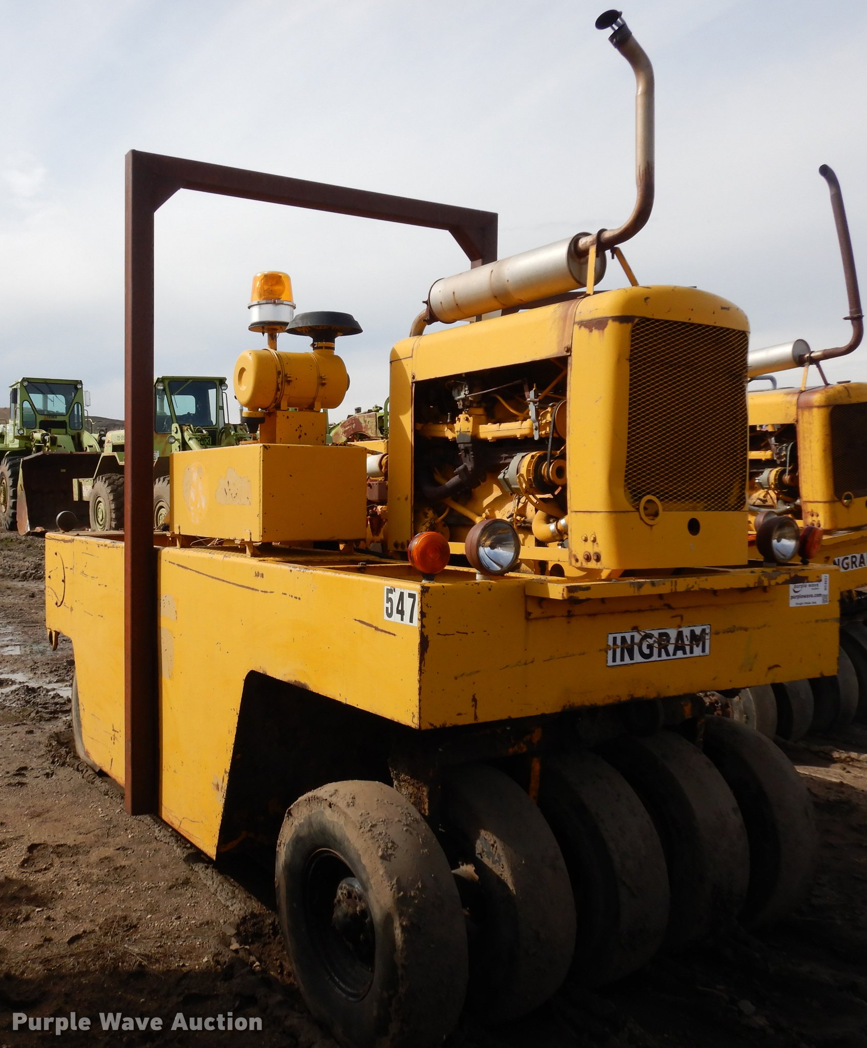 Purple Wave is selling a used Pneumatic Roller in South Dakota. This item is a Ingram 9-2800-P pneumatic roller with the following: 2,137 hours on meter, Ford four cylinder gas engine, Hydrostatic transmission, Suspension seat, Work lights, Front and rear tire scrapers, (9) 7.50-15 tires, Serial 516686P125, Unit# 547