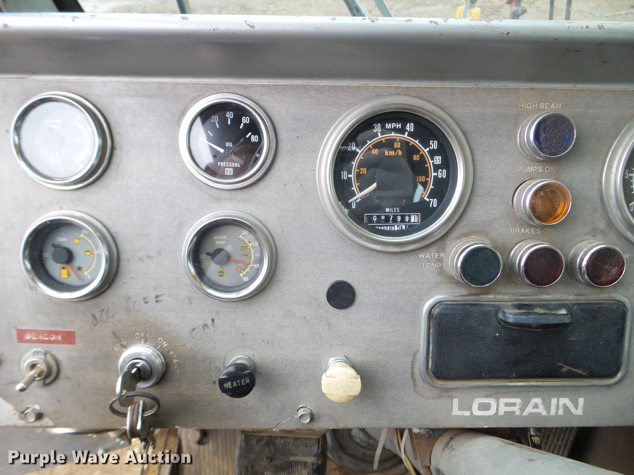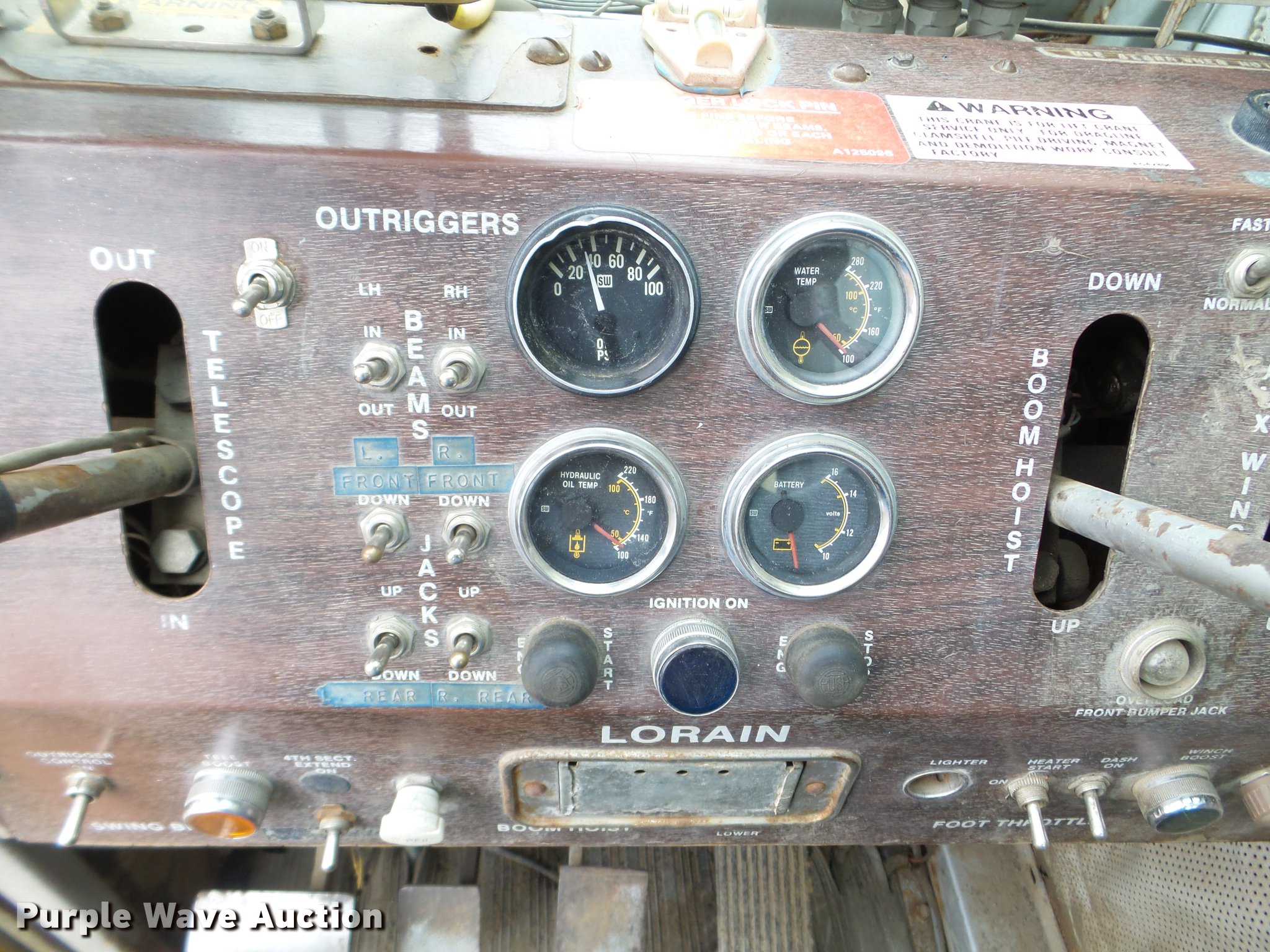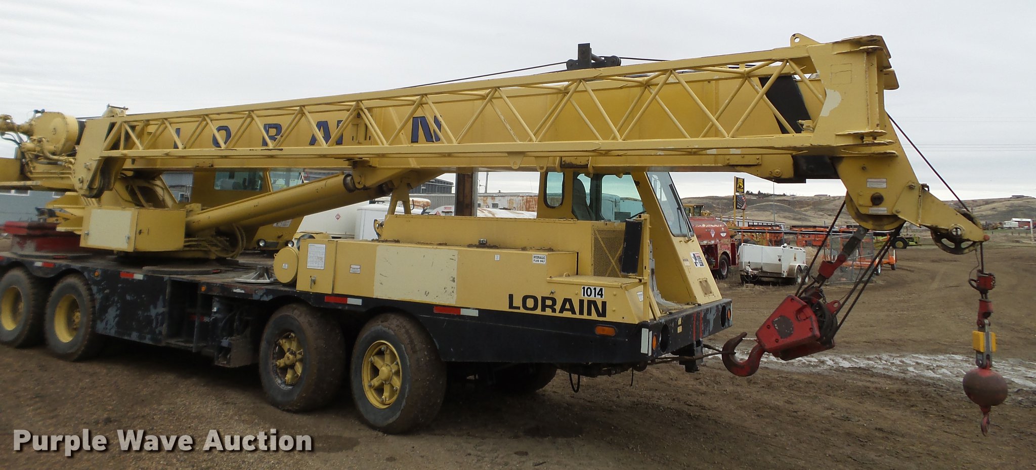 Purple Wave is selling a used Truck Crane in South Dakota. This item is a 1983 Koehring Lorain MCH 400 crane with the following: Cummins six cylinder diesel engine, Eight speed manual transmission, Tandem axle, (4) axles, (2) drive wheels, Heat, Stick crane controls, Work lights, Telescopic boom, 84' boom length, 32'L jib, Three boom sections, 80,000 lbs maximum lift capacity, 117' maximum tip height, (2) winches, In-cab boom controls, Crane block, Crane ball and hook, Crane smart load monitor, (4) stabilizers, Spring over walking beam suspension, Air brakes, 385/65R22.5 front tires, 12R22.5 rear tires, Unit# 1014