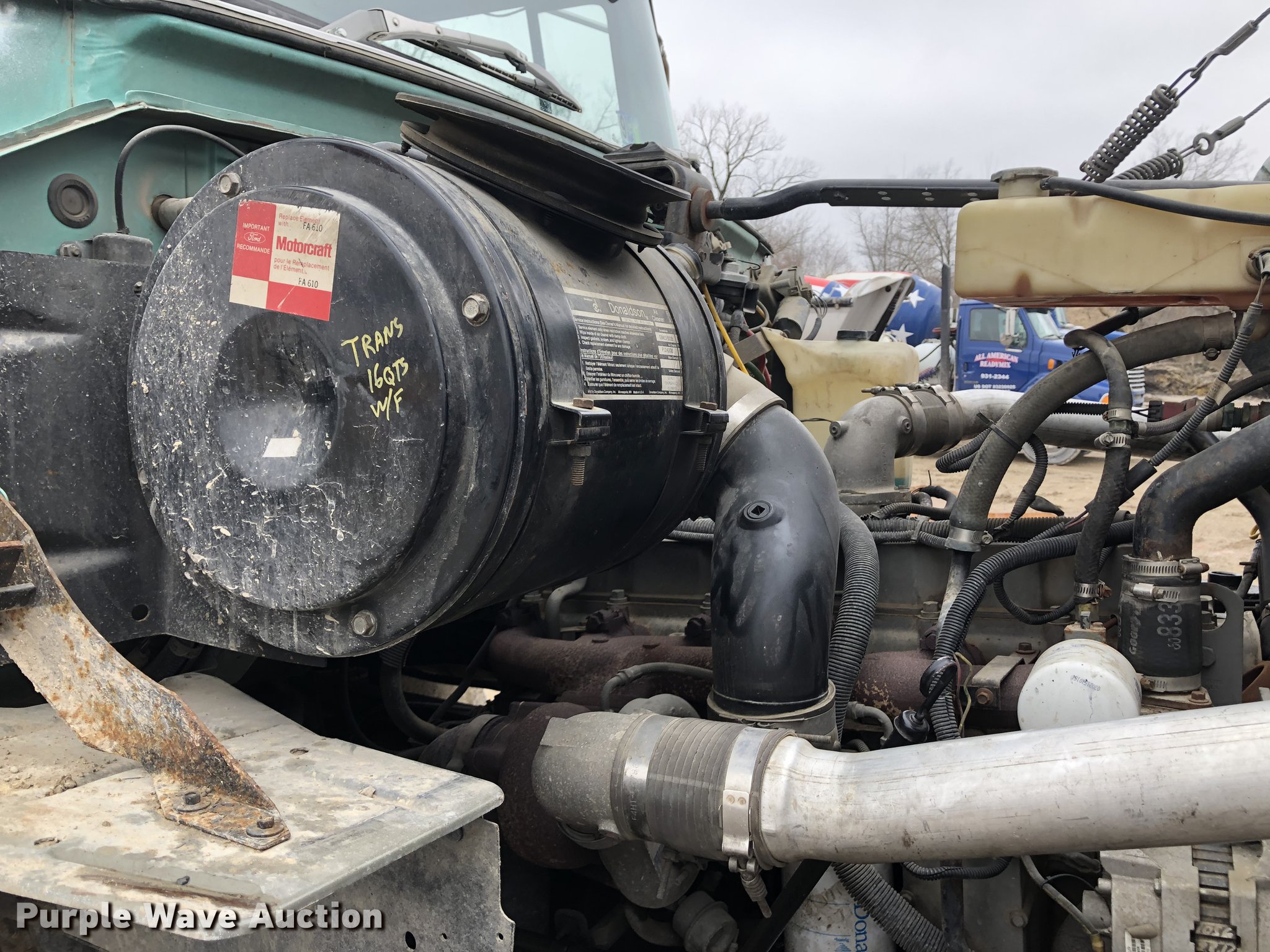 1994 Ford LTS8000 dump truck. 80,861 miles on odometer, 7,137 hours on meter, Cummins 8.3L L6 diesel engine Serial 44993044, Automatic transmission, Tandem axle, Inter-axle differential lock, Heat, Cruise, AM/FM, Suspension seat, Trailer brake controller, PTO, Exterior visor, Aristocrat 214217 steel dump bed 15'L x 8'W, 48" side height, 6" side board height, Single ram hoist, Air operated end gate, Toolbox, Single fuel tank, Pintle hitch, Spring over walking beam suspension, Air brakes, 160" wheelbase, 315/80R22.5 front tires, 11R22.5 rear tires, GVWR 56,000 lbs, FAWR 16,000 lbs, RAWR 40,000 lbs. Illinois title. 1FDZY82E2RVA47680. All American Ready Mix. 2510 Richards Ln. Springfield, IL 62702