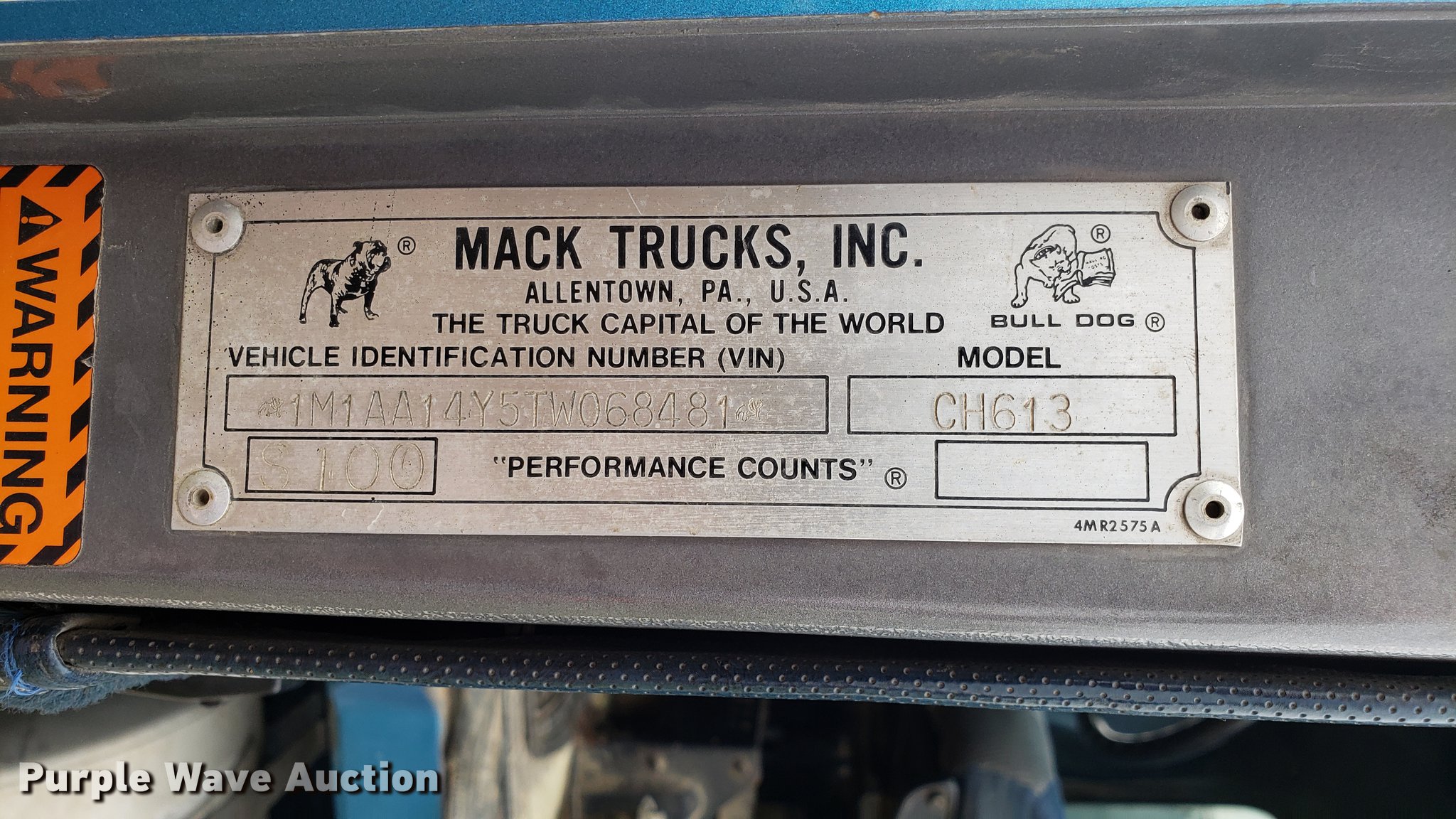 Purple Wave is selling a used Construction Dump Truck in Missouri. This item is a 1996 Mack CH613 dump truck with the following: 654,710 miles on odometer, 26,167 hours on meter, Mack 12.0L L6 diesel engine, Eaton Fuller 10 speed manual transmission, Tandem axle, AC and heat, Air suspension seat, PTO, Dierzen barrel bed, 15'L x 8'W, 40" side height, Single ram hoist, Air operated end gate, Dual fuel tanks, Air suspension, Air brakes, Engine brake, 11R24.5 tires