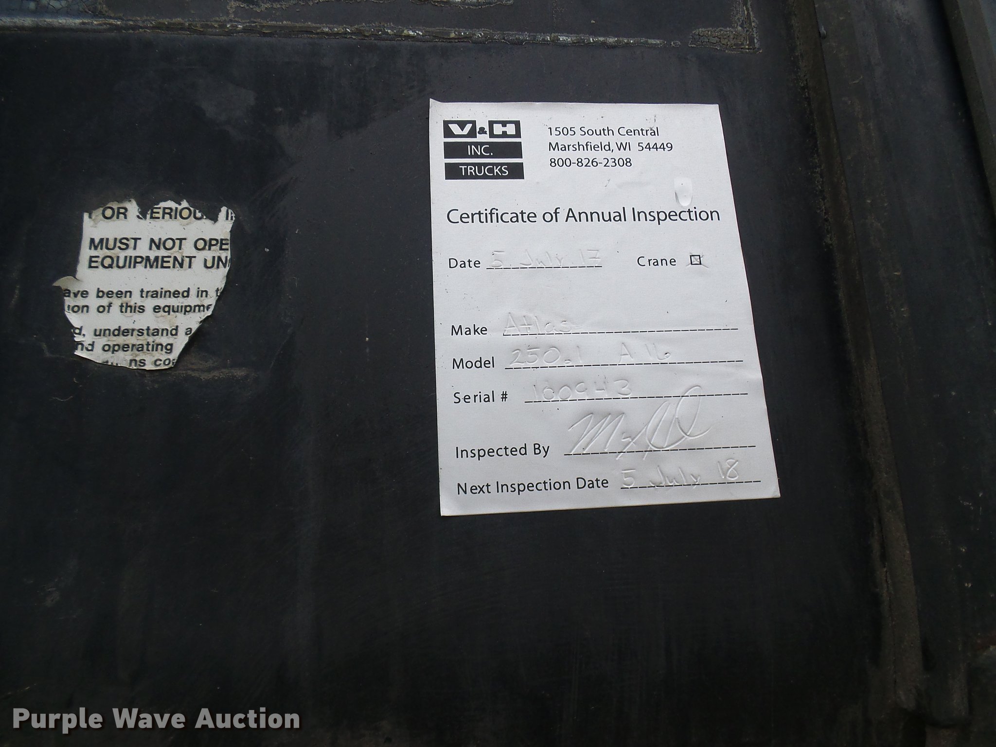 Purple Wave is selling a used Truck Part and Attach. in Missouri. This item is a 2004 Atlas/terex 250.IV truck crane bed with the following: 25'L x 8'W flatbed, 4,960 lbs maximum lift capacity, 45'9" maximum lift height, 45"L forks, Remote, Outriggers, Serial 100943