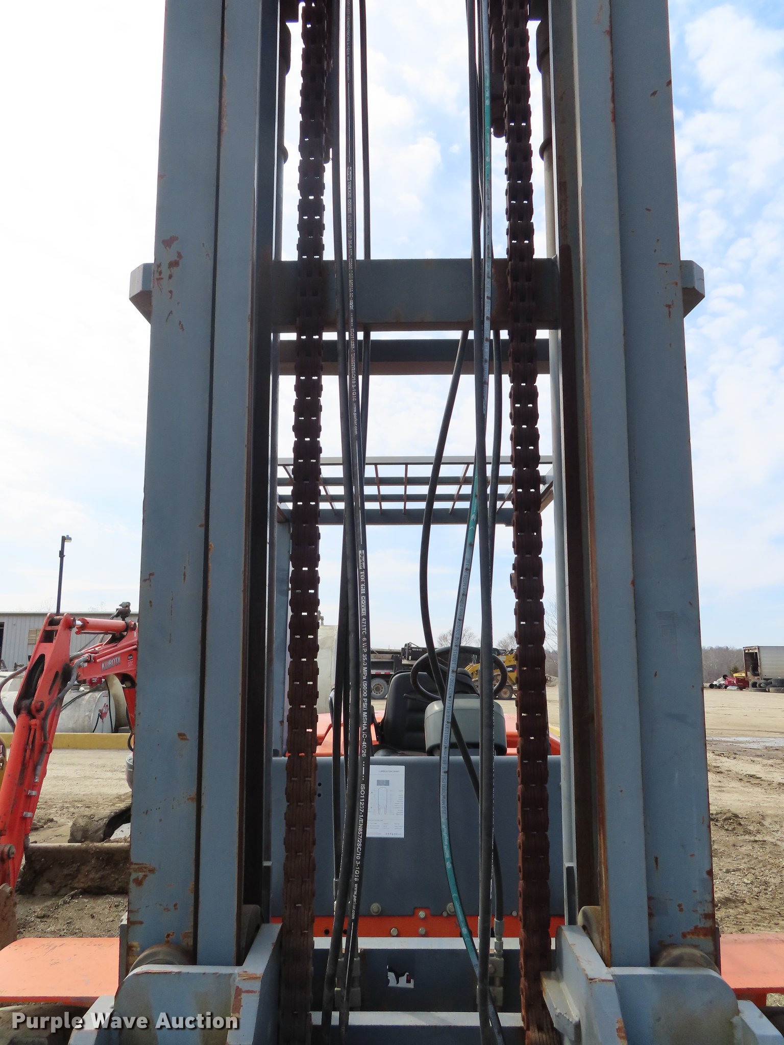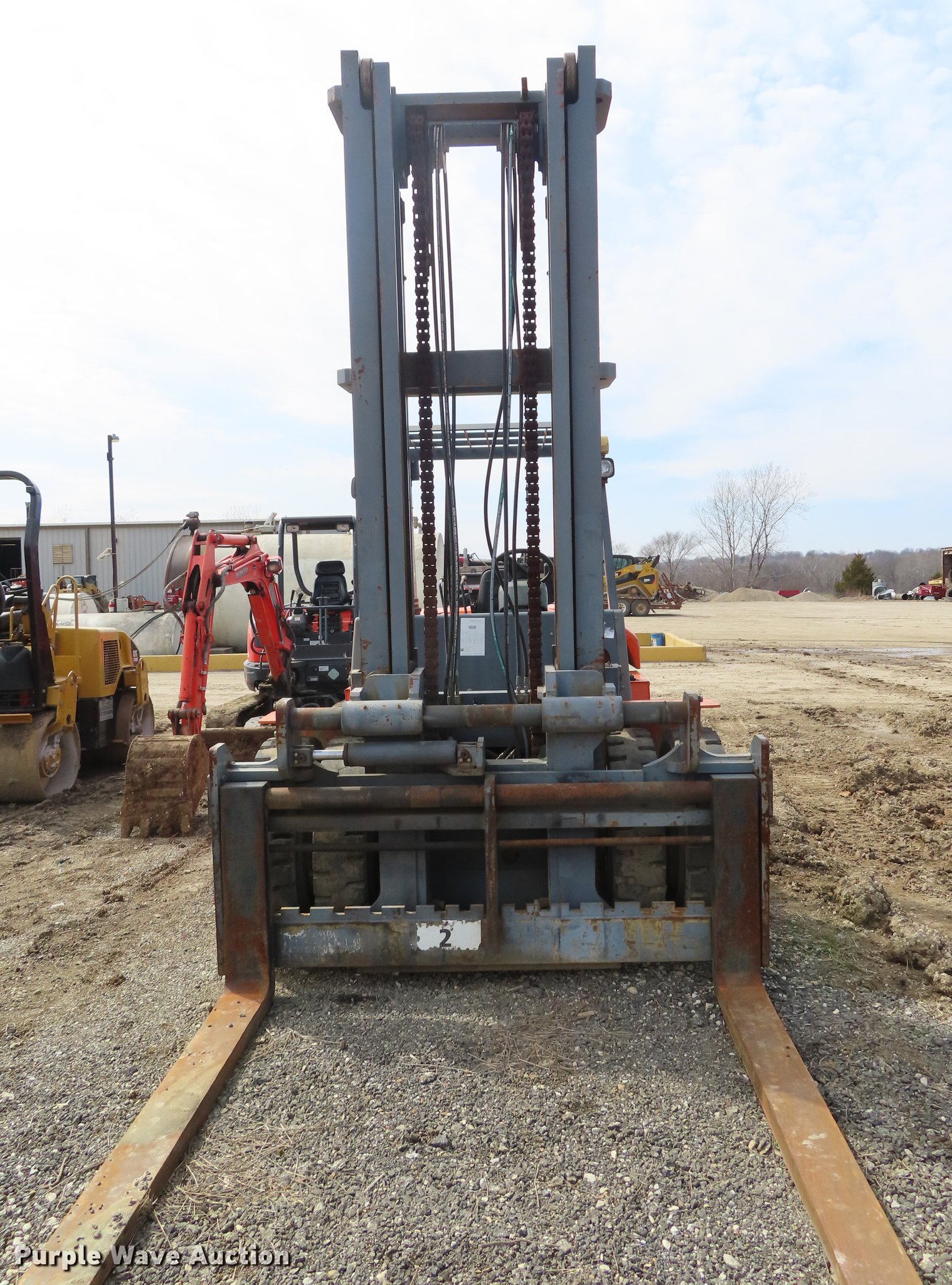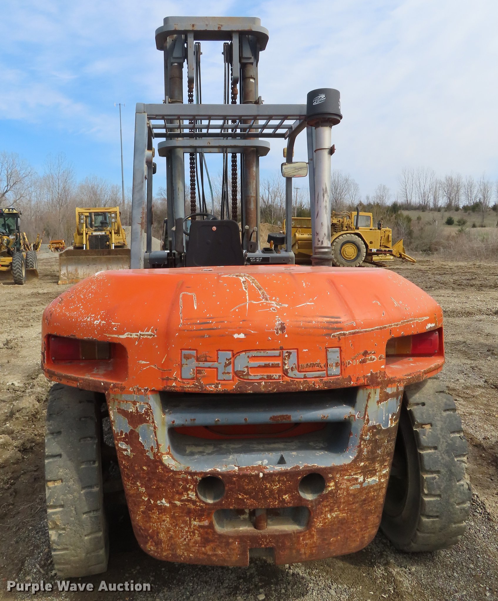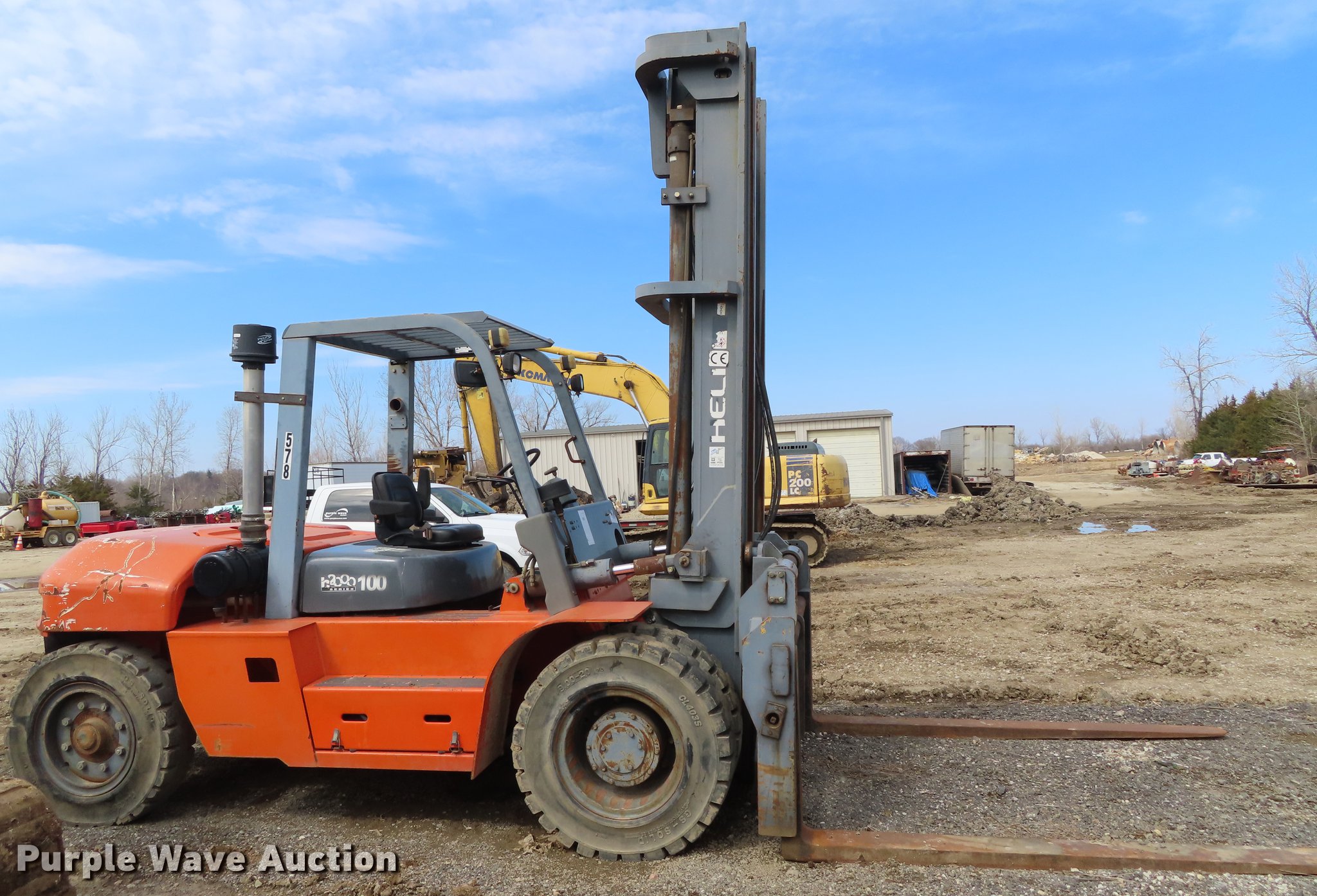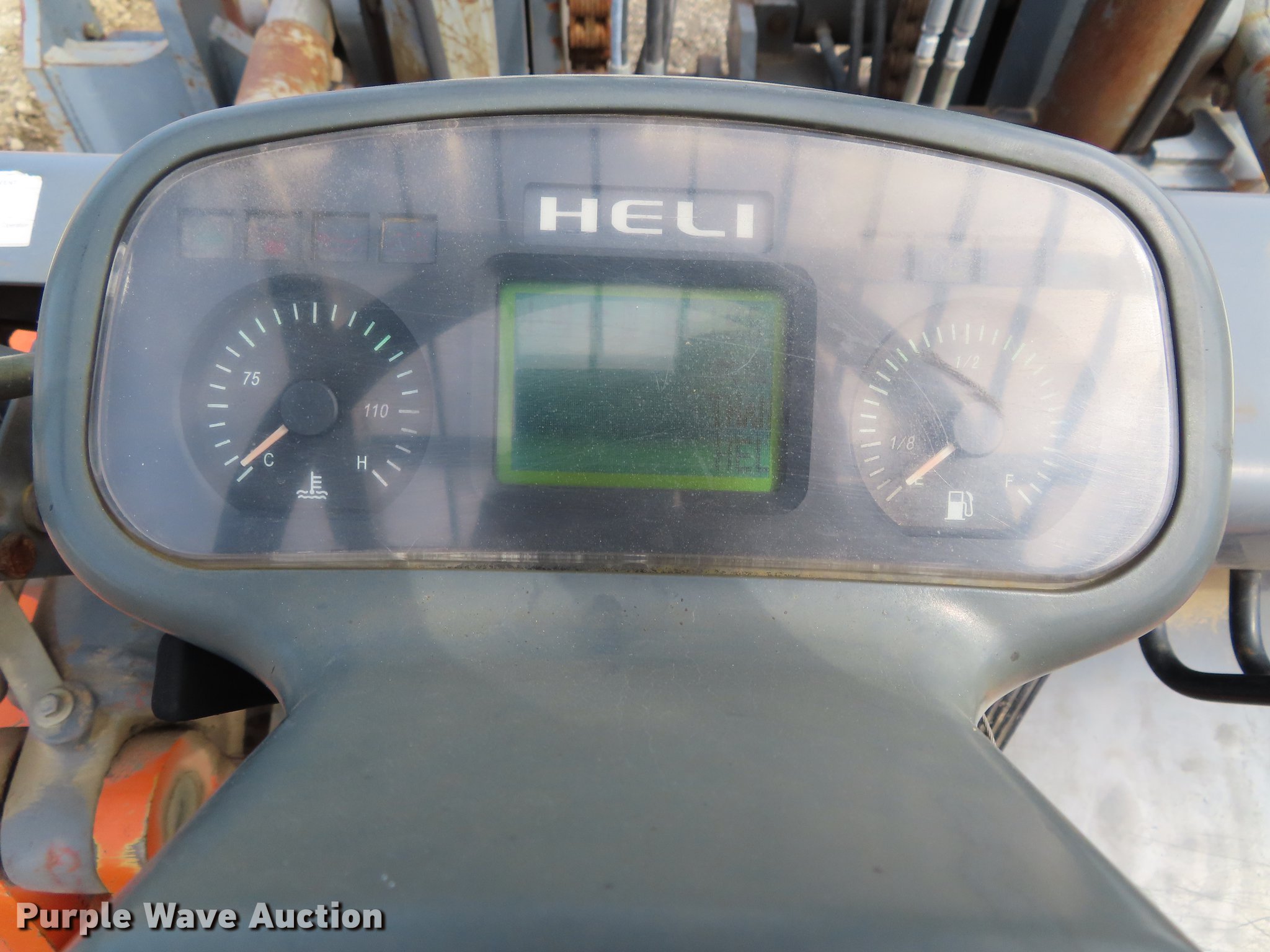 Purple Wave is selling a used Cushion Tire or Pneumatic Forklift in Kansas. This item is a Heli FD220 forklift with the following: 16,218 hours on meter, Isuzu six cylinder diesel engine, Two speed hydrostatic transmission, OROPS, 19,800 lbs maximum lift capacity, 197" maximum lift height, Two stage mast, Side shift, Mast tilt, 96"L forks, 9.00-20 solid tires, Serial 01100B3511W5