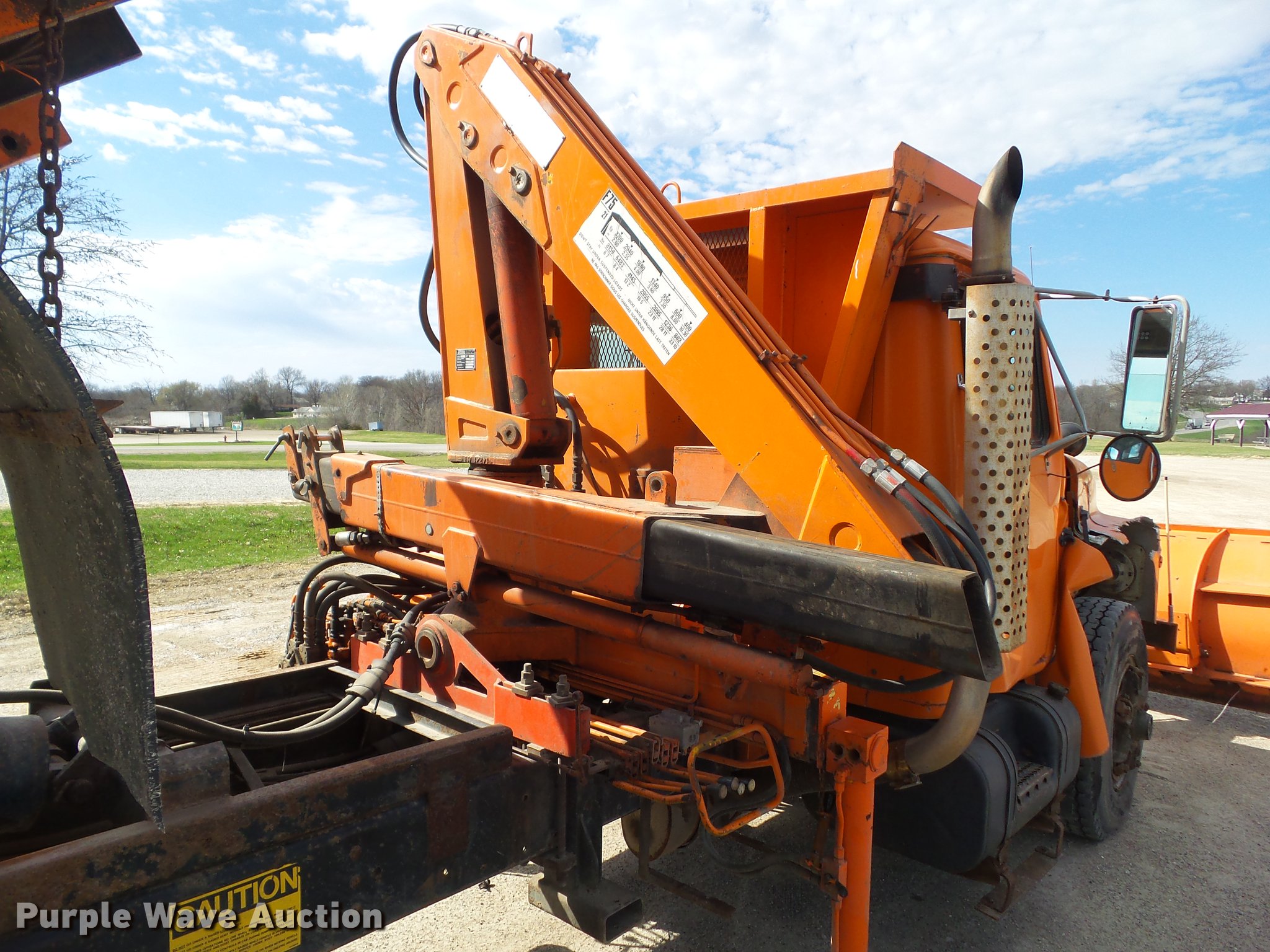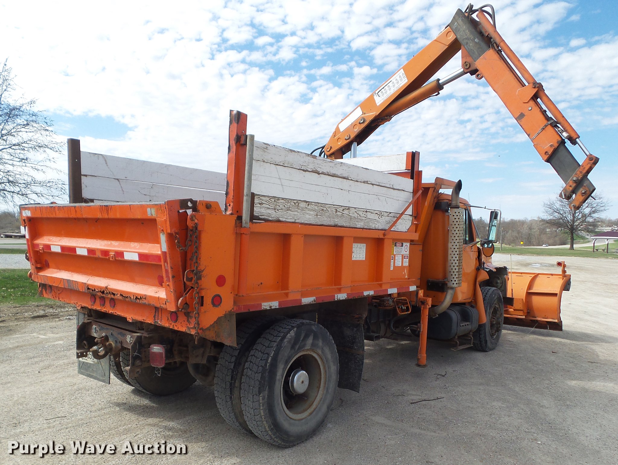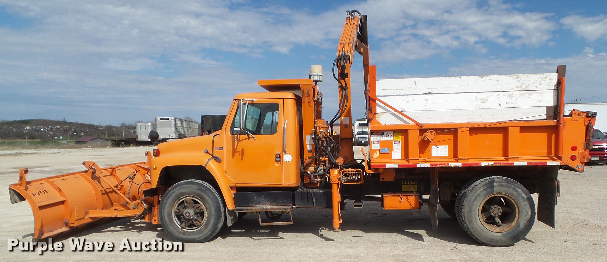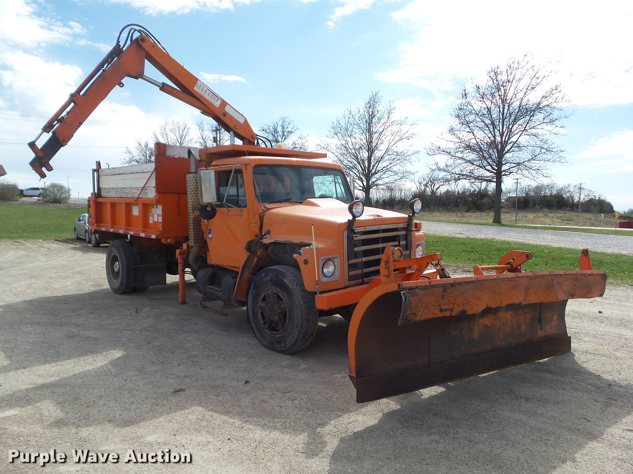 Purple Wave is selling a used Construction Dump Truck in Iowa. This item is a 1987 International 1754 dump truck with the following: 159,756 miles on odometer, International eight cylinder diesel engine, 180 HP, Spicer Double Duty D 10 speed manual transmission, Two speed rear end, Single axle, Heat, AM/FM/cassette, Suspension seat, Smith 10ASL steel dump bed, 10'L x 96"W, 24" side height, 26" side board height, Single ram hoist, Manual end gate, Serial 105432, 11'W plow, Fassi F7521 crane, 8,159 lbs max lift capacity, 18'5" max lift height, Man basket, Serial 5058, Single fuel tank, Pintle hitch, Trailer wiring, Hydraulic brakes, Spring suspension, 188" wheelbase, 11R22.5 front tires, 10.00R20 rear tires
