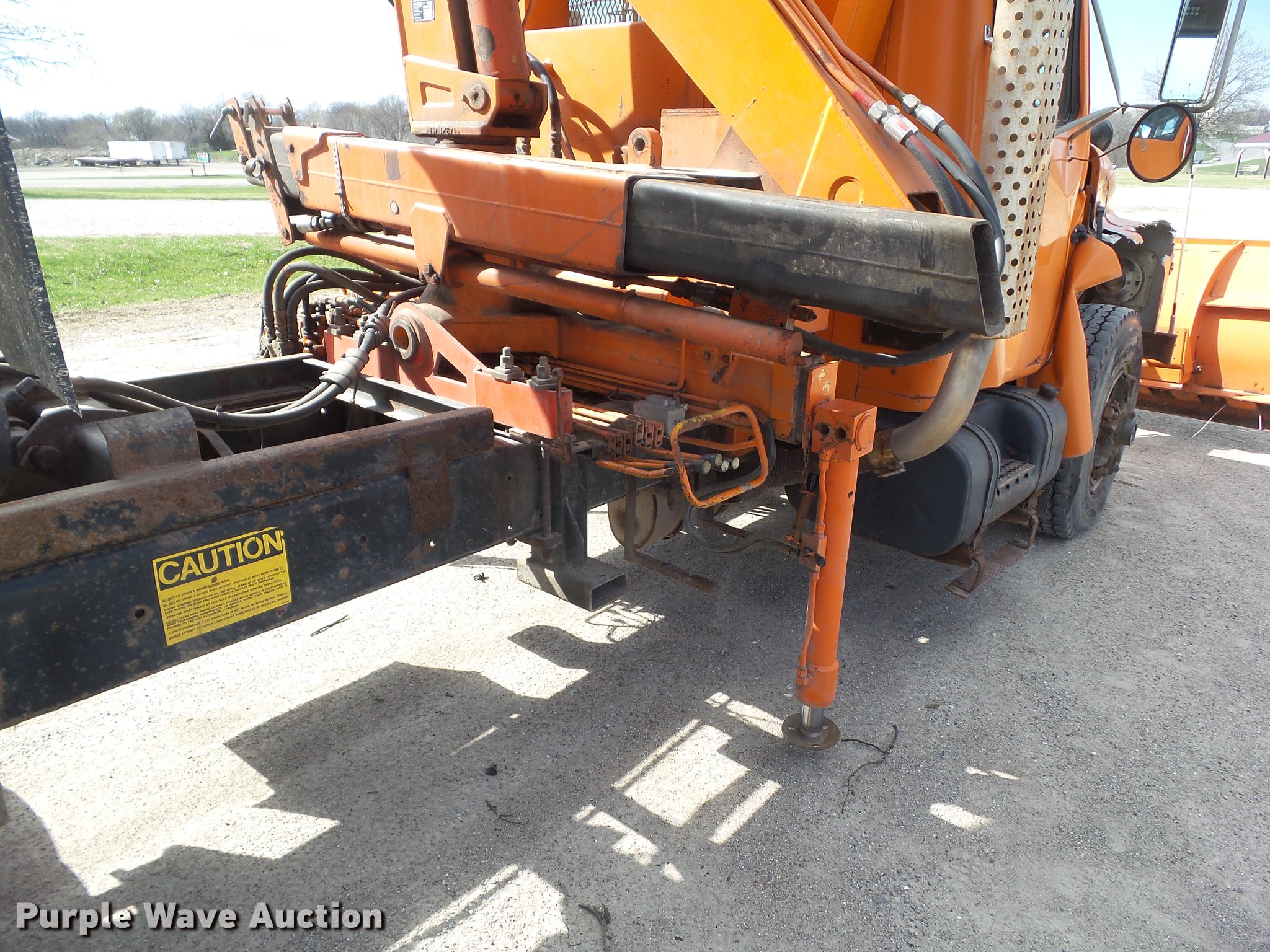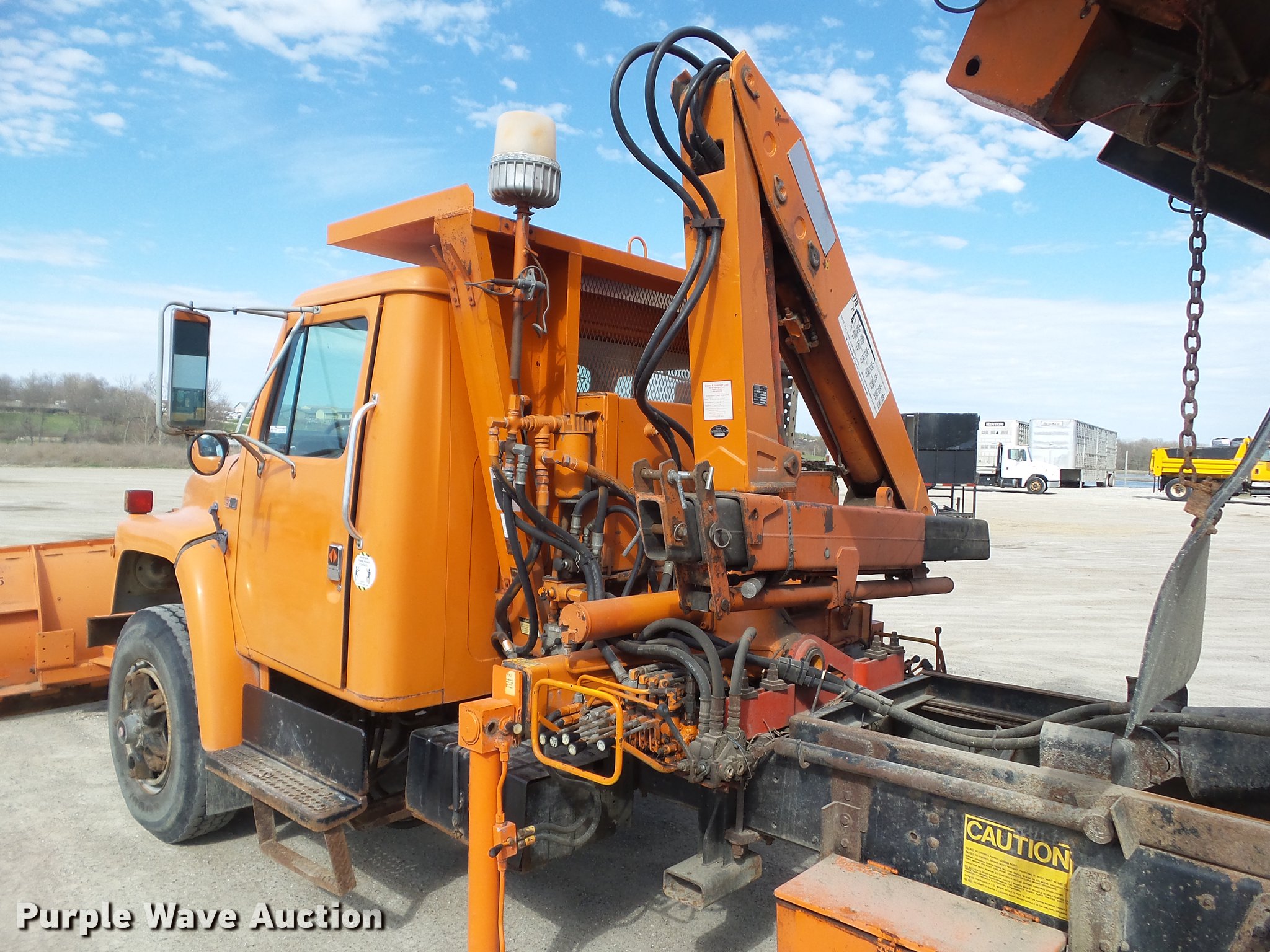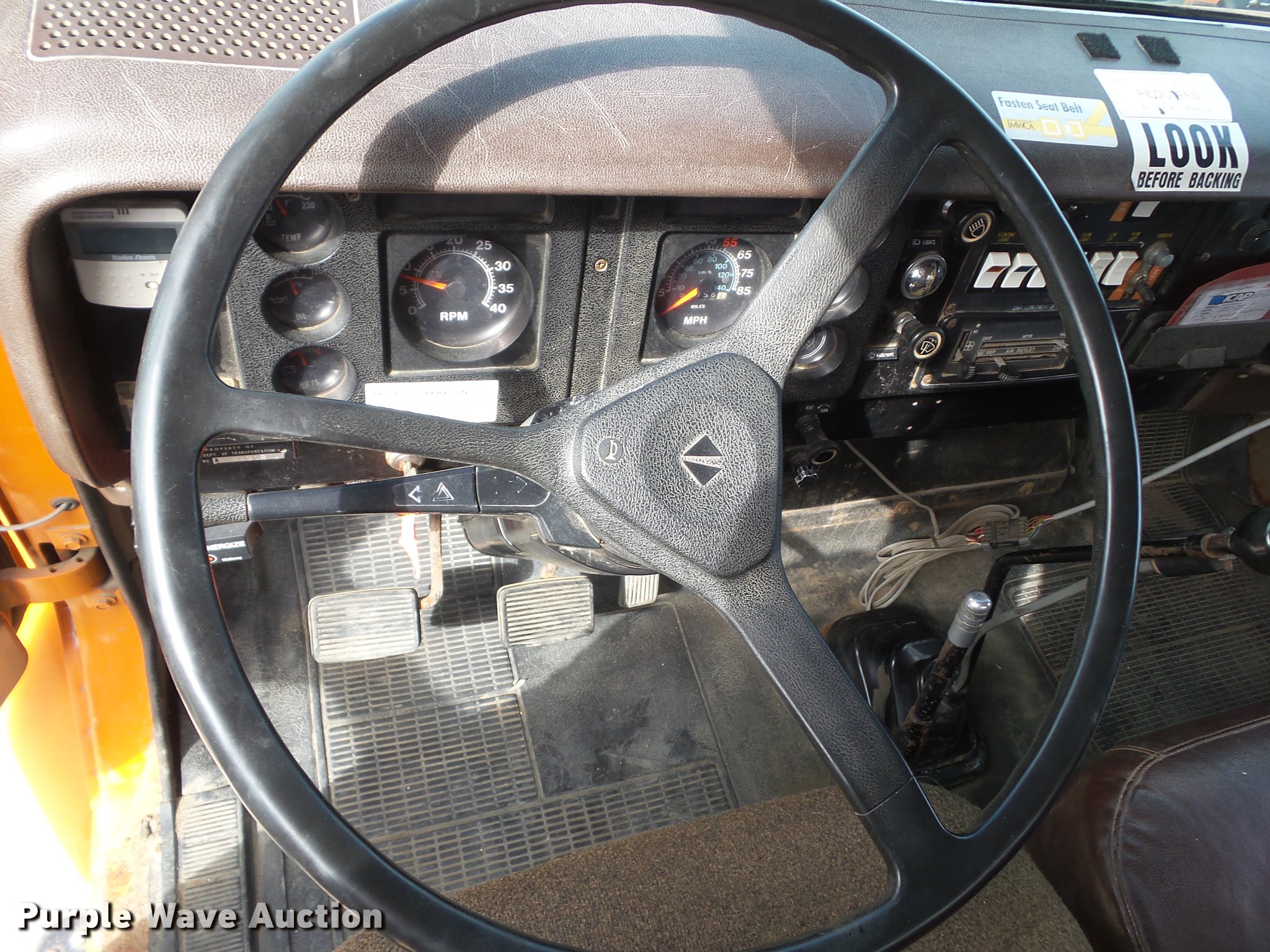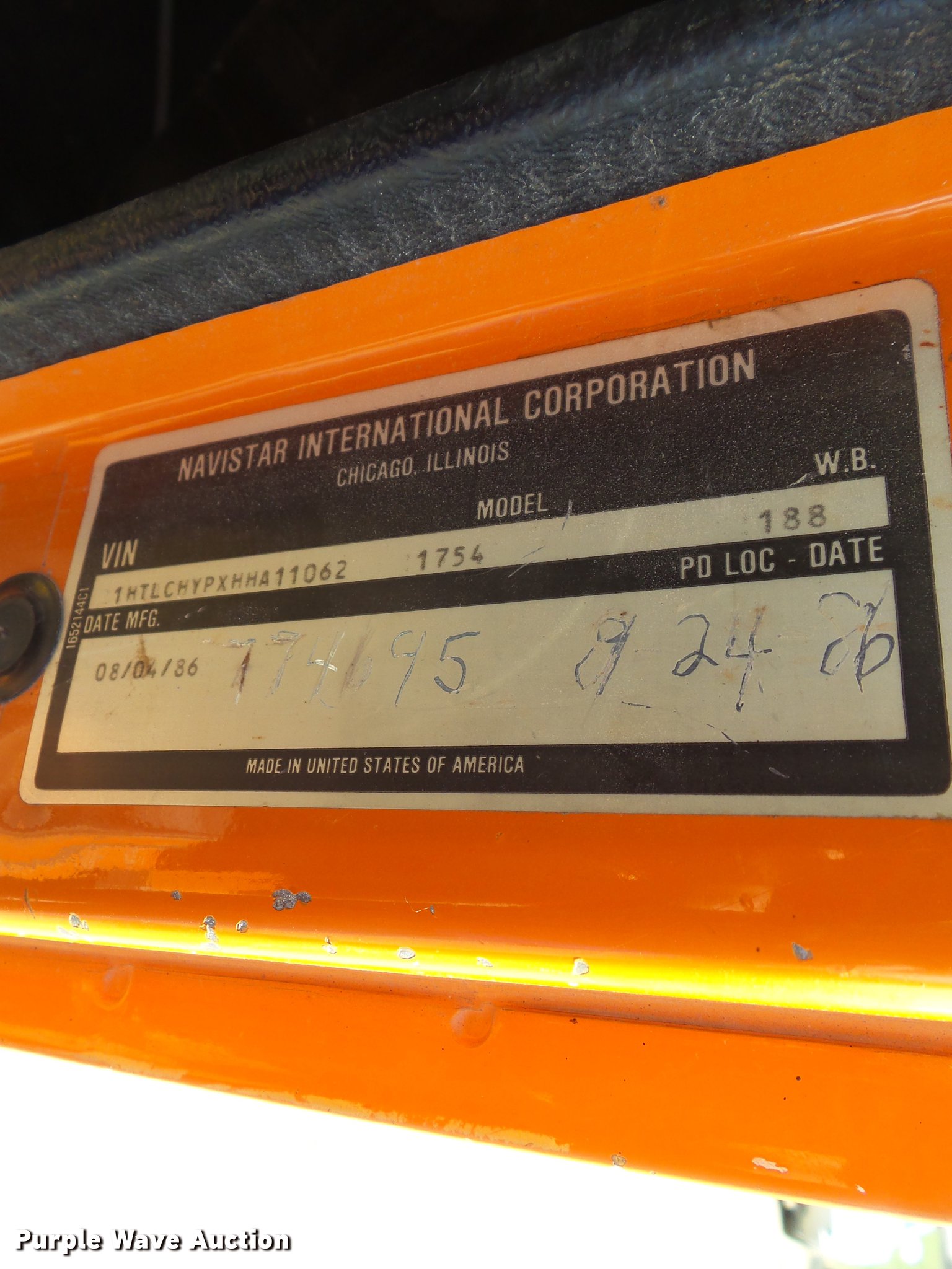 Purple Wave is selling a used Construction Dump Truck in Iowa. This item is a 1987 International 1754 dump truck with the following: 159,756 miles on odometer, International eight cylinder diesel engine, 180 HP, Spicer Double Duty D 10 speed manual transmission, Two speed rear end, Single axle, Heat, AM/FM/cassette, Suspension seat, Smith 10ASL steel dump bed, 10'L x 96"W, 24" side height, 26" side board height, Single ram hoist, Manual end gate, Serial 105432, 11'W plow, Fassi F7521 crane, 8,159 lbs max lift capacity, 18'5" max lift height, Man basket, Serial 5058, Single fuel tank, Pintle hitch, Trailer wiring, Hydraulic brakes, Spring suspension, 188" wheelbase, 11R22.5 front tires, 10.00R20 rear tires