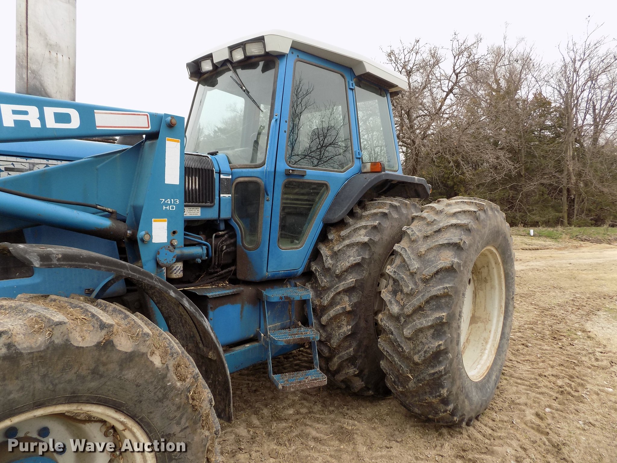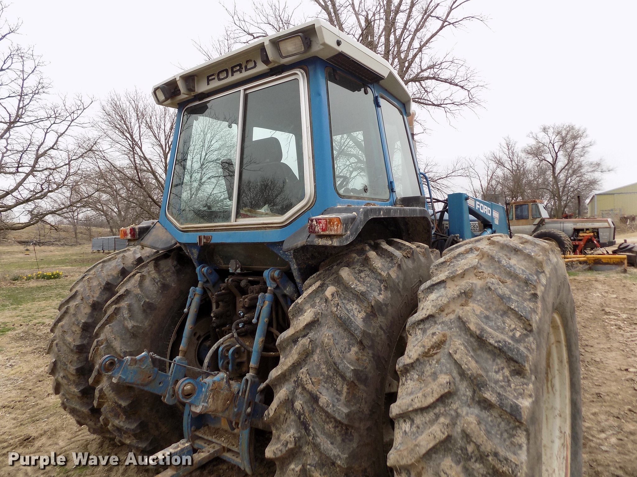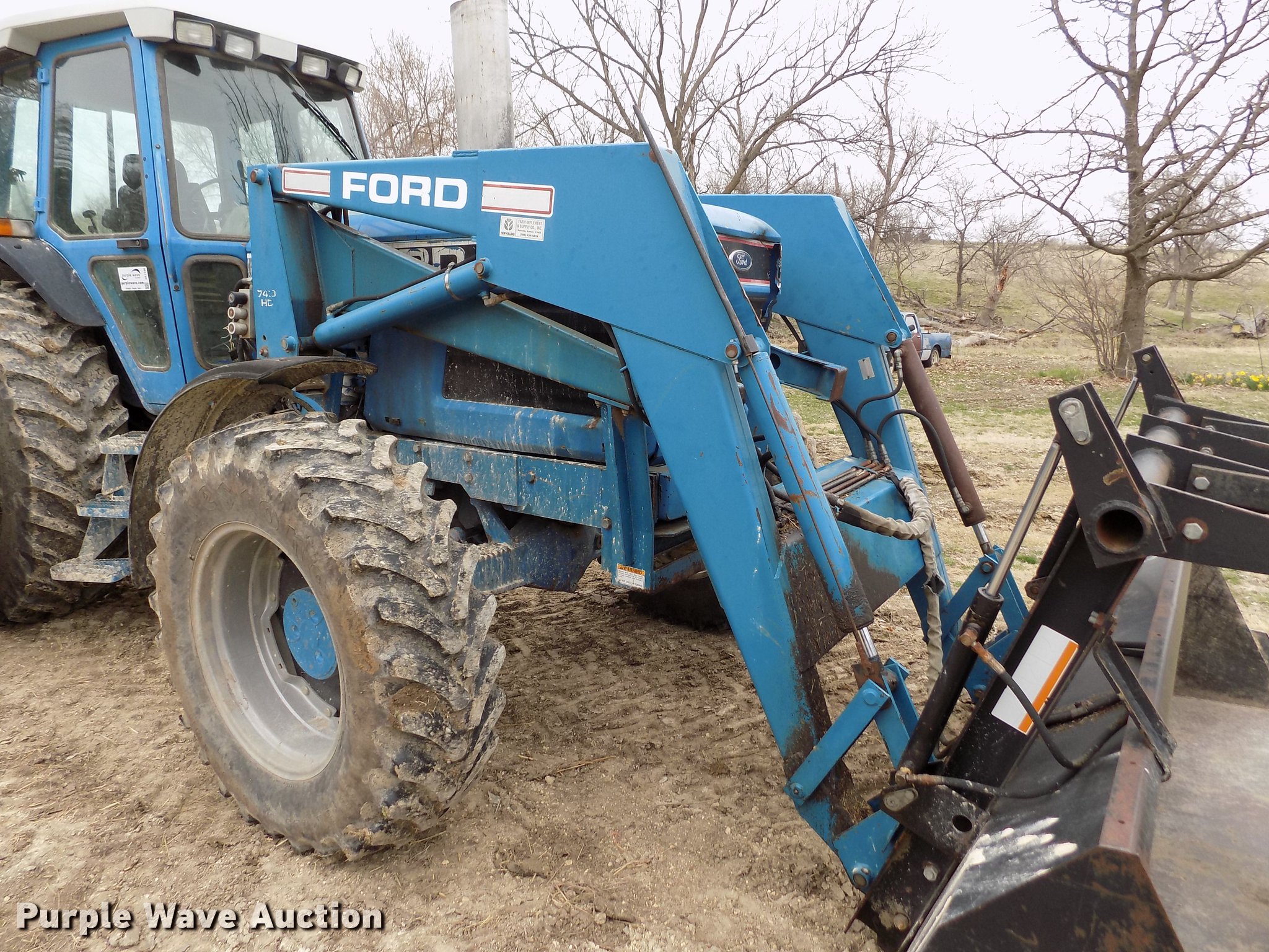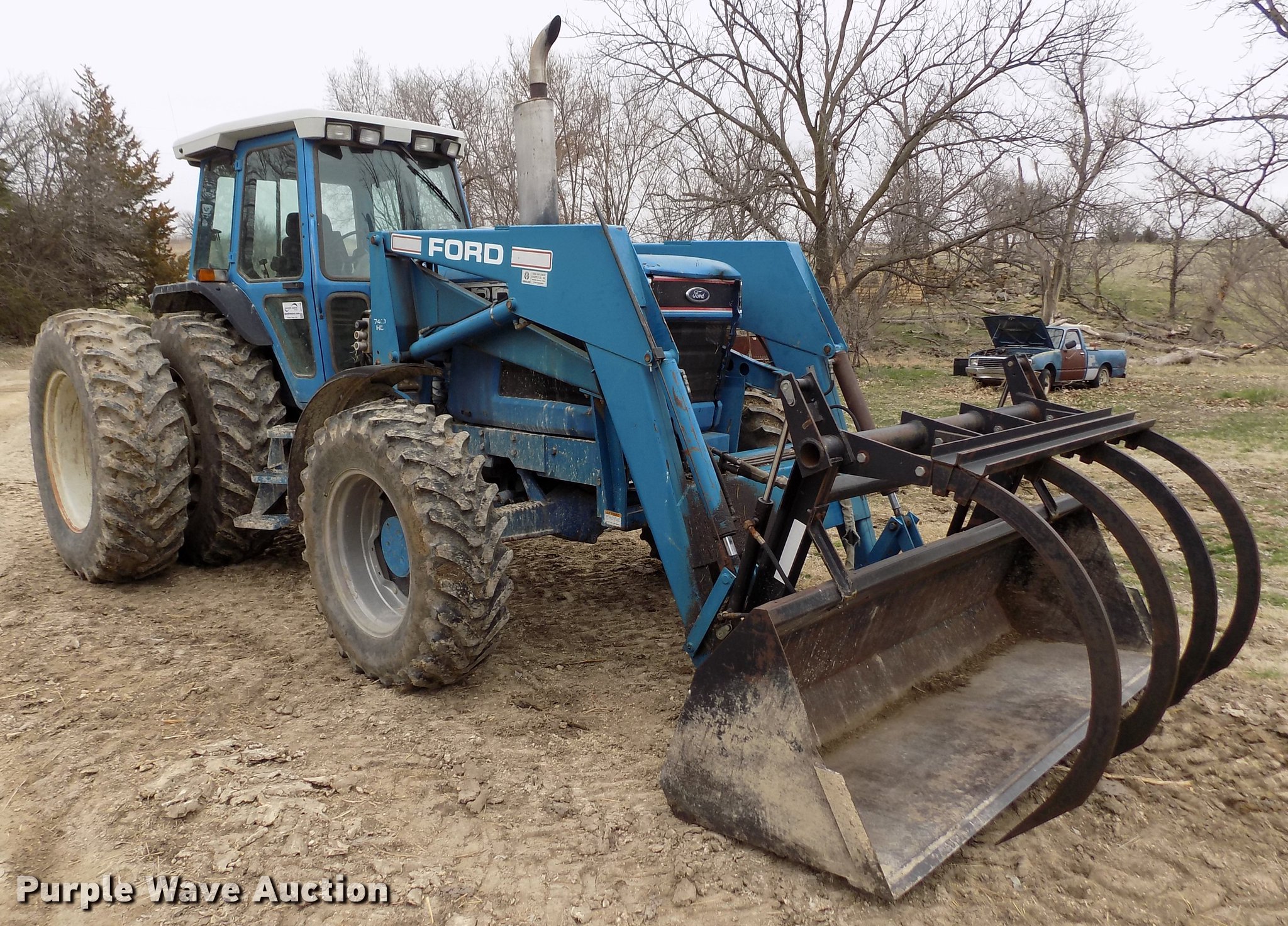 Purple Wave is selling a used Tractor in Kansas. This item is a Ford 8830 MFWD tractor with the following: 6,220 hours on meter, Ford 6.6L six cylinder diesel engine, Serial FNH9673626DS, Powershift transmission, 18F-9R gears, Differential lock, AC and heat, Tilt steering wheel, AM/FM, Suspension seat, Block heater, Ether start, Ford 7413HD loader, 96"W bucket, Grapple, Joystick controls, Three point, Seven pin outlet, 1000 PTO, (3) rear hydraulic remote sets, (5) wheel weights, 14.9R28 front tires, 18.4R38 dual rear tires