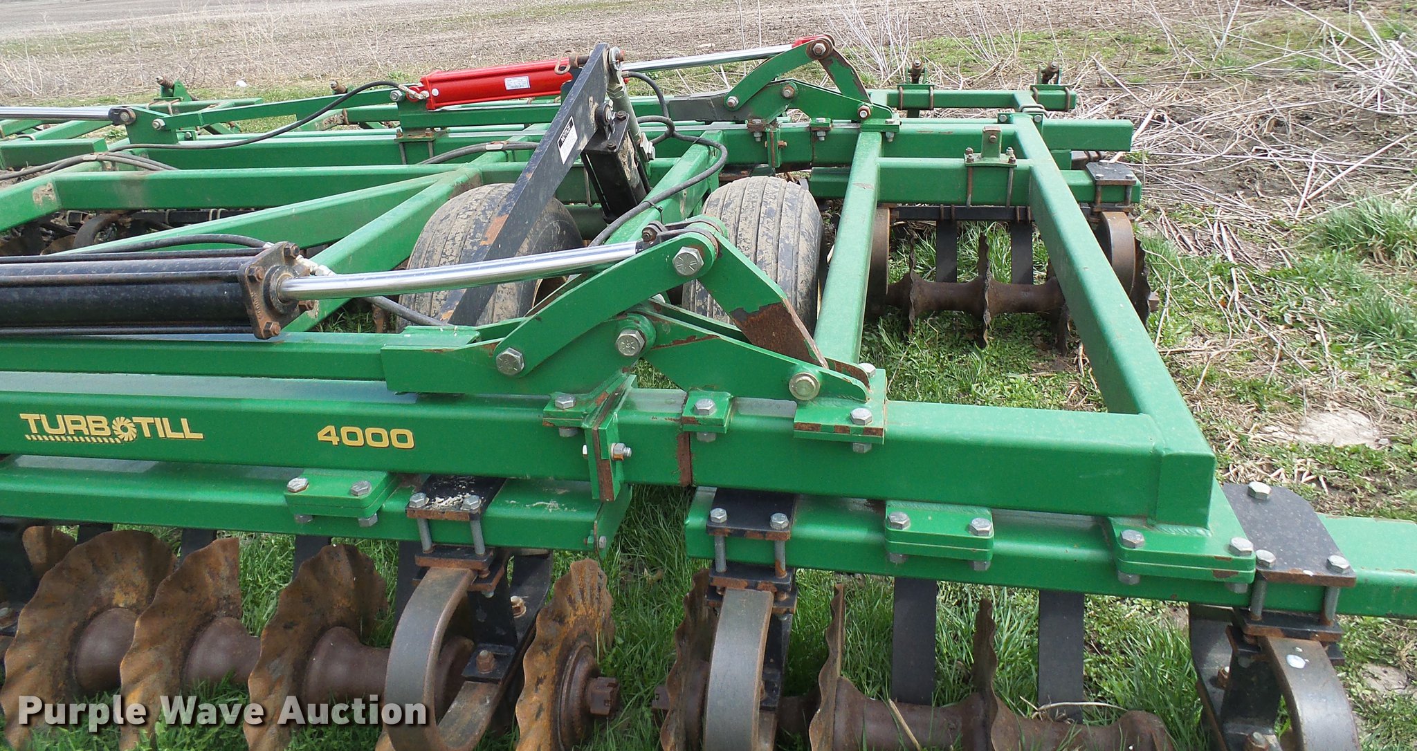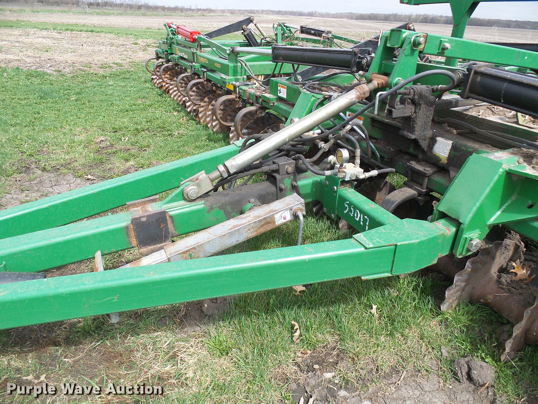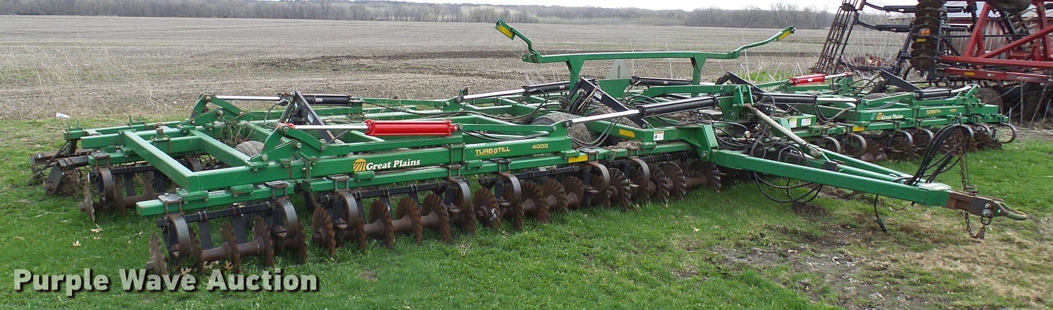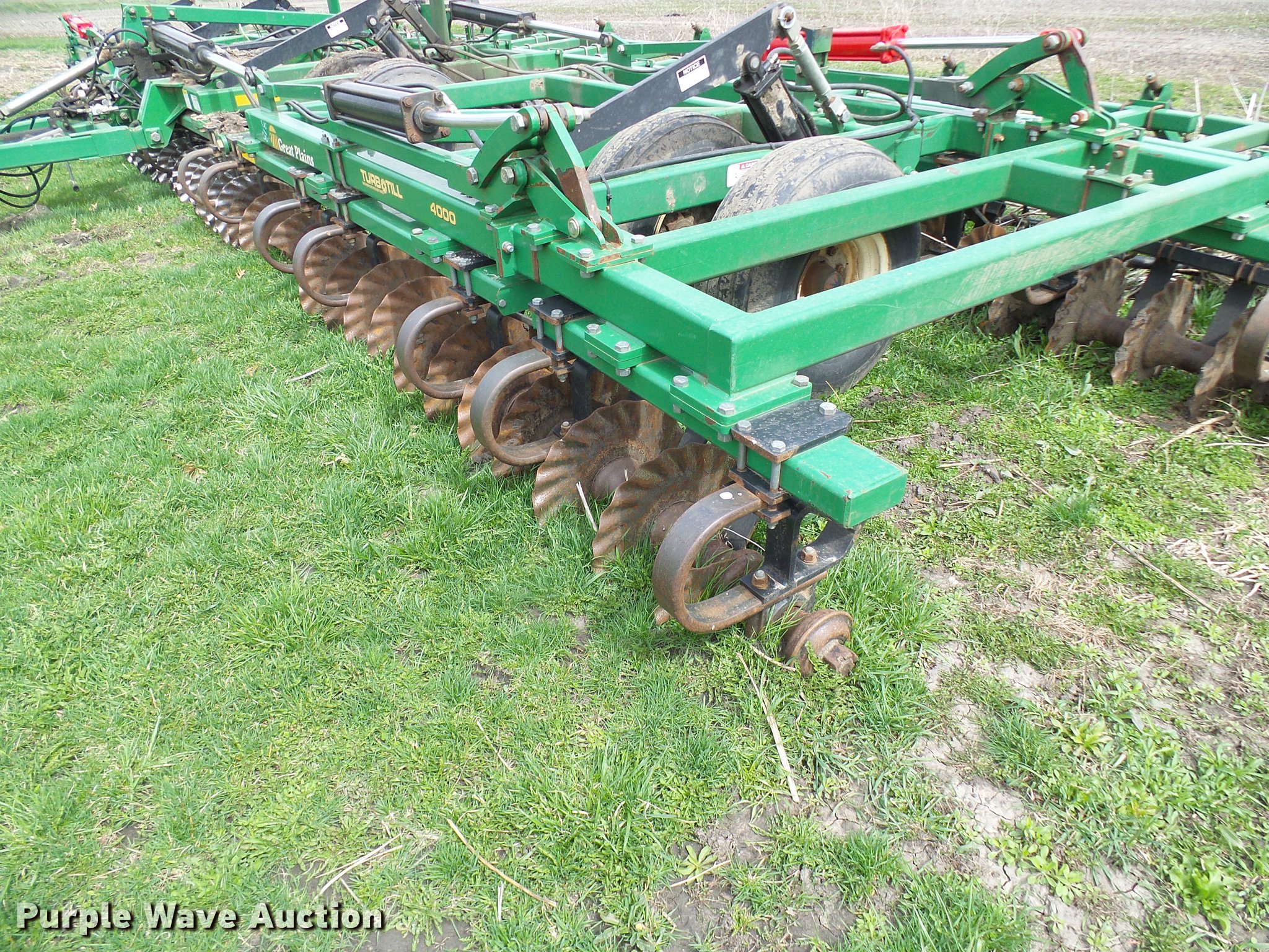 Purple Wave is selling a used Vertical Tillage in Missouri. This item is a 2006 Great Plains Turbo Till 4000TT vertical tillage with the following: 40'W, 10" spacing, Disk scrapers, Hydraulic lift and fold, Pin/clevis hitch, 32x15.50-16.50SL tires, 12.5L-15 tires, One disc missing and one broken, Serial GP-2392NN