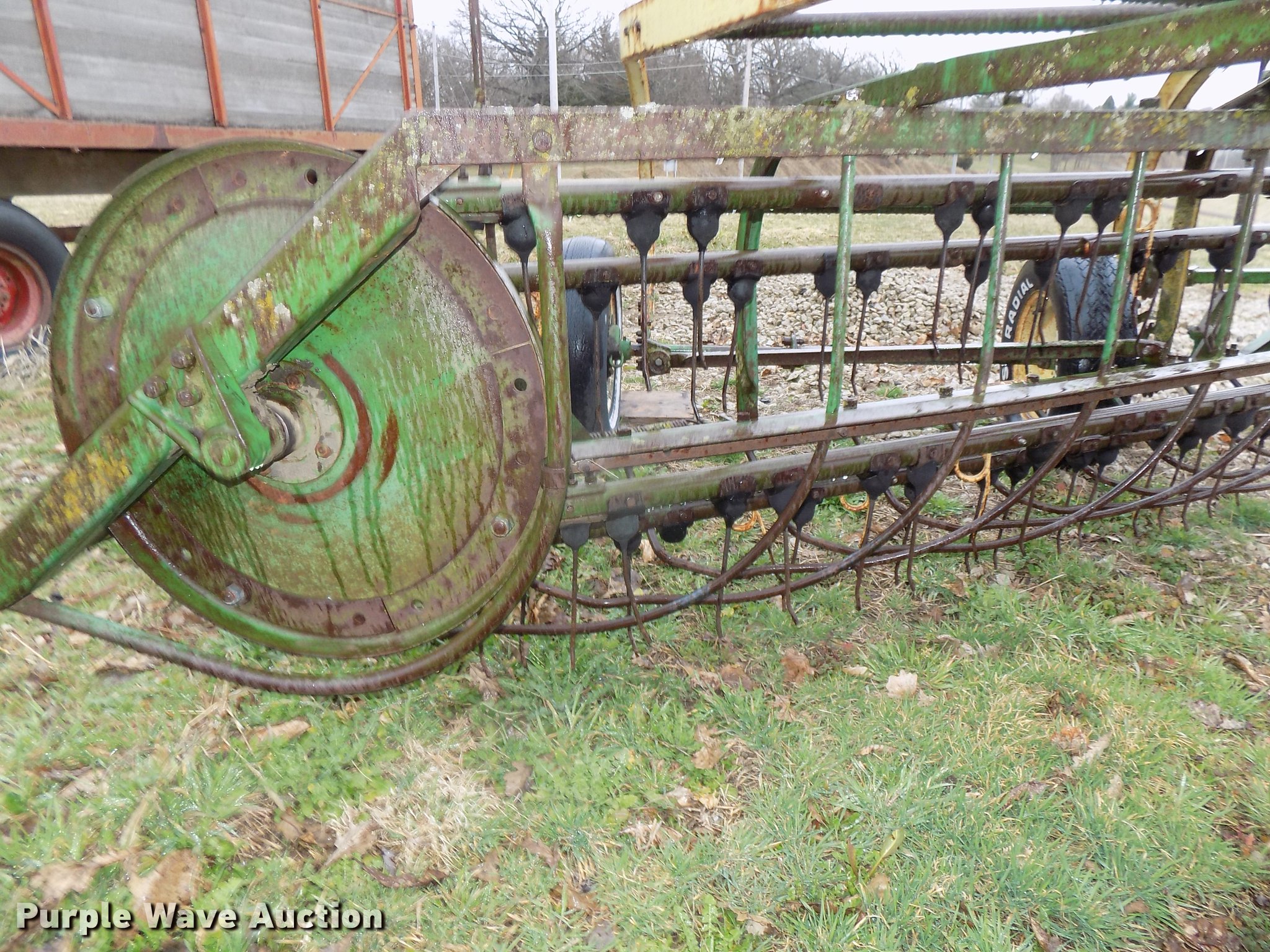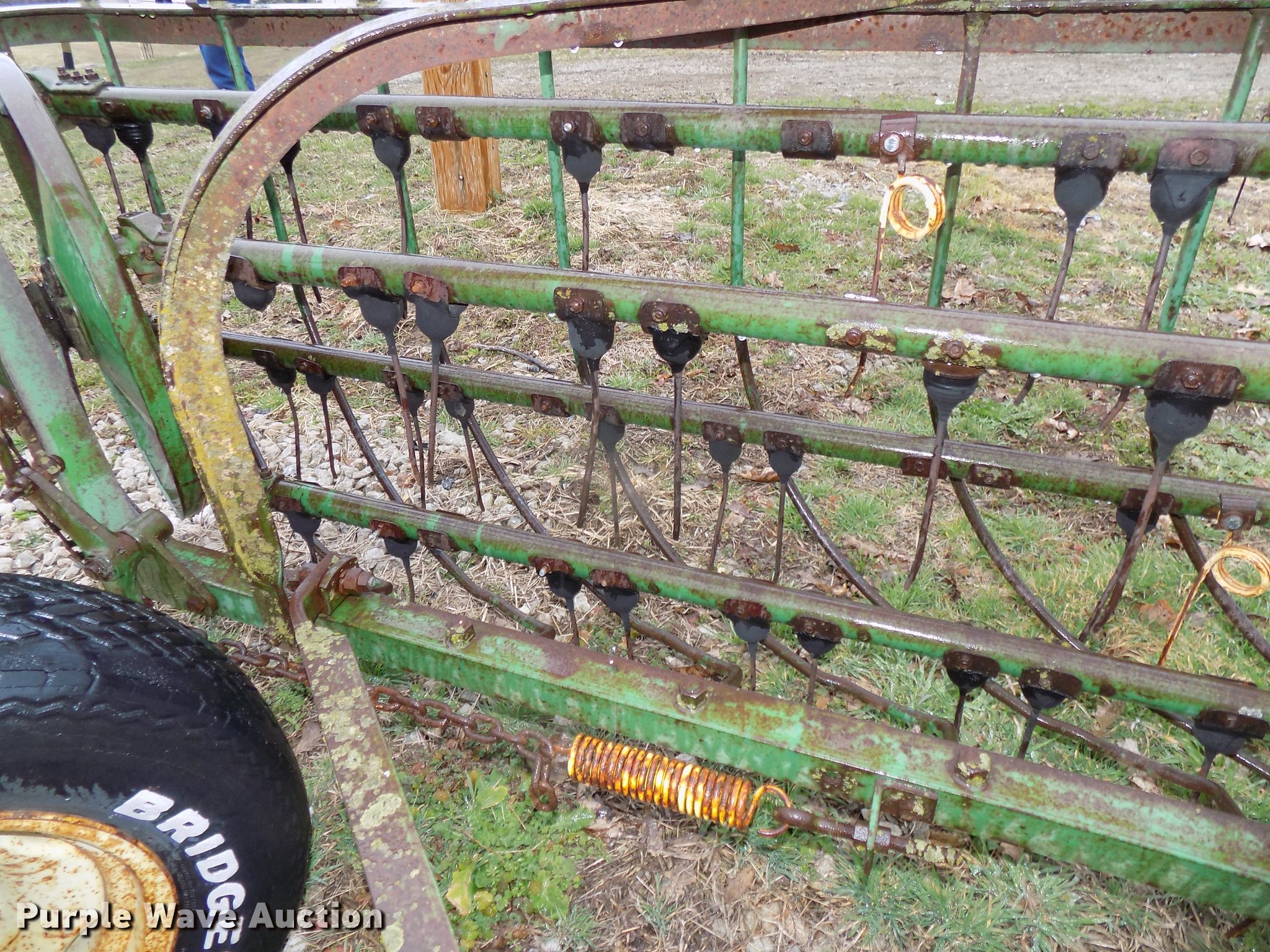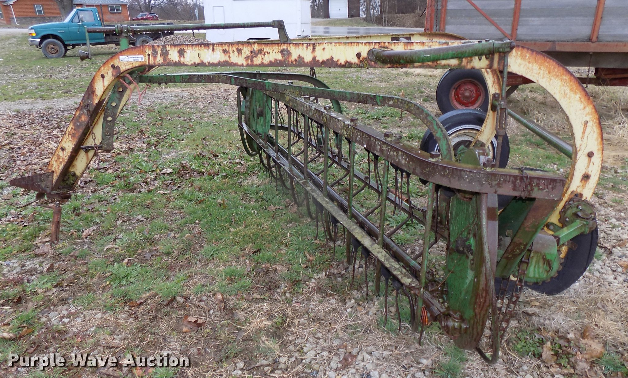Purple Wave is selling a used Hay Rake in Iowa. This item is a John Deere 894A hay rake with the following: 8'W swath, Ground driven, Pin hitch, 7.50-14 tires, Serial 46811