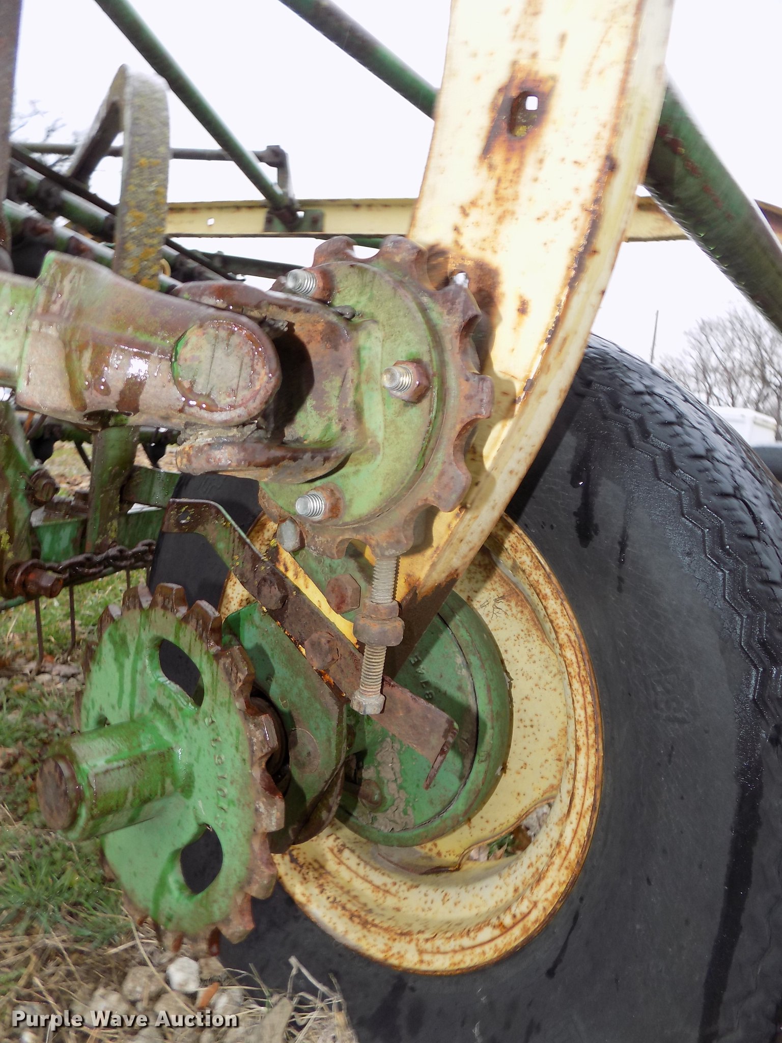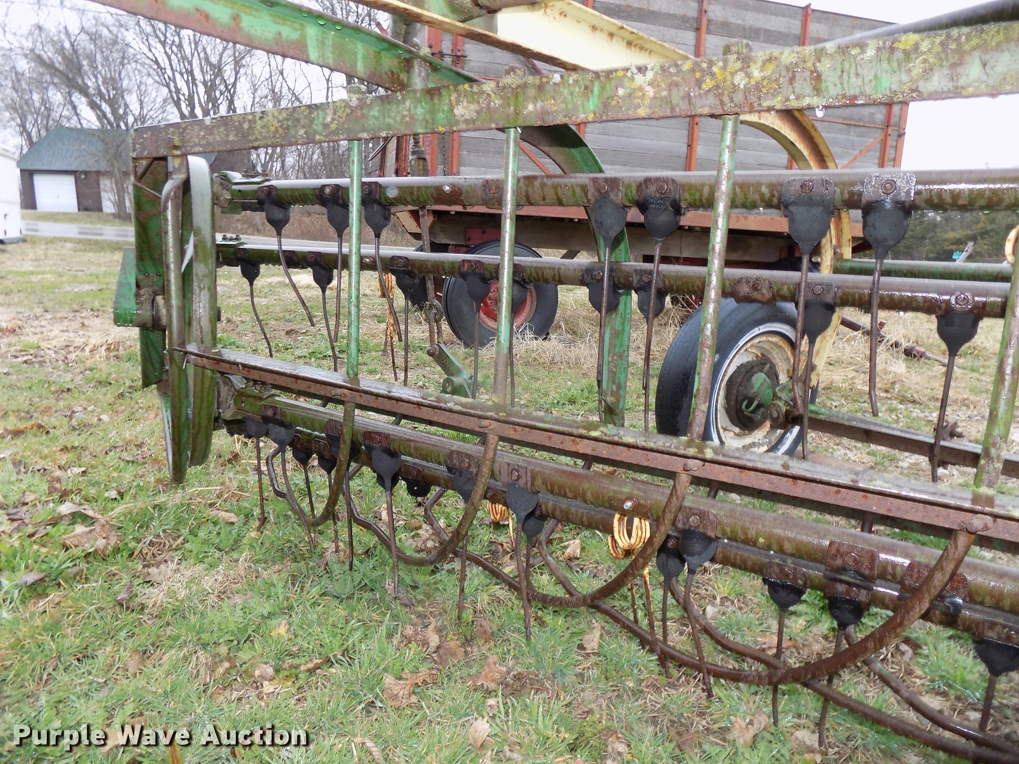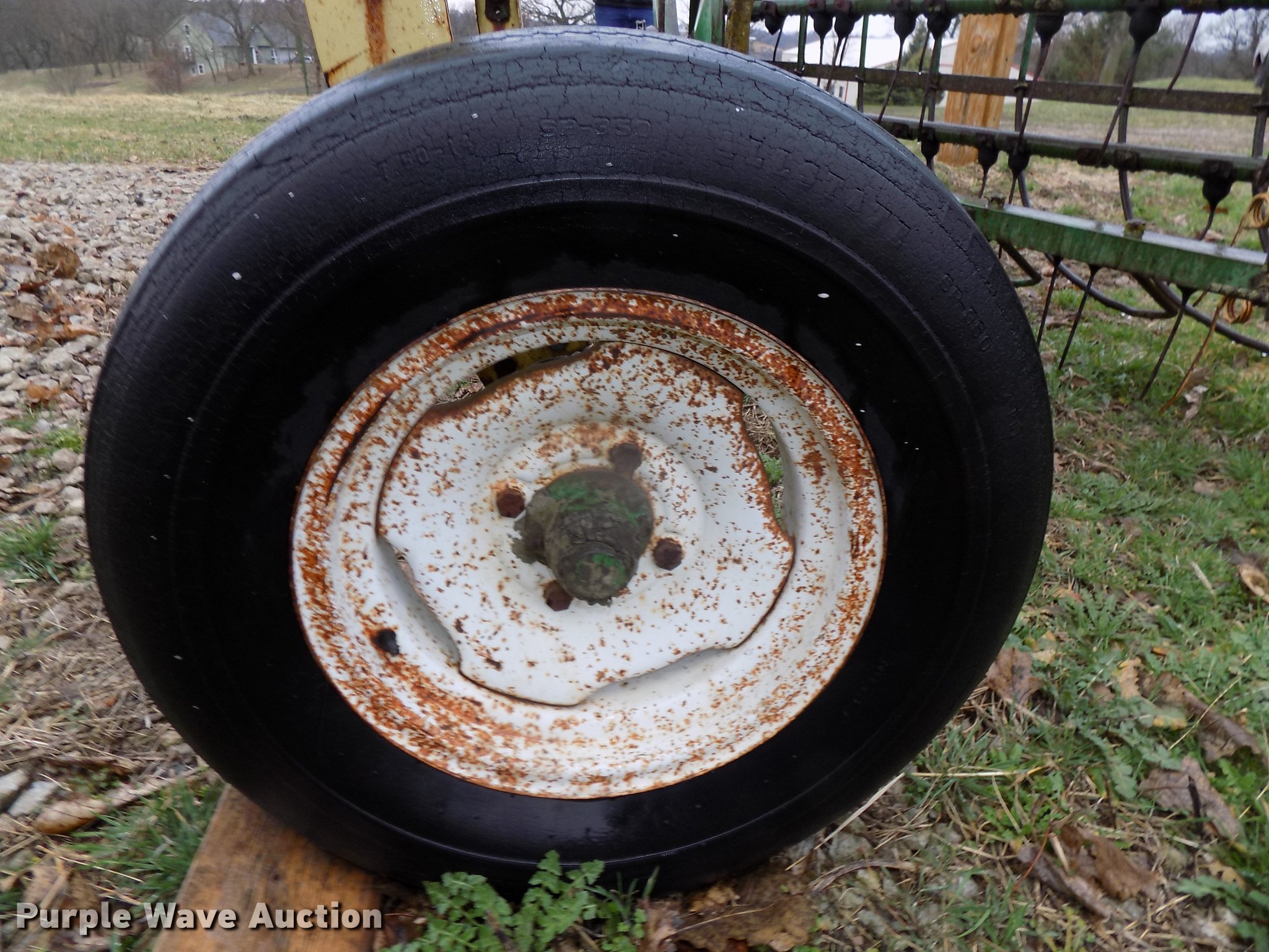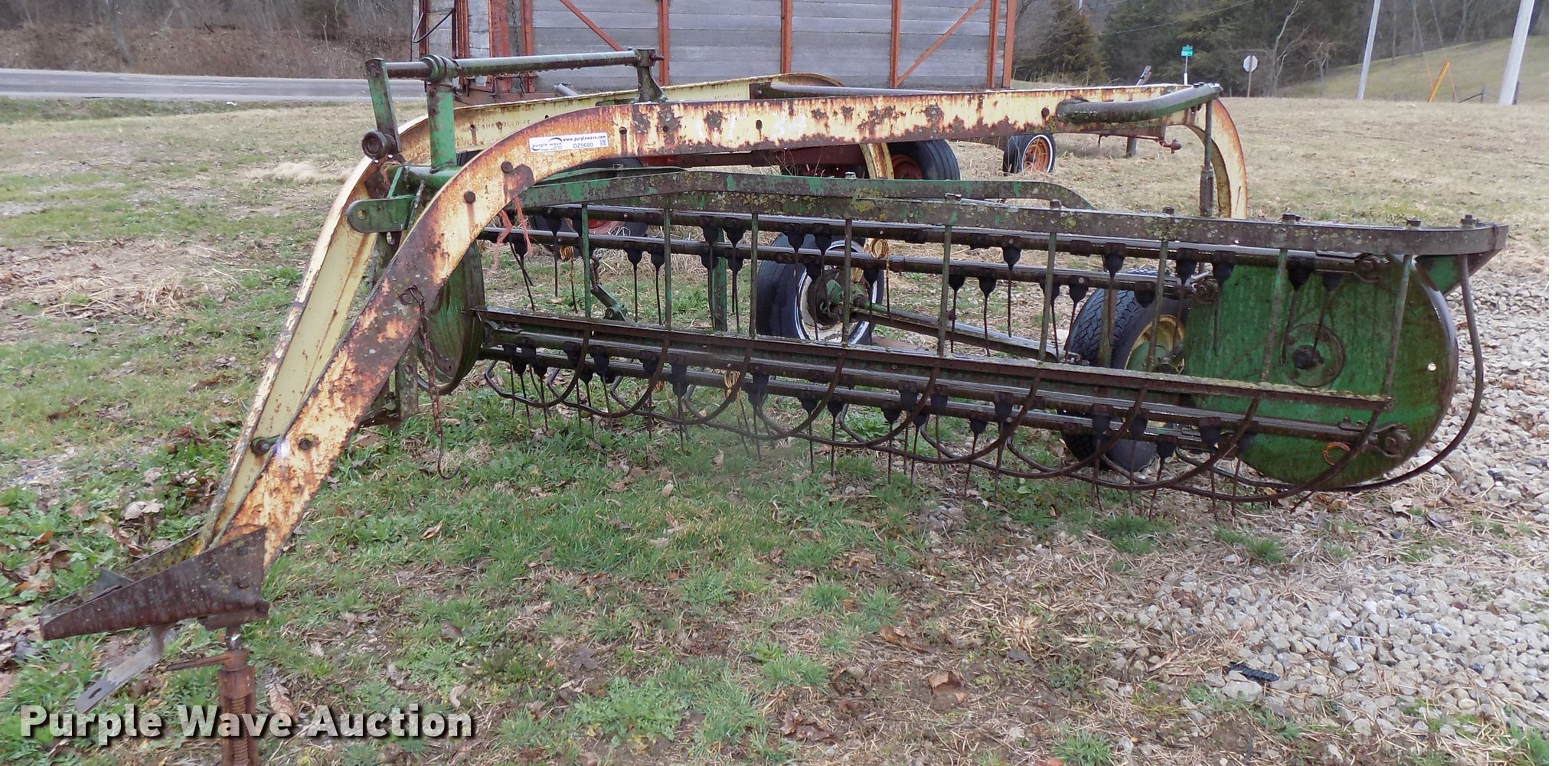 Purple Wave is selling a used Hay Rake in Iowa. This item is a John Deere 894A hay rake with the following: 8'W swath, Ground driven, Pin hitch, 7.50-14 tires, Serial 46811
