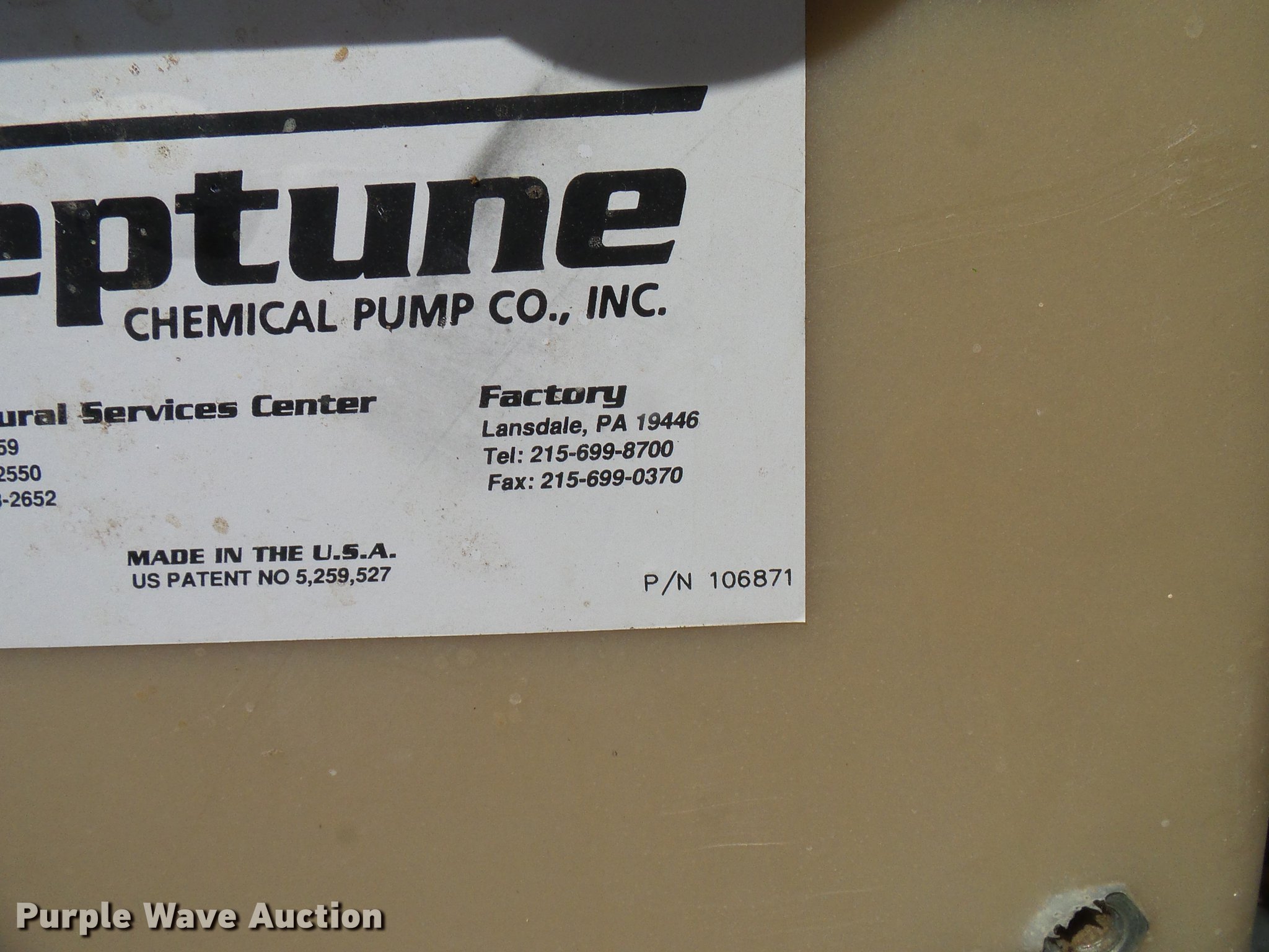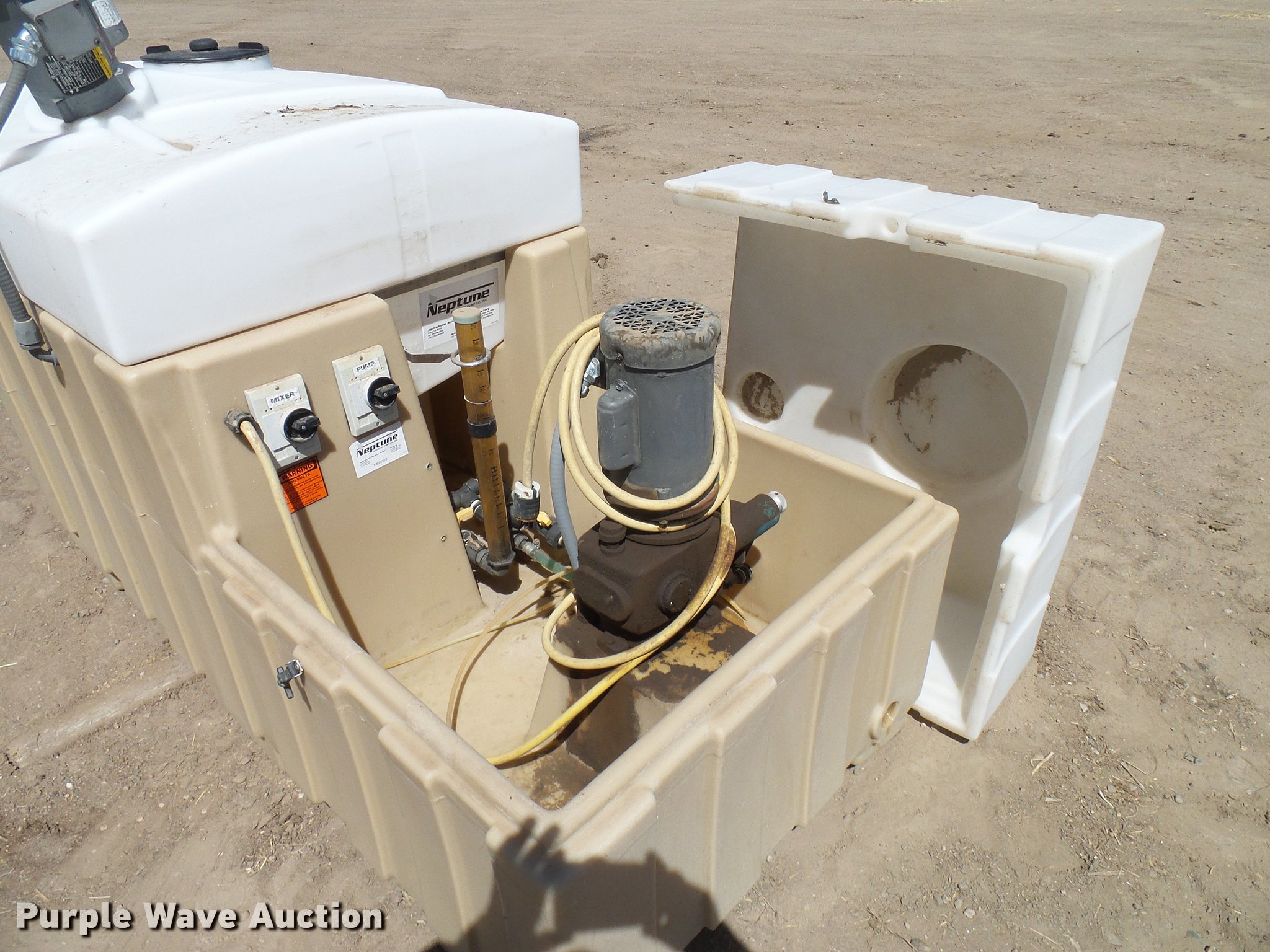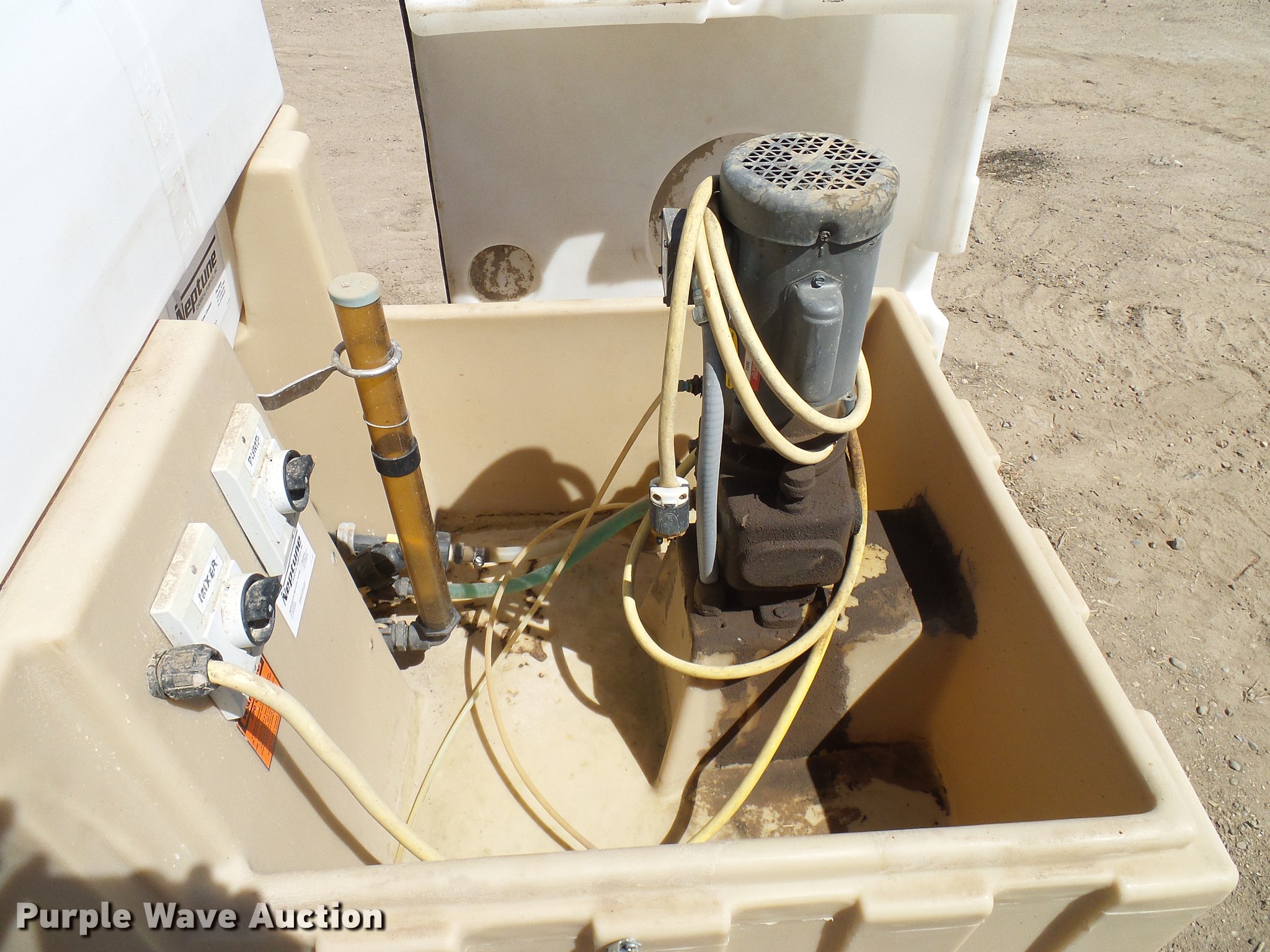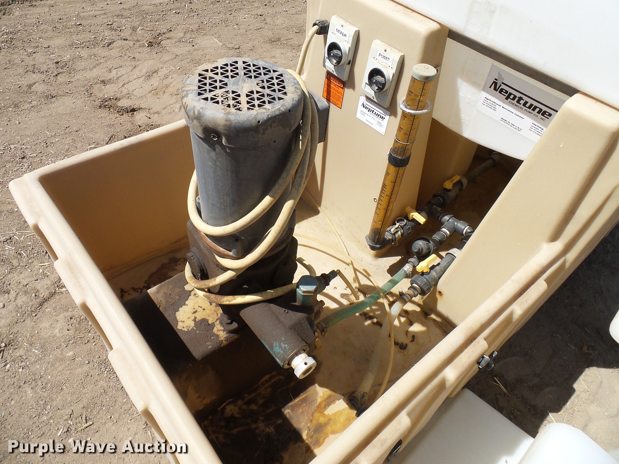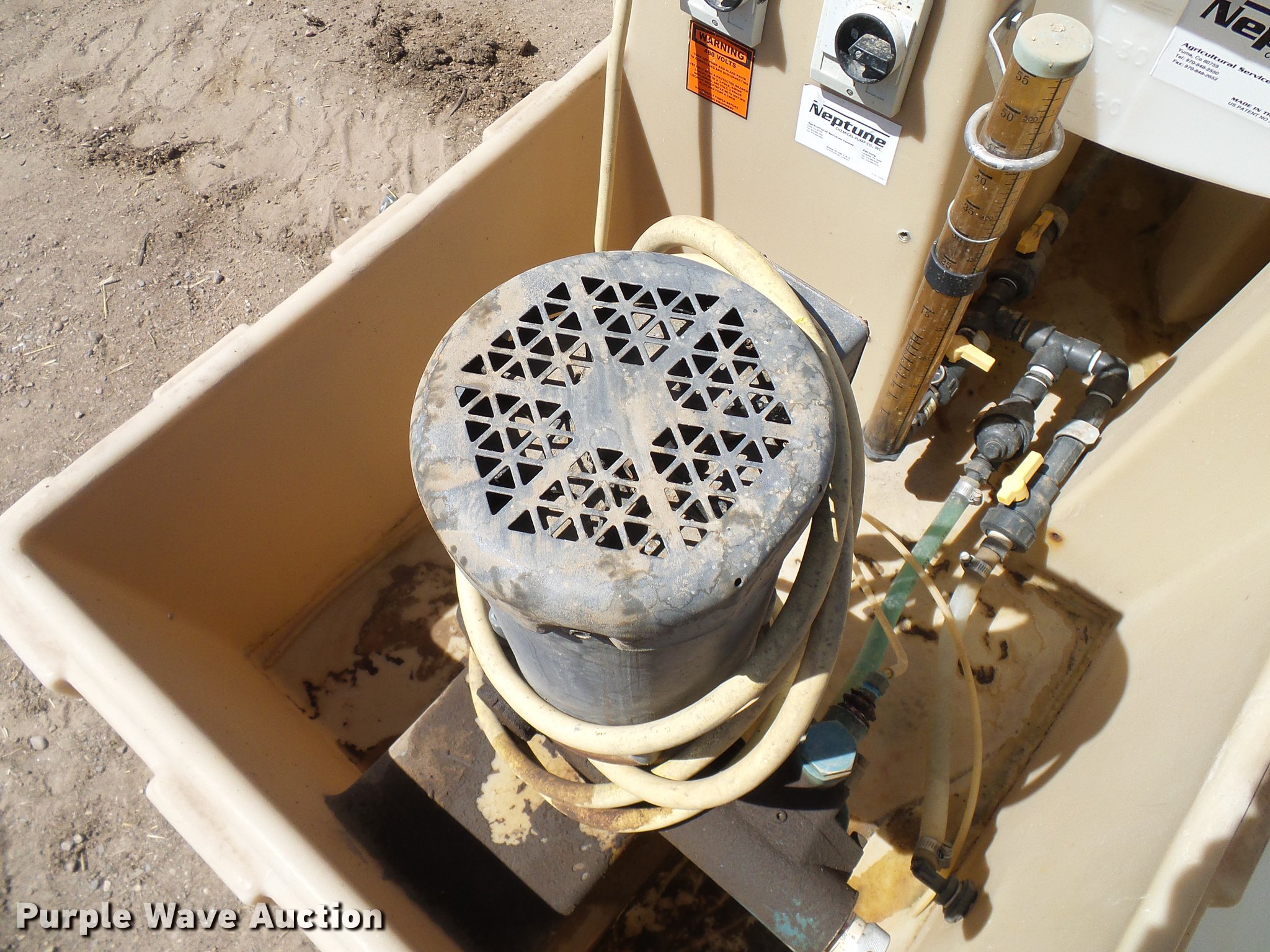 Purple Wave is selling a used Applicator Attach. in Colorado. This item is a Neptune chemigation system with the following: Neptune 532VS AC pump, Baldor electric pump motor, 0.5 HP, 115/230V, 11 gpm, 150 psi, Serial 176963, 95 gallon mix tank, Baldor electric mixer motor, 0.25 HP, 115/230V,