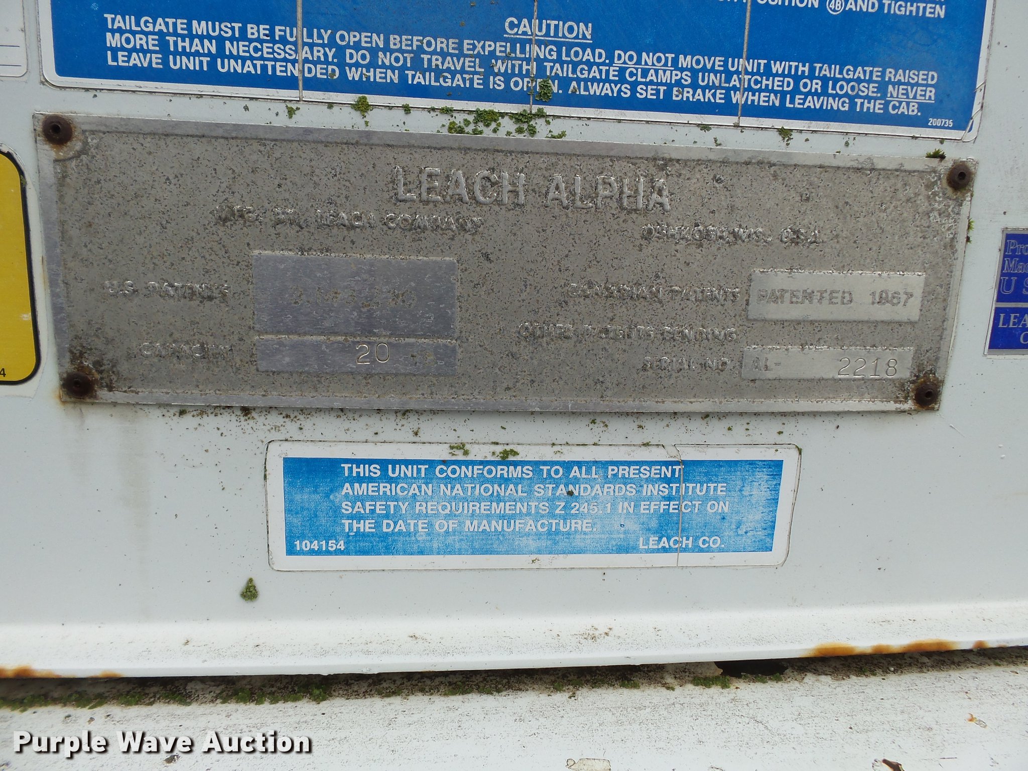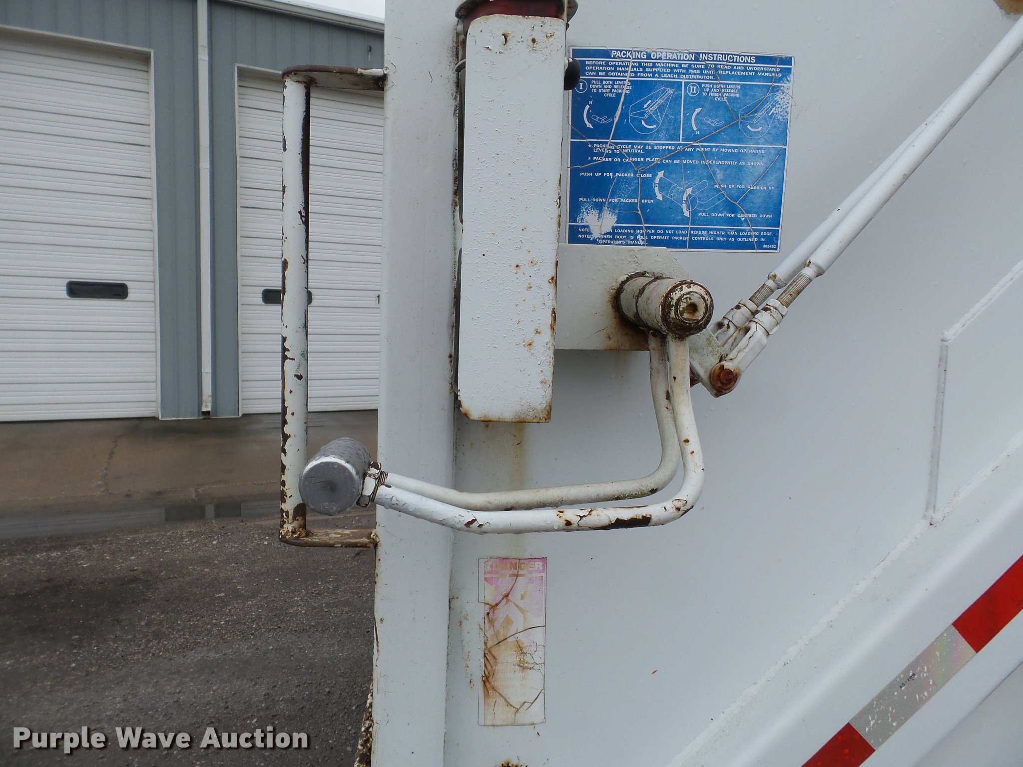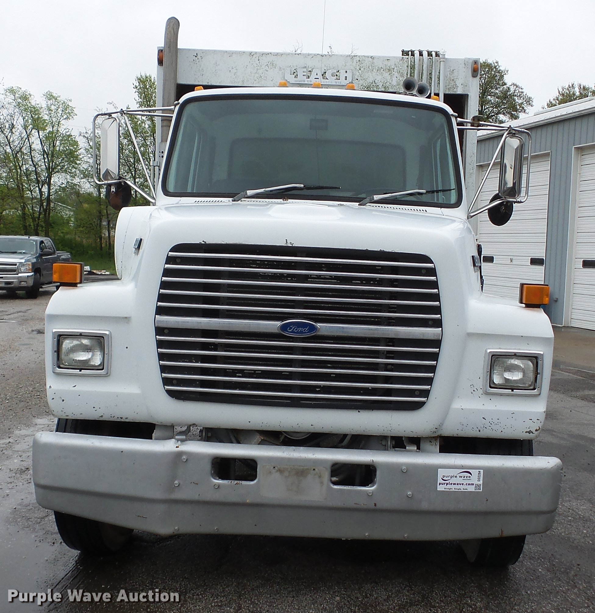 Purple Wave is selling a used Refuse Truck in Missouri. This item is a 1994 Ford L8000 refuse truck with the following: 100,458 miles on odometer, Cummins 8.3L L6 diesel engine, Serial 44908Z33, Allison automatic transmission, Single axle, Heat, Air suspension seat, PTO, Leech 20 refuse bed, 20 yd. capacity, Rear load, Serial 2218, Single fuel tank, Spring suspension, Air brakes, 204" wheelbase, 11R22.5 tires, GVWR 33,000 lbs