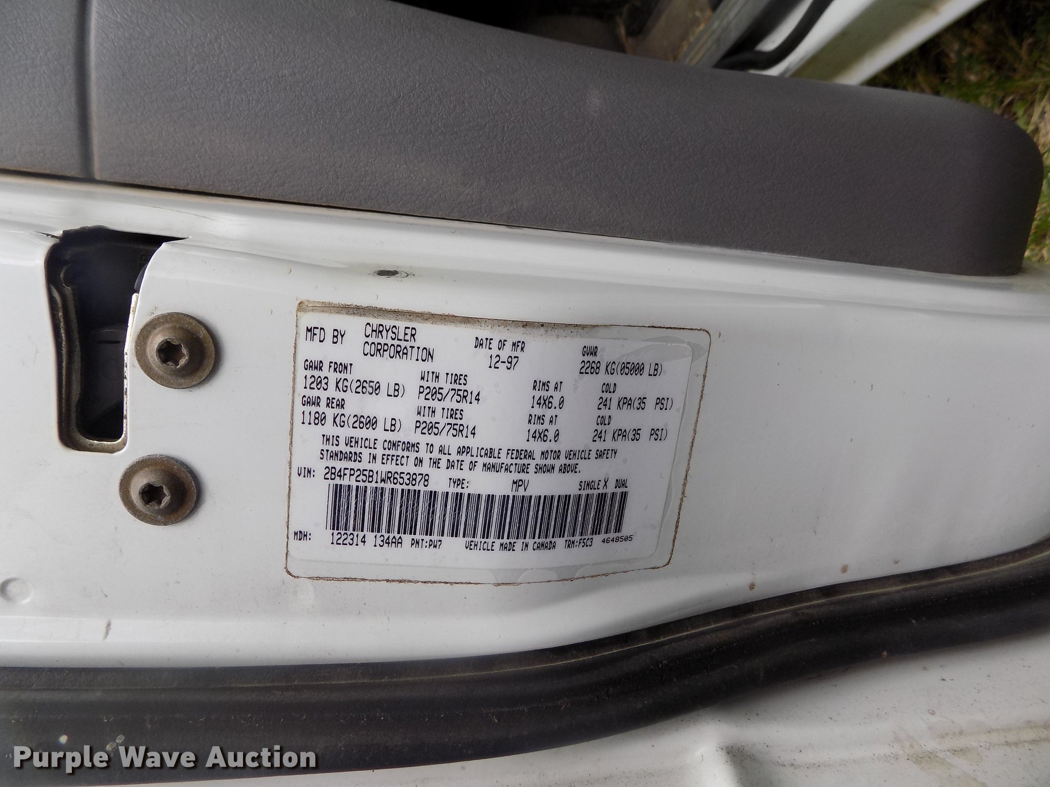 Purple Wave is selling a used Passenger Vehicle in Kansas. This item is a 1998 Dodge Caravan van with the following: Unknown miles on odometer, 2.4L L4 DOHC 16V gas engine, Automatic transmission, AC and heat, Cruise, 205/75R14 tires, Cracked windshield, Hail damage, No keys, Unknown operating condition