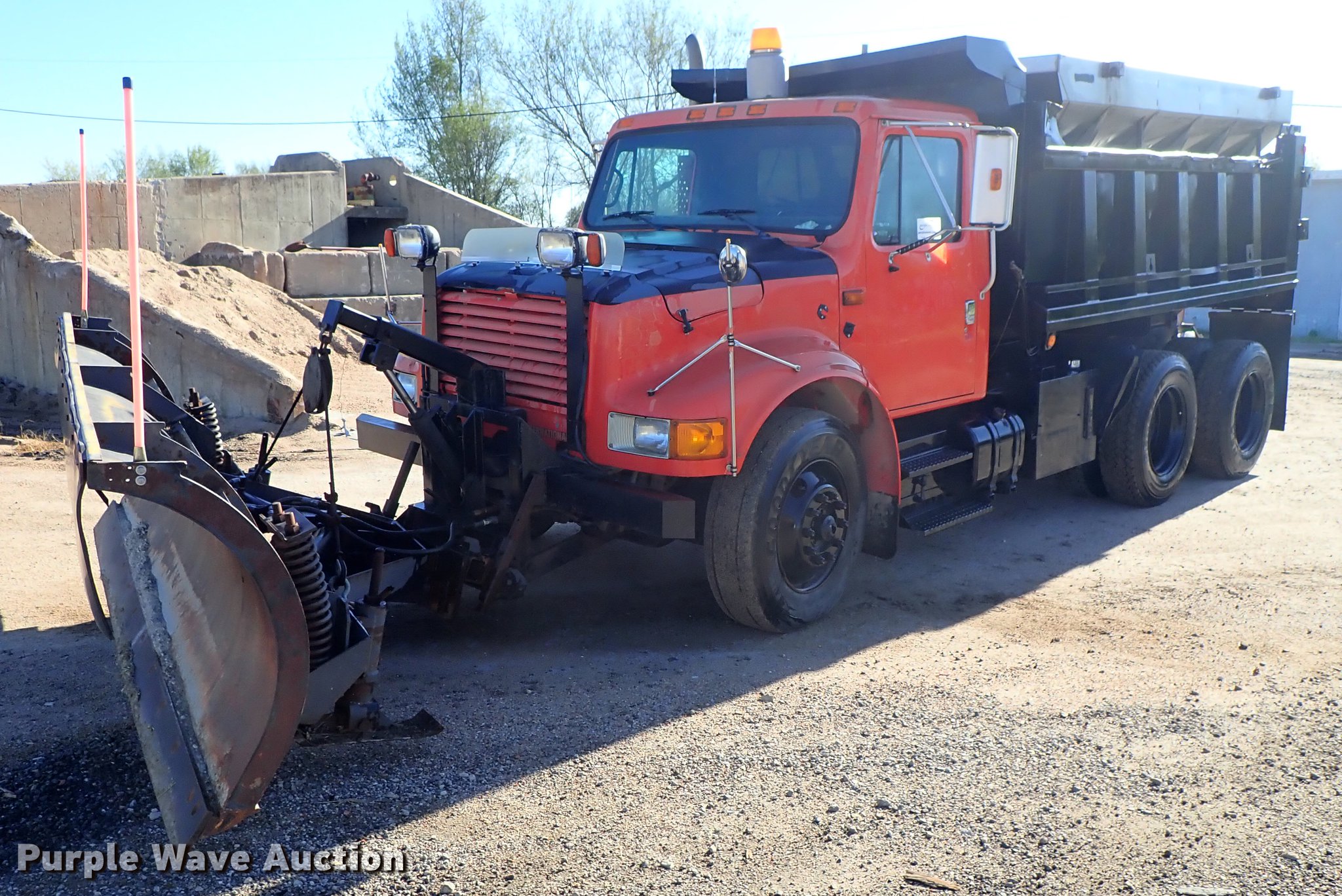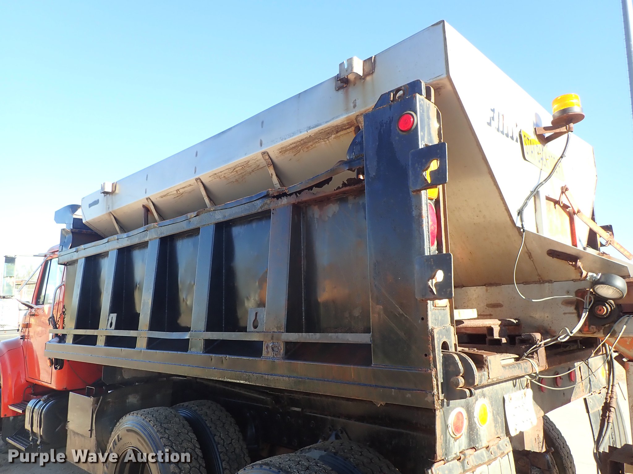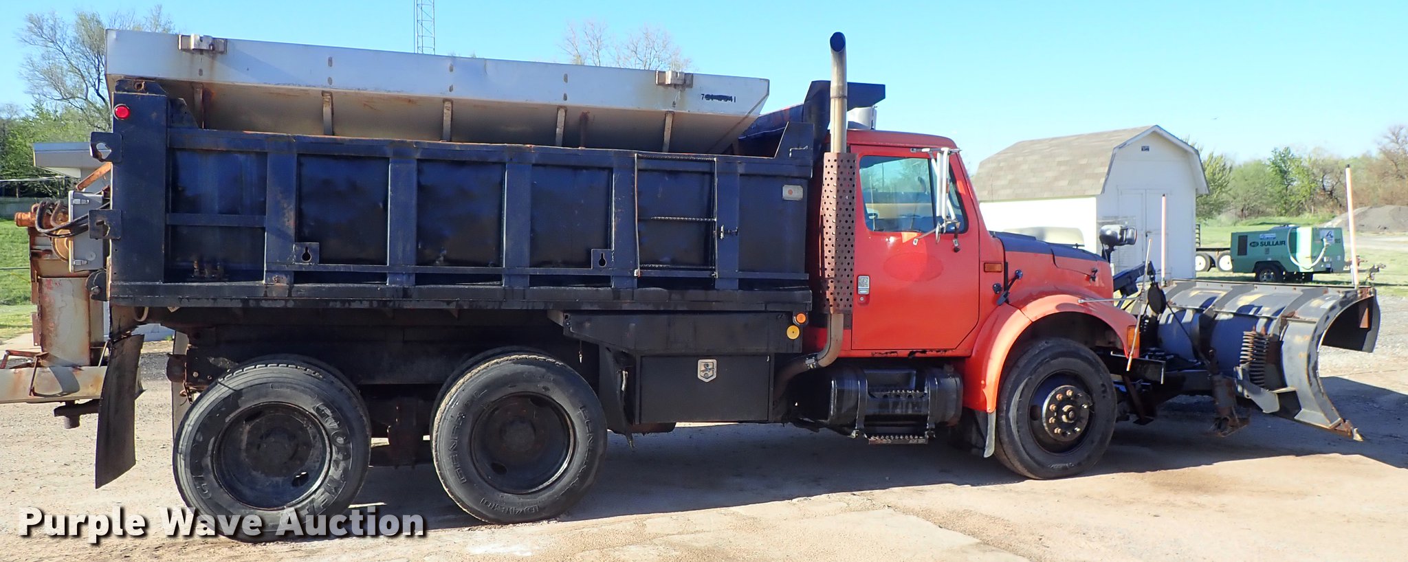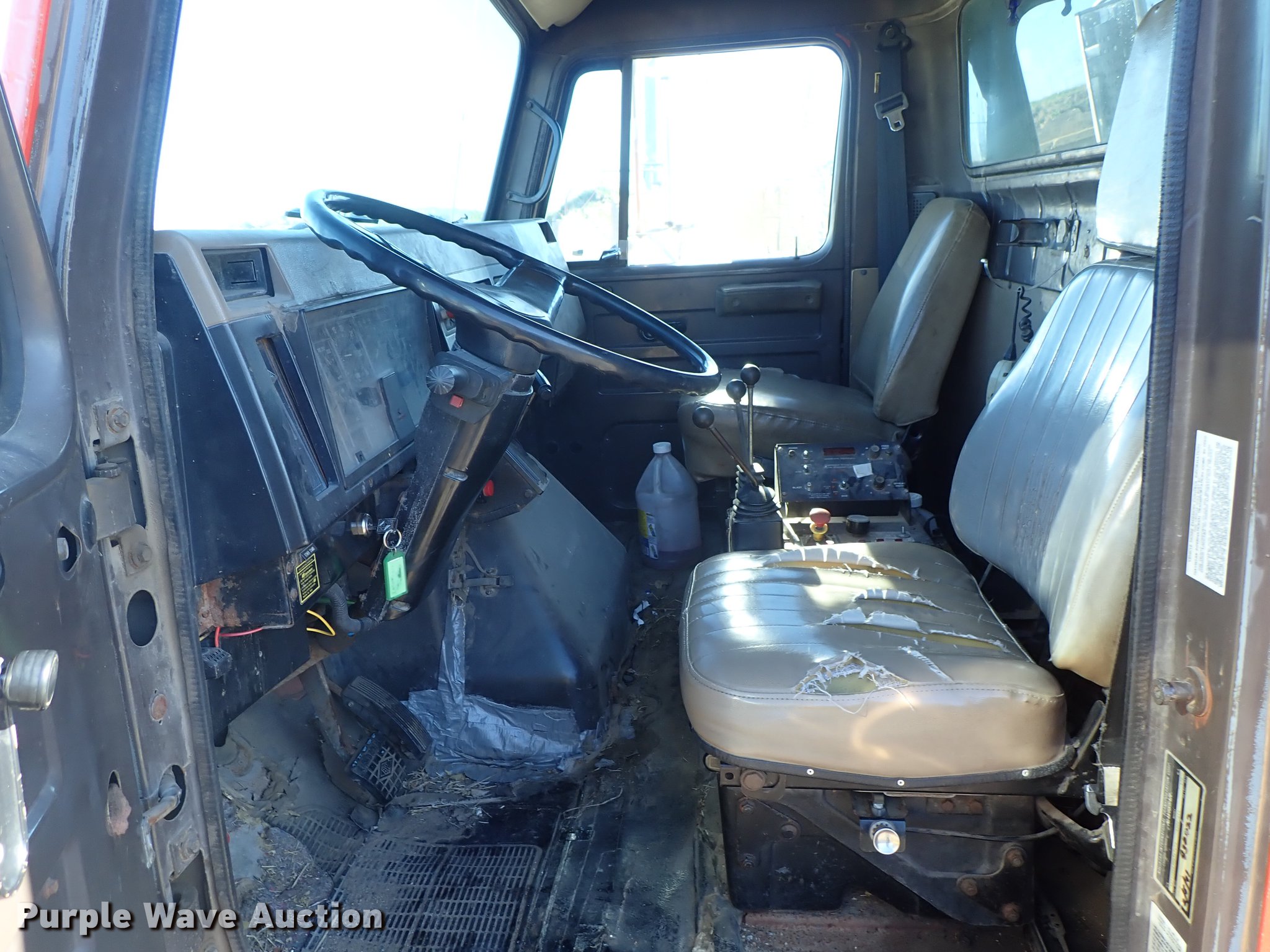 Purple Wave is selling a used Construction Dump Truck in Kansas. This item is a 1991 International 4900 dump truck with the following: 191,048 miles on odometer, International DT466 7.6L L6 diesel engine, Automatic transmission, Tandem axle, Heat, AM/FM, In-cab spreader controls, In-cab plow controls, Air suspension seat, PTO, 13'L x 8'W steel dump bed, Flink stainless steel spreader, 13'L, Seven cu. yd. capacity, Single spinner, 11'W snow plow, Bolt-on cutting edge, Plow lights, Pintle hitch, Trailer wiring, Spring suspension, Air brakes, 295/75R22.5 tires, Front leaf spring cracked