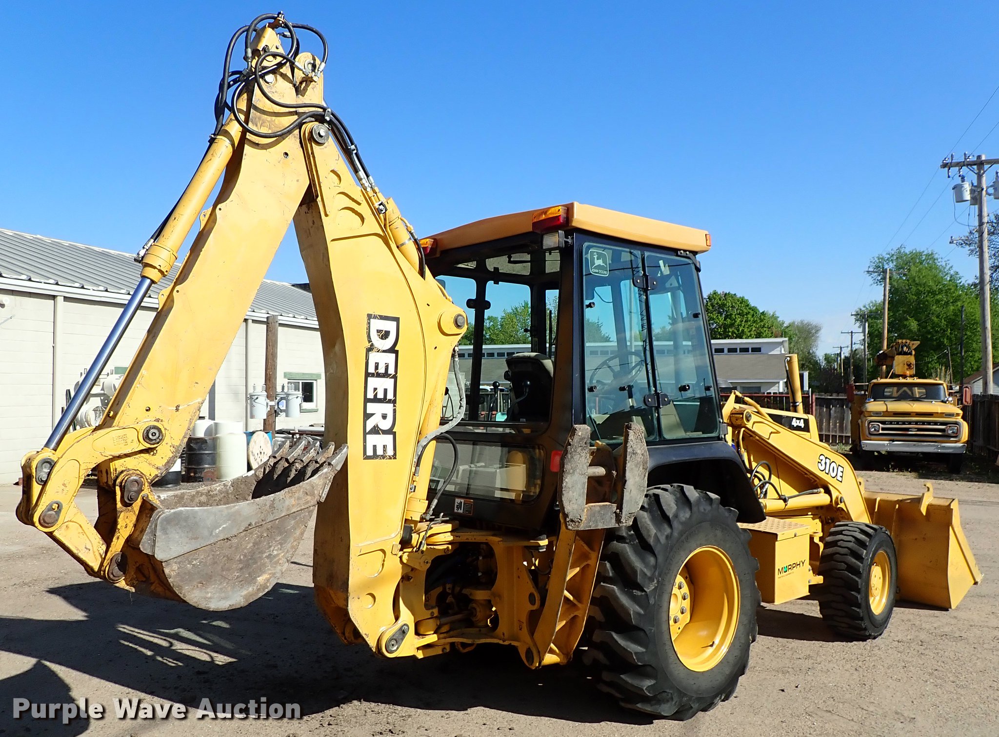 Purple Wave is selling a used Tractor Loader Backhoe in Kansas. This item is a 1997 John Deere 310E backhoe with the following: 3,211 hours on meter, John Deere four cylinder diesel engine, Shuttle shift transmission, 4F-4R gears, Four wheel drive, Enclosed cab, Heat, Wobble stick backhoe controls, 84"W loader bucket, Bolt-on cutting edge, Extendable stick, Backhoe bucket, 24"W, (5) teeth, 12-16.5 front tires, 16.9-24 rear tires, Serial T0310EX827594