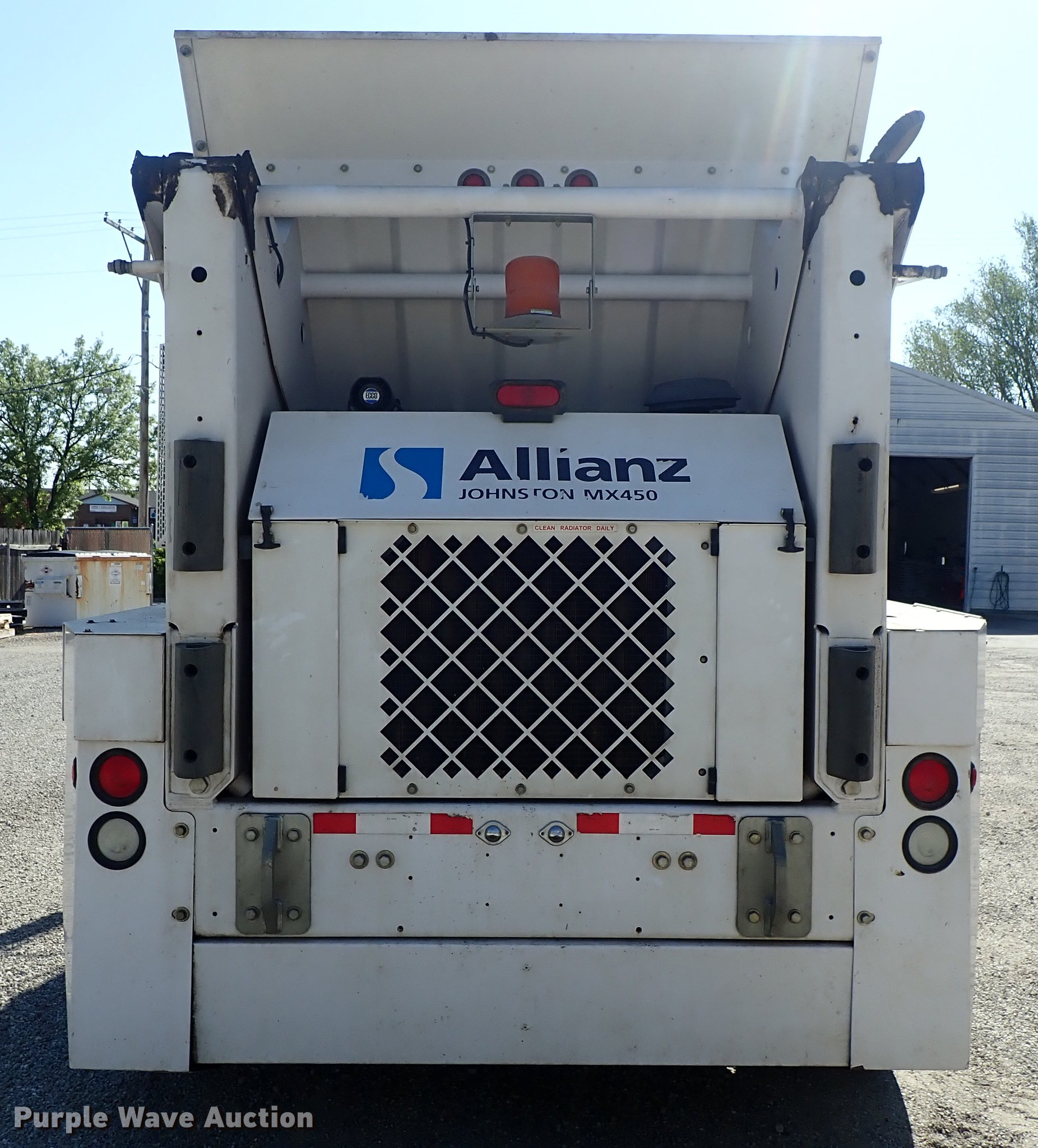 Purple Wave is selling a used Sweeper in Kansas. This item is a 2009 Allianz Johnston MX450 street sweeper with the following: 14,802 miles on odometer, 2,772 hours on meter, John Deere four cylinder diesel engine, Automatic transmission, Enclosed cab, AC and heat, Front and rear work lights, Beacon light, Vacuum, 60" main broom, 36" diameter left gutter broom, 36" diameter right gutter broom, Hydraulic broom, lift, tilt, and rotation, Hydraulic dumping hopper, Water system, 10R17.5 front tires, 11R22.5 rear tires