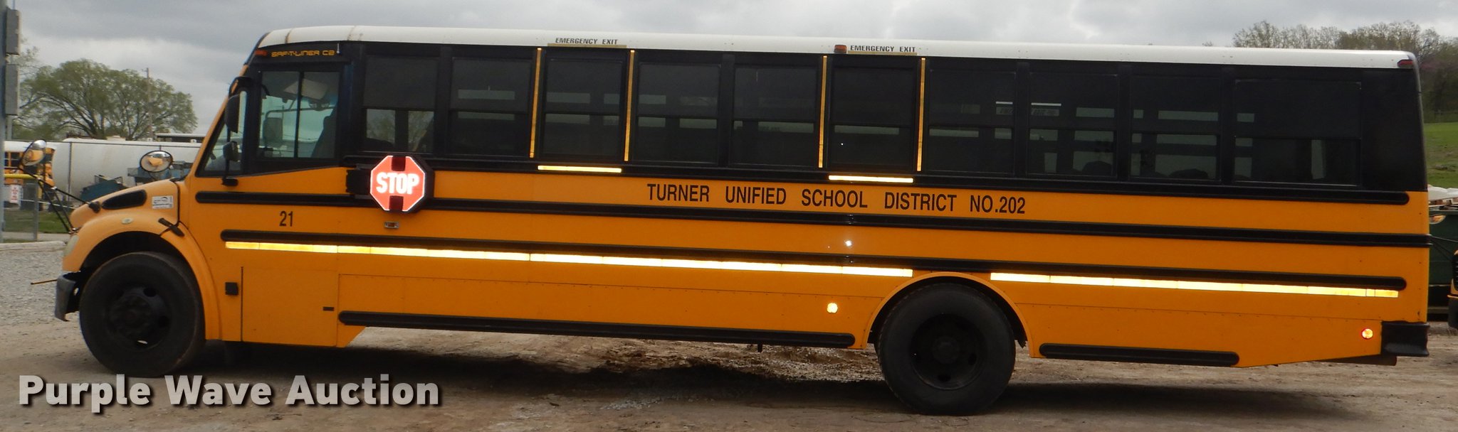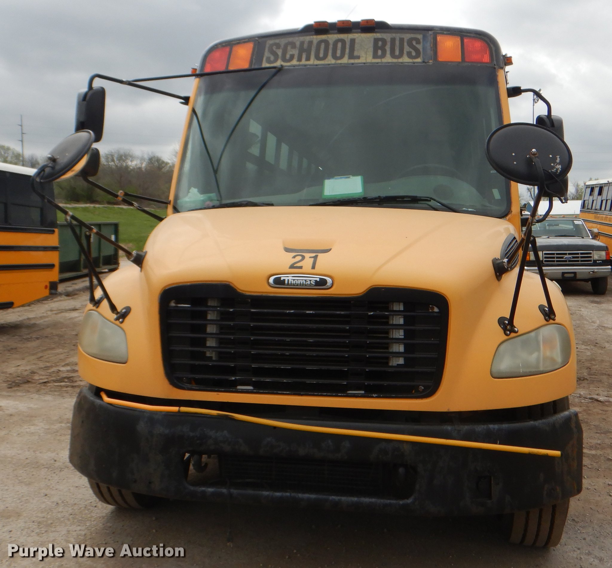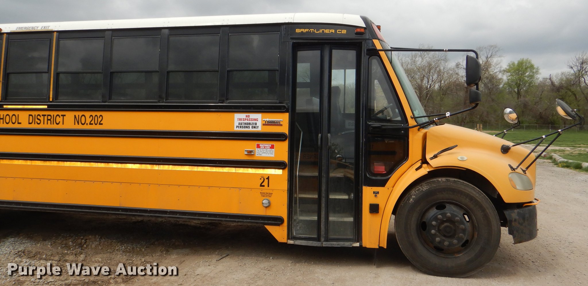 Purple Wave is selling a used Bus in Kansas. This item is a 2006 Freightliner B2 Thomas school bus with the following: 126,969 miles on odometer, Caterpillar C7 Acert 7.2L L6 diesel engine, Automatic transmission, Single axle, Heat, AM/FM/CD, Heated mirrors, 67 passenger capacity, Ceiling, rear, and side emergency exits, Lighted stop sign, Crossing arm, Backup alarm, Block heater, Front and rear tow hooks, Spring suspension, Hydraulic brakes, 258" wheelbase, Continental 11R22.5 tires, ABS light on, Electrical issues, Dead battery, Decals will be painted over, Unit# 21