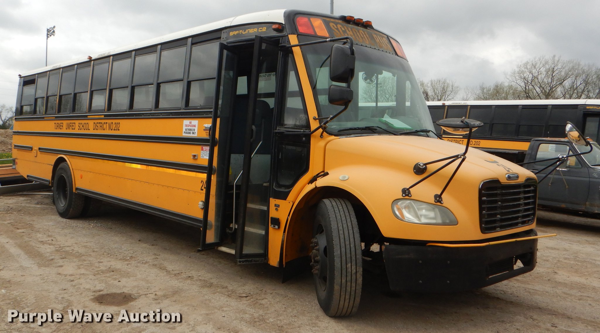Purple Wave is selling a used Bus in Kansas. This item is a 2006 Freightliner B2 Thomas school bus with the following: 135,627 miles on odometer, Caterpillar C7 Acert 7.2L L6 diesel engine, Automatic transmission, Single axle, Heat, Cruise, AM/FM/CD, Heated mirrors, 67 passenger capacity, Ceiling, rear, and side emergency exits, Lighted stop sign, Crossing arm, Backup alarm, Block heater, Front and rear tow hooks, Spring suspension, Hydraulic brakes, 258" wheelbase, Hankook 11R22.5 tires, ABS light on, Transmission issues, Dead battery, Unit# 24