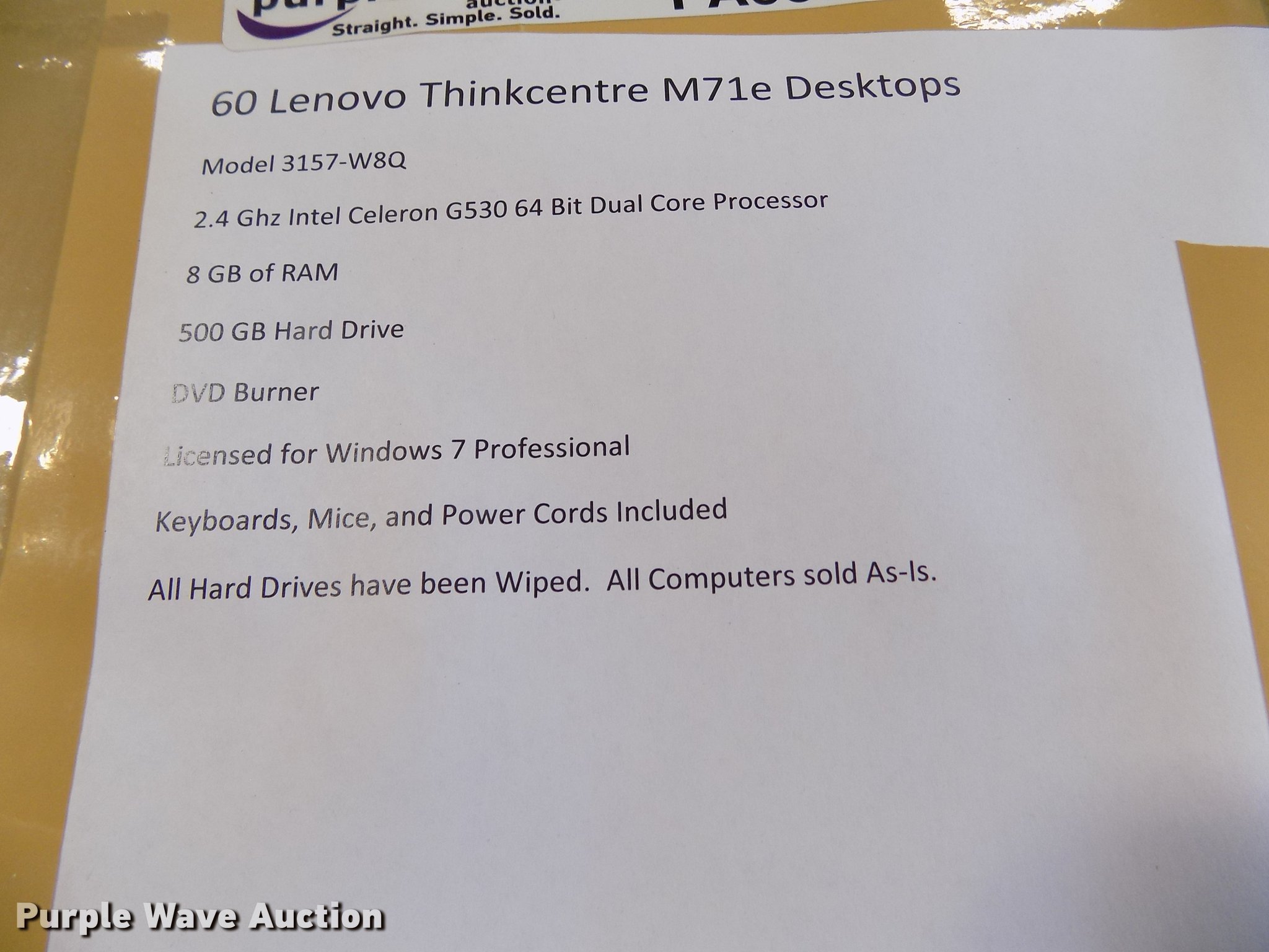 Purple Wave is selling a used Computers in Kansas. This item is a (60) Lenovo ThinkCentre m71e CPUs with the following: Model 3157-W8Q, Intel Celeron G530 64-bit 2.4 GHz dual core processors, 8 GB RAM, 500 GB HDD, DVD burner, Keyboards, Mice, Power cords, Hard drives have been reformatted and no operating system installed