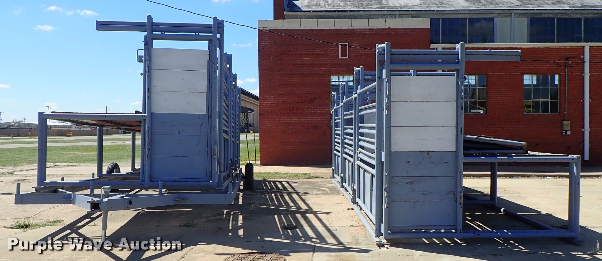 Purple Wave is selling a used Livestock Equip. in Kansas. This item is a (6) WW bucking chutes with the following: (3) left hand delivery, (3) right hand delivery, Full platforms, Rolling block doors, Shop built roll up transport dolly, Pin hitch