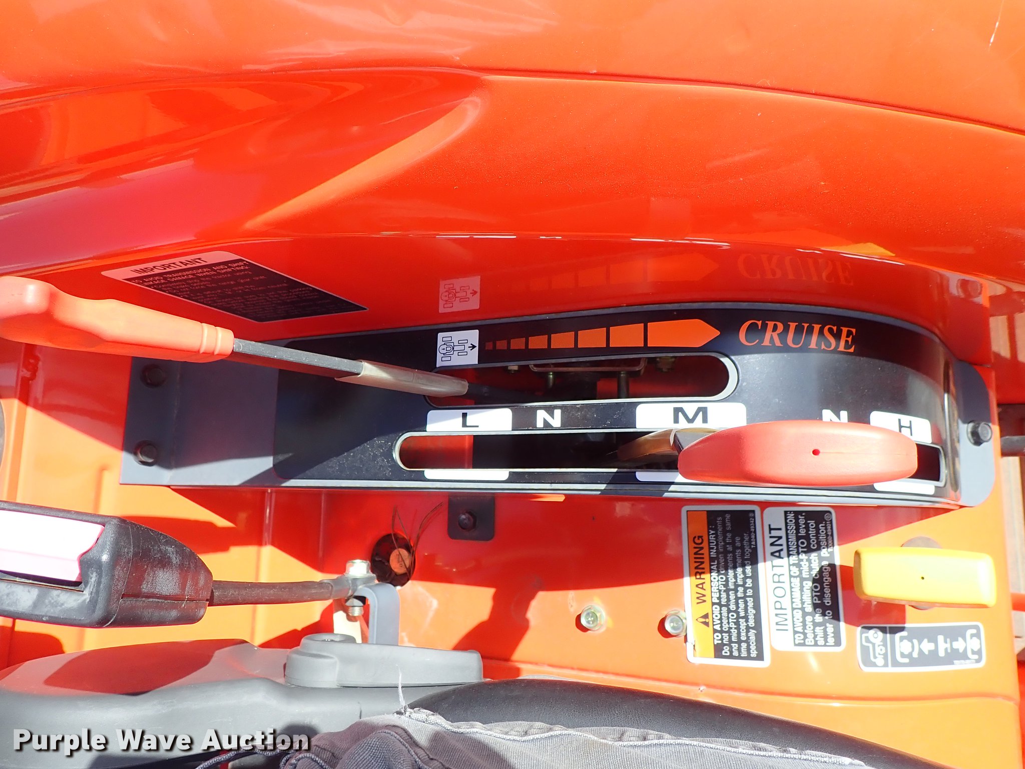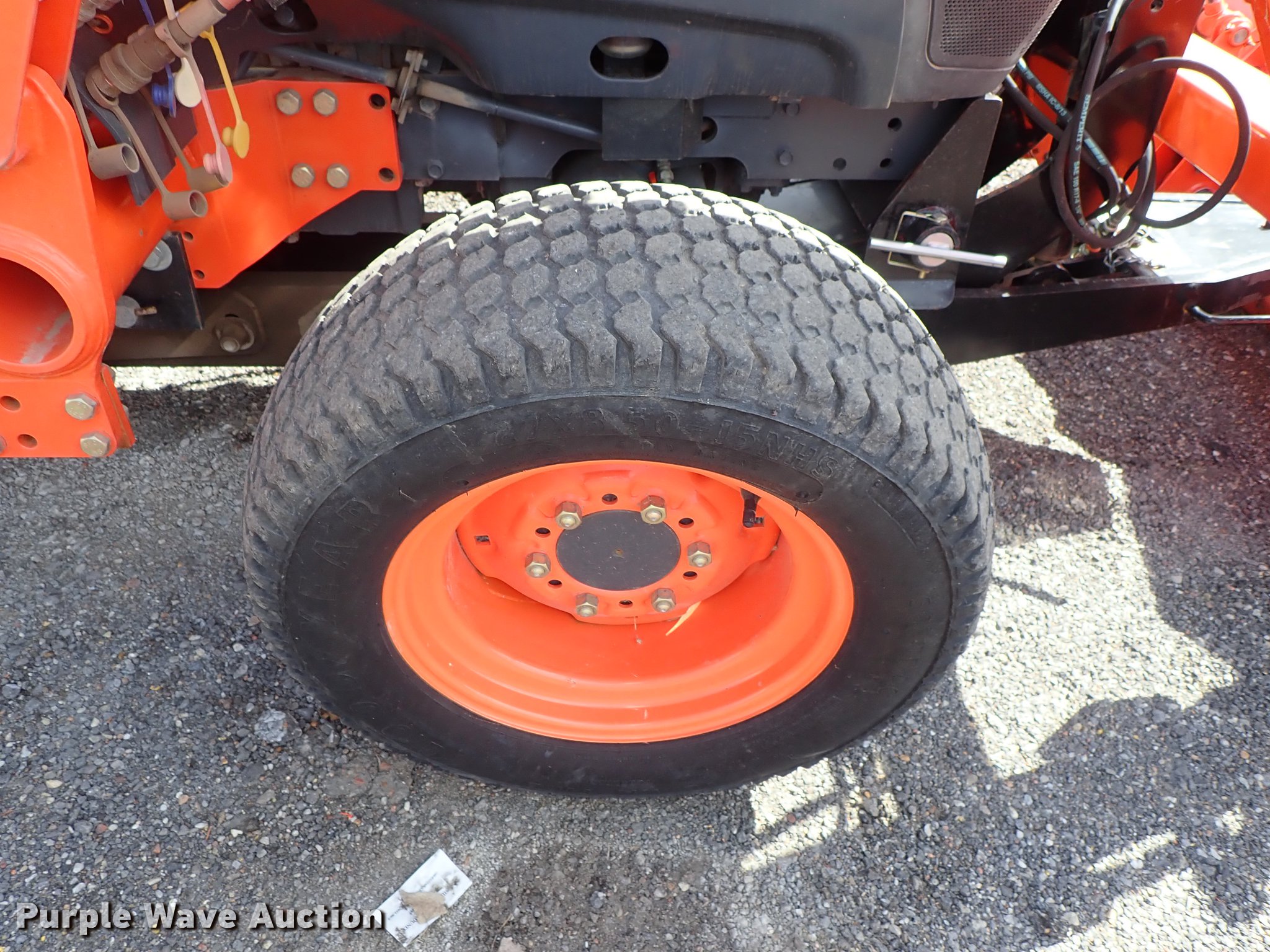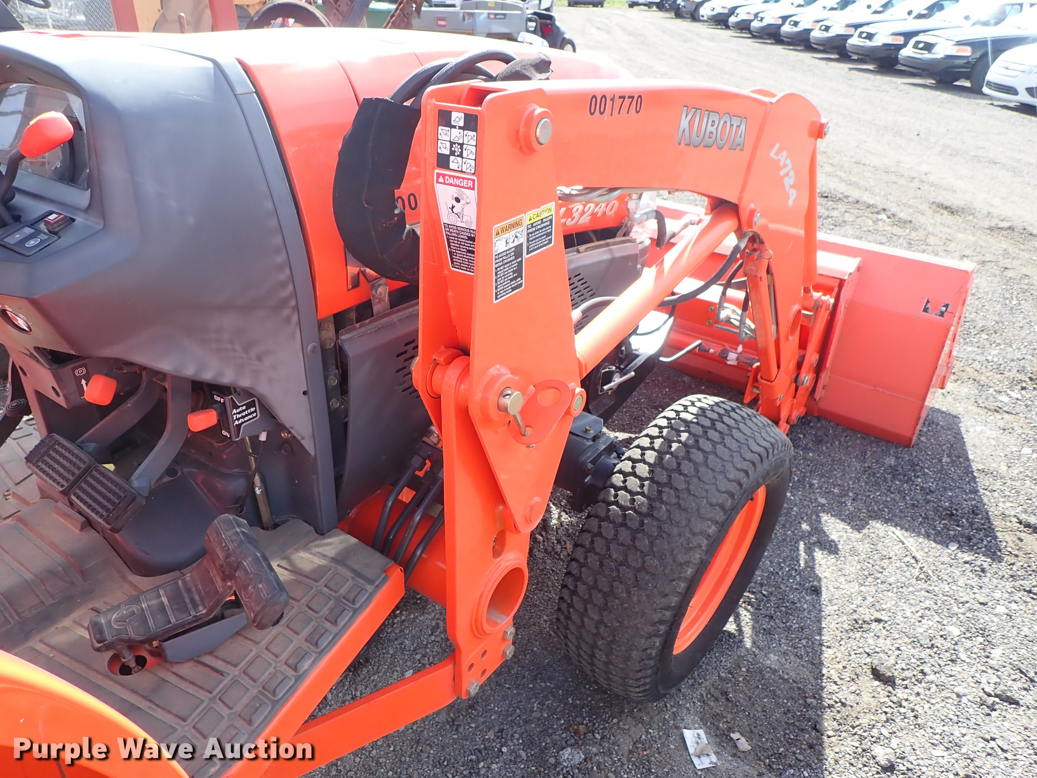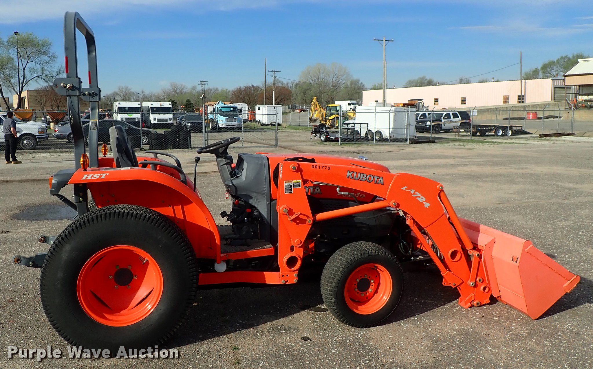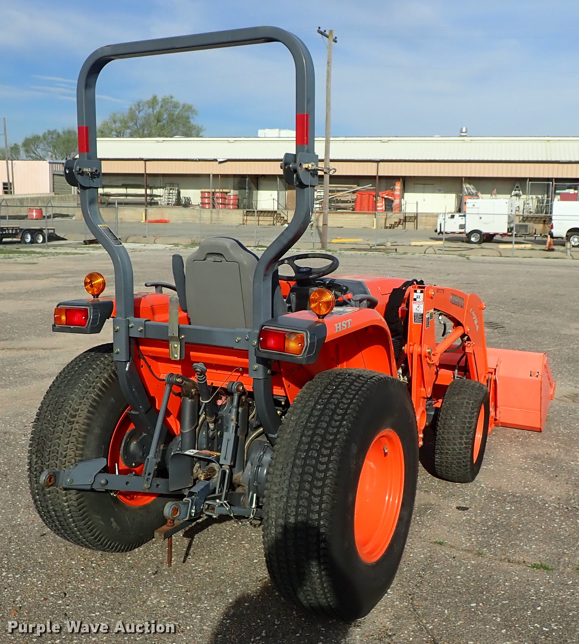 Purple Wave is selling a used Tractor in Kansas. This item is a 2008 Kubota L3240 HFWD tractor with the following: 200 hours on meter, Three cylinder diesel engine, Hydrostatic transmission, 3F-3R gears, Two post roll bar, Tilt steering wheel, Cruise, Three point, Kubota LA724 loader, 72"W bucket, Joystick controls, Kubota L2172A snow blade, 72"W, Joystick blade control, Top link, 540 PTO, Counter weight bucket, Three point, 27x8.50-15 NHS front tires, 355/80D20 rear tires, Dash glass cracked, Serial 35820, Unit# 001770
