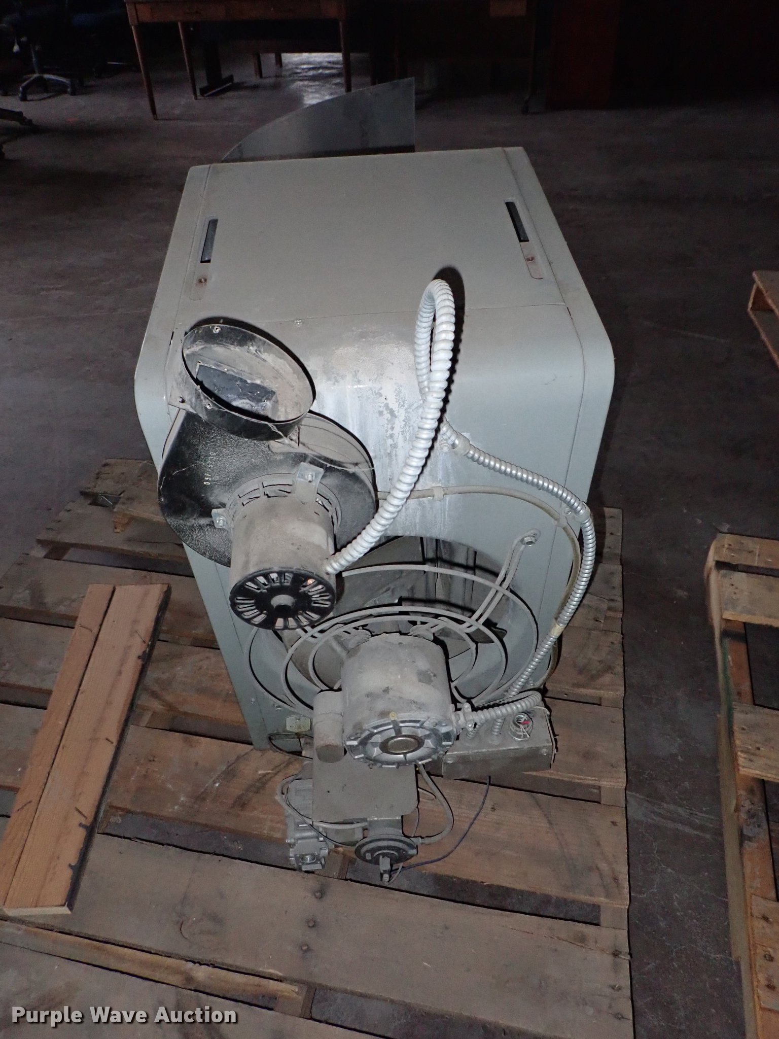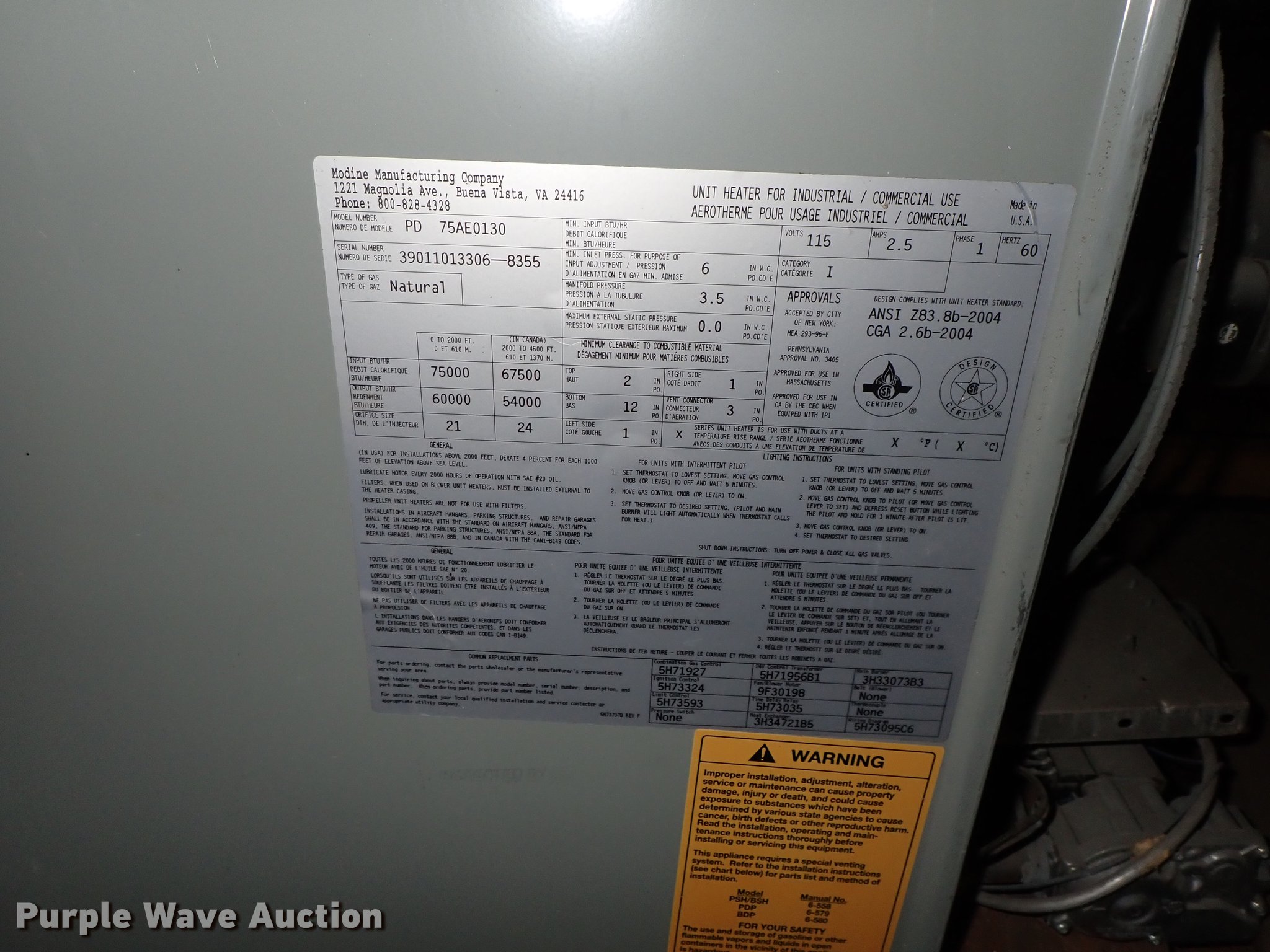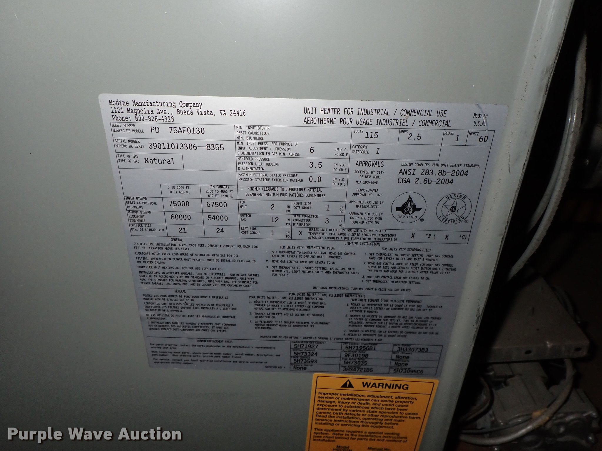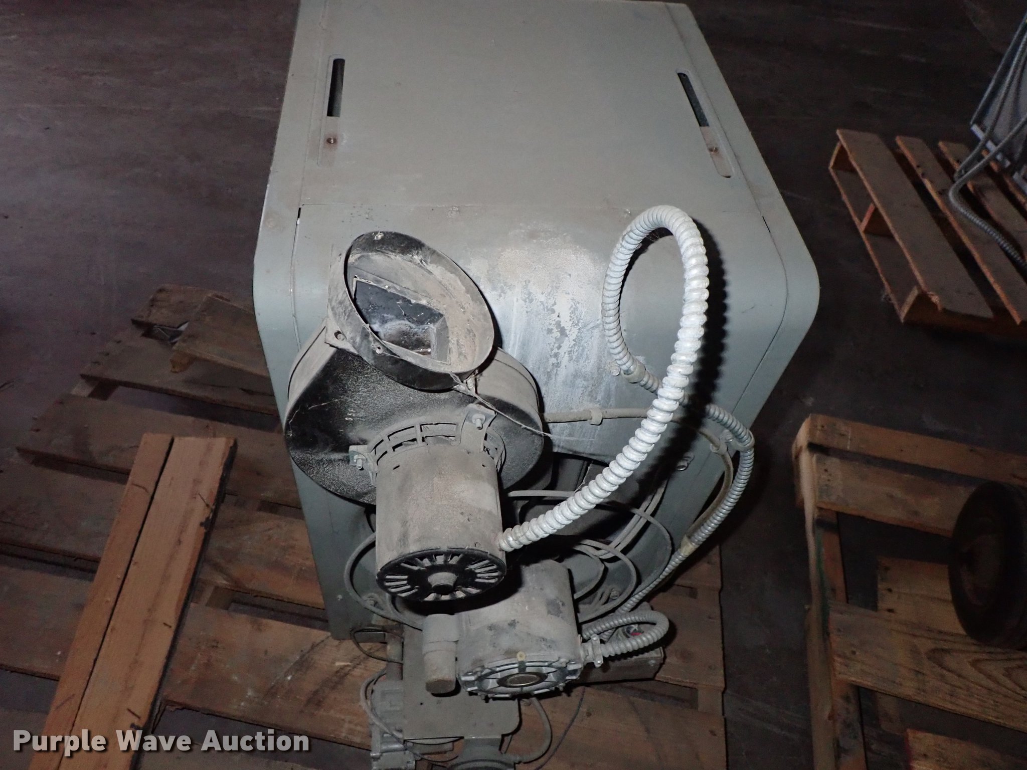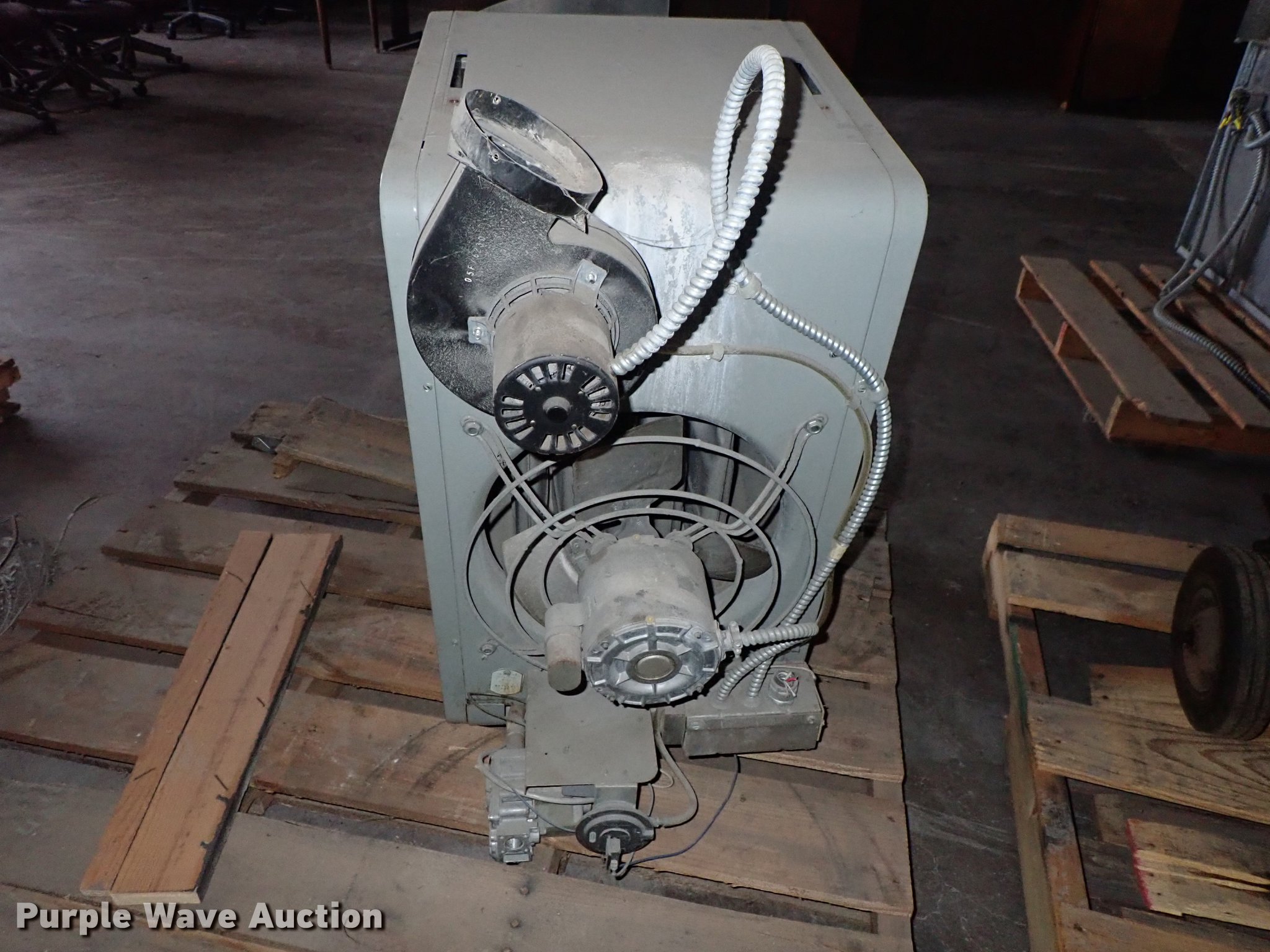 Purple Wave is selling a used Portable Heater or Fan in Kansas. This item is a Modine PD75AE0130 High Efficiency II heater with the following: 115V, 2.5 amp, Single phase, Natural gas fired, Unknown operating condition
