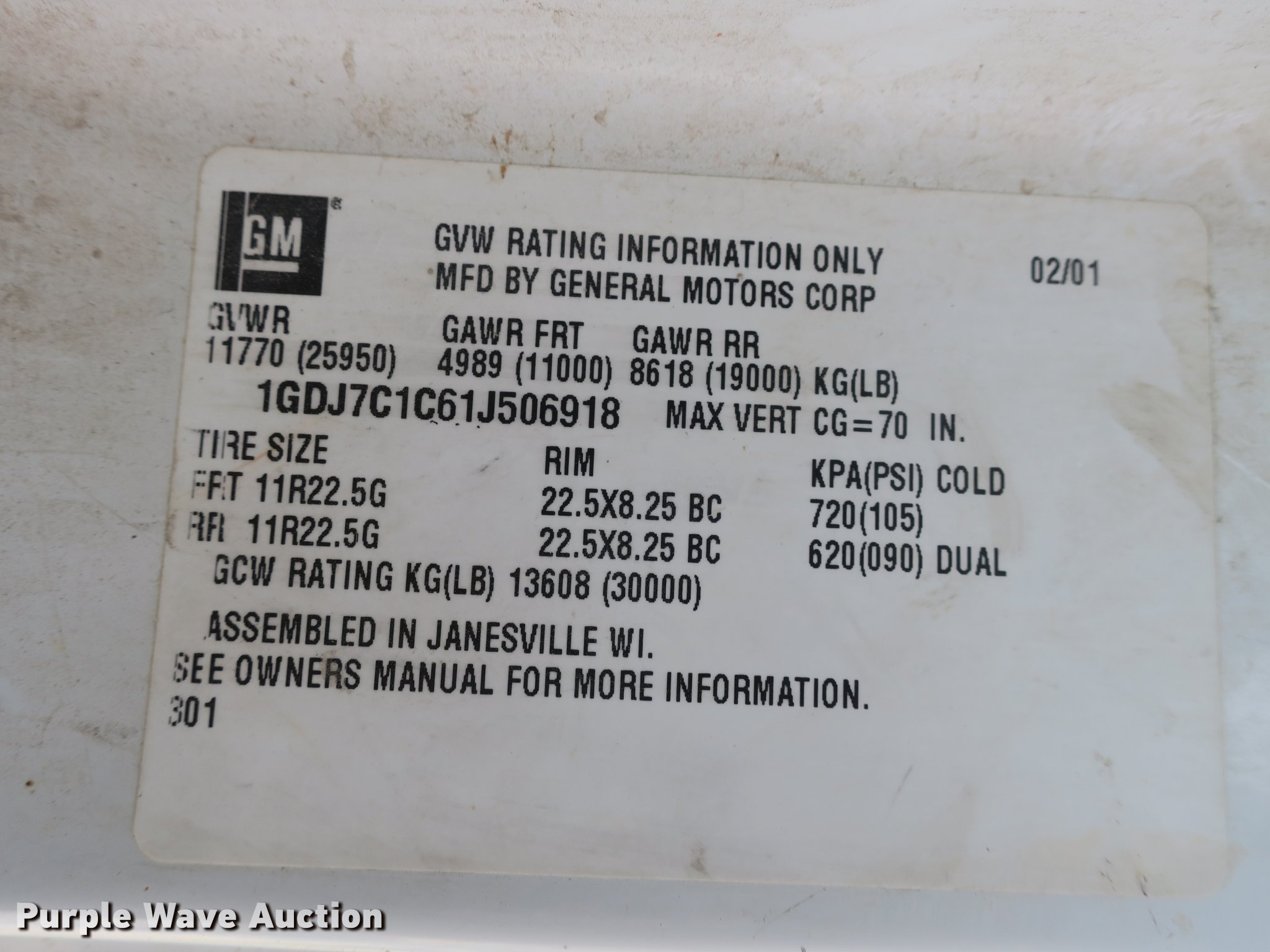 Purple Wave is selling a used Box Truck in Missouri. This item is a 2001 GMC T6500 box truck with the following: 307,196 miles on odometer, Caterpillar 3126 7.2L L6 diesel engine, Automatic transmission, Single axle, Heat, AM/FM, Suspension seat, Supreme box bed, 16'L x 90"W, Roll-up rear door, Serial Y222030, Single fuel tank, Spring suspension, Hydraulic brakes, 11R22.5 tires, GVWR 25,950 lbs