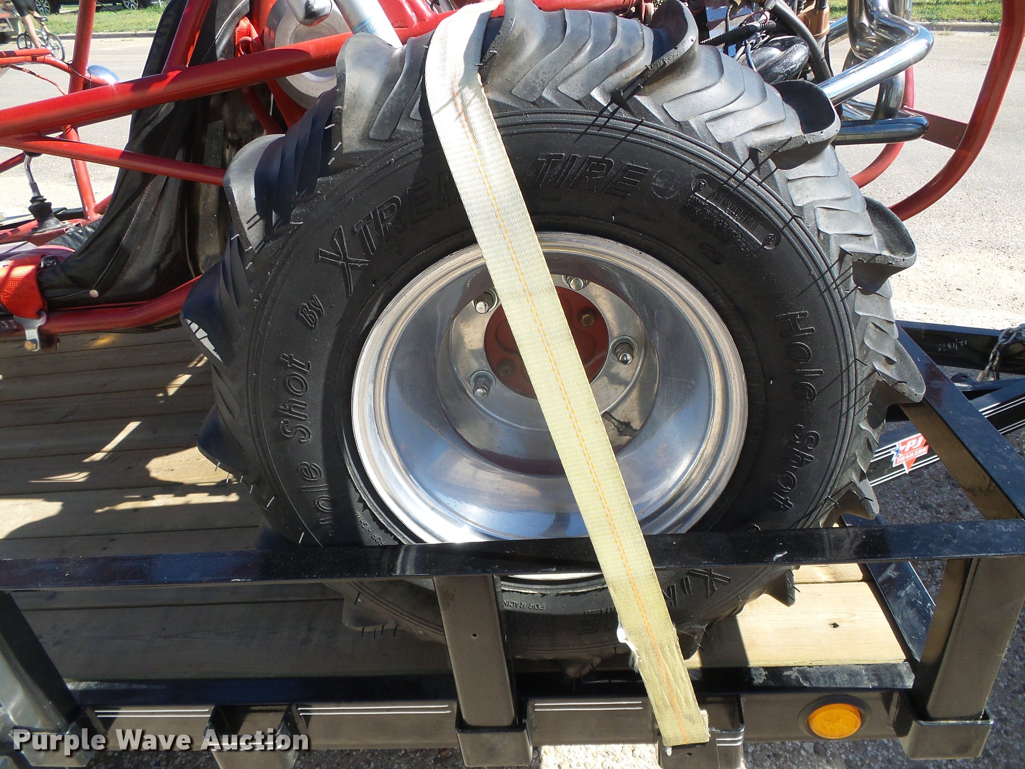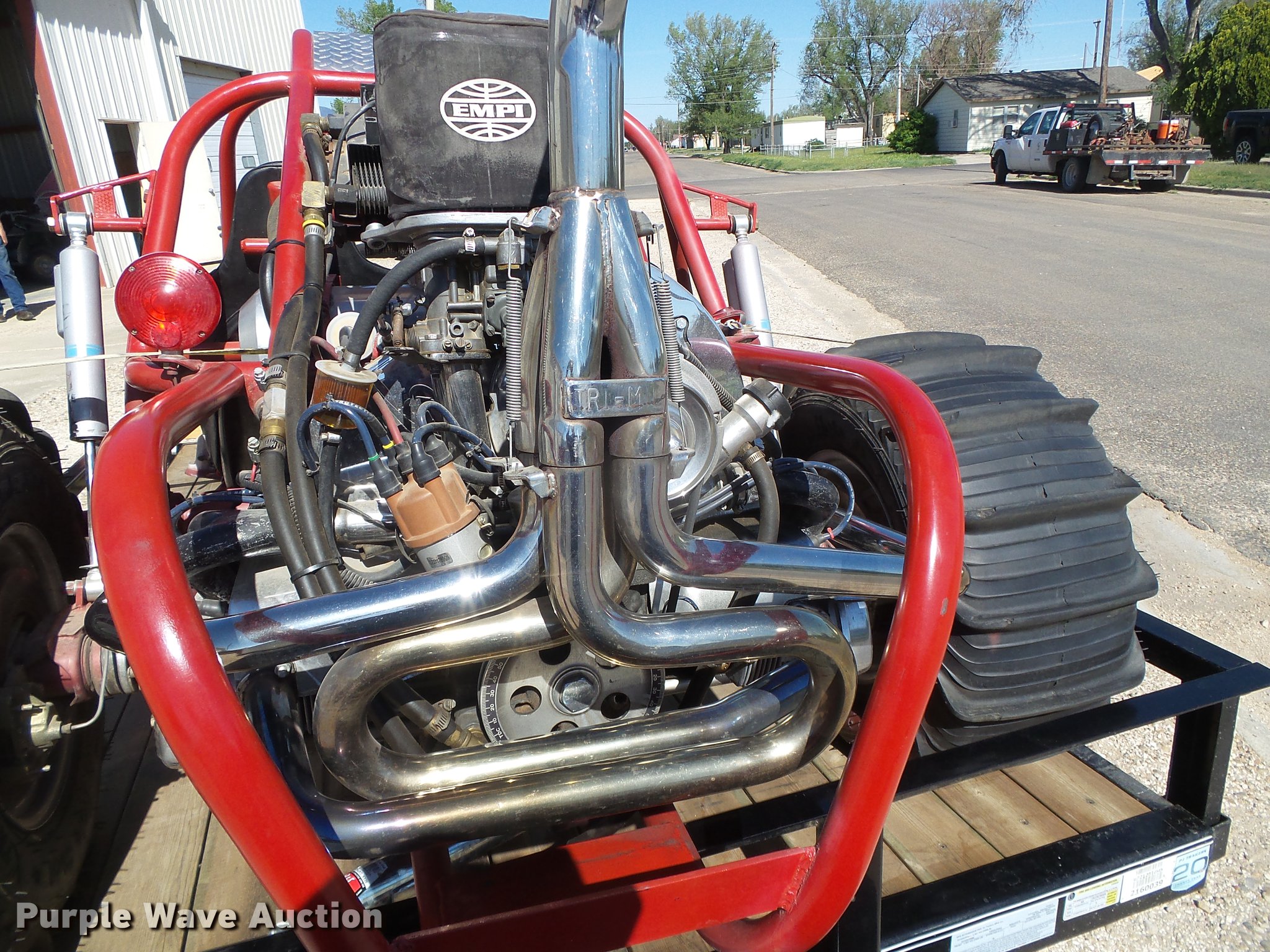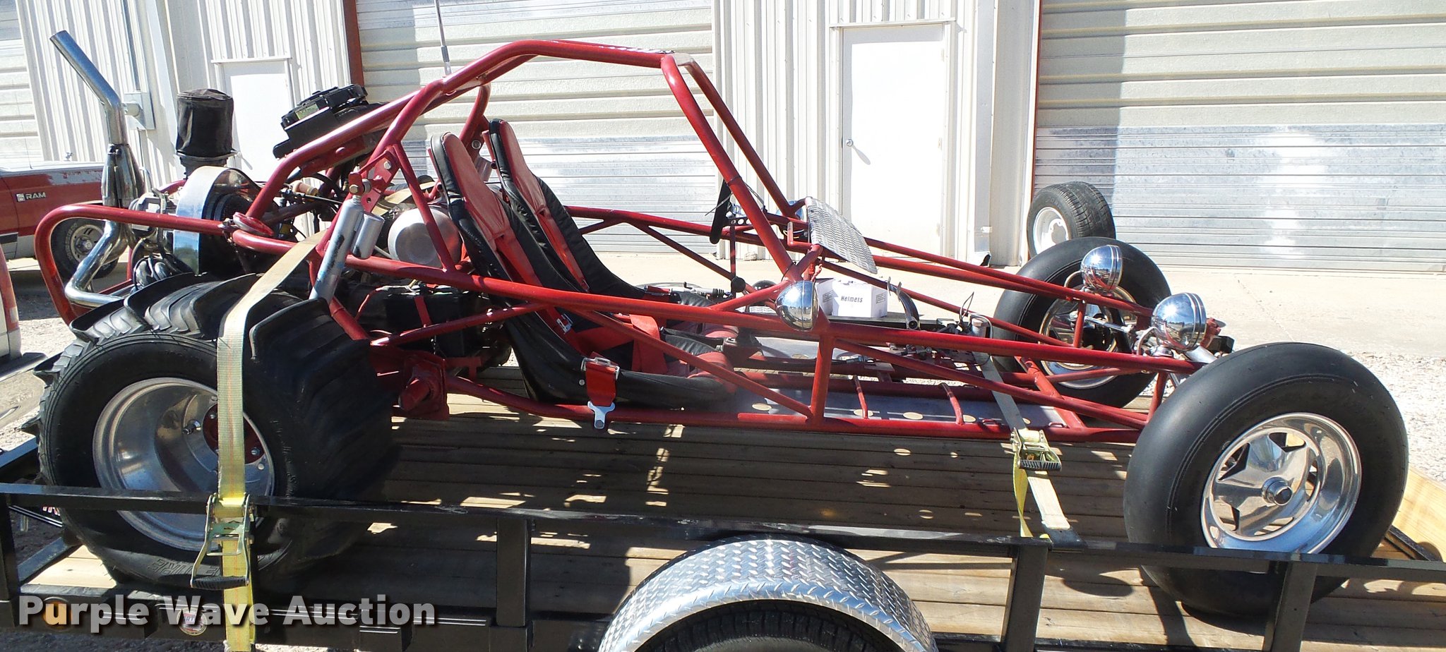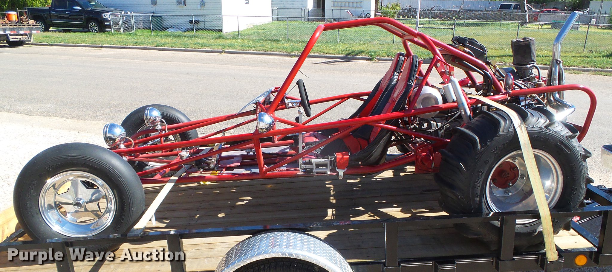 Purple Wave is selling a used Sporting Goods in Oklahoma. This item is a VW dune buggy and trailer with the following: Four cylinder gas engine, IRS transmission, Lights, Aluminum wheels, 6.80-15 smooth front tires, 13.50-15 paddle track rear tires, (4) Cooper Cobra P275/60R15 tires, (3) helmets