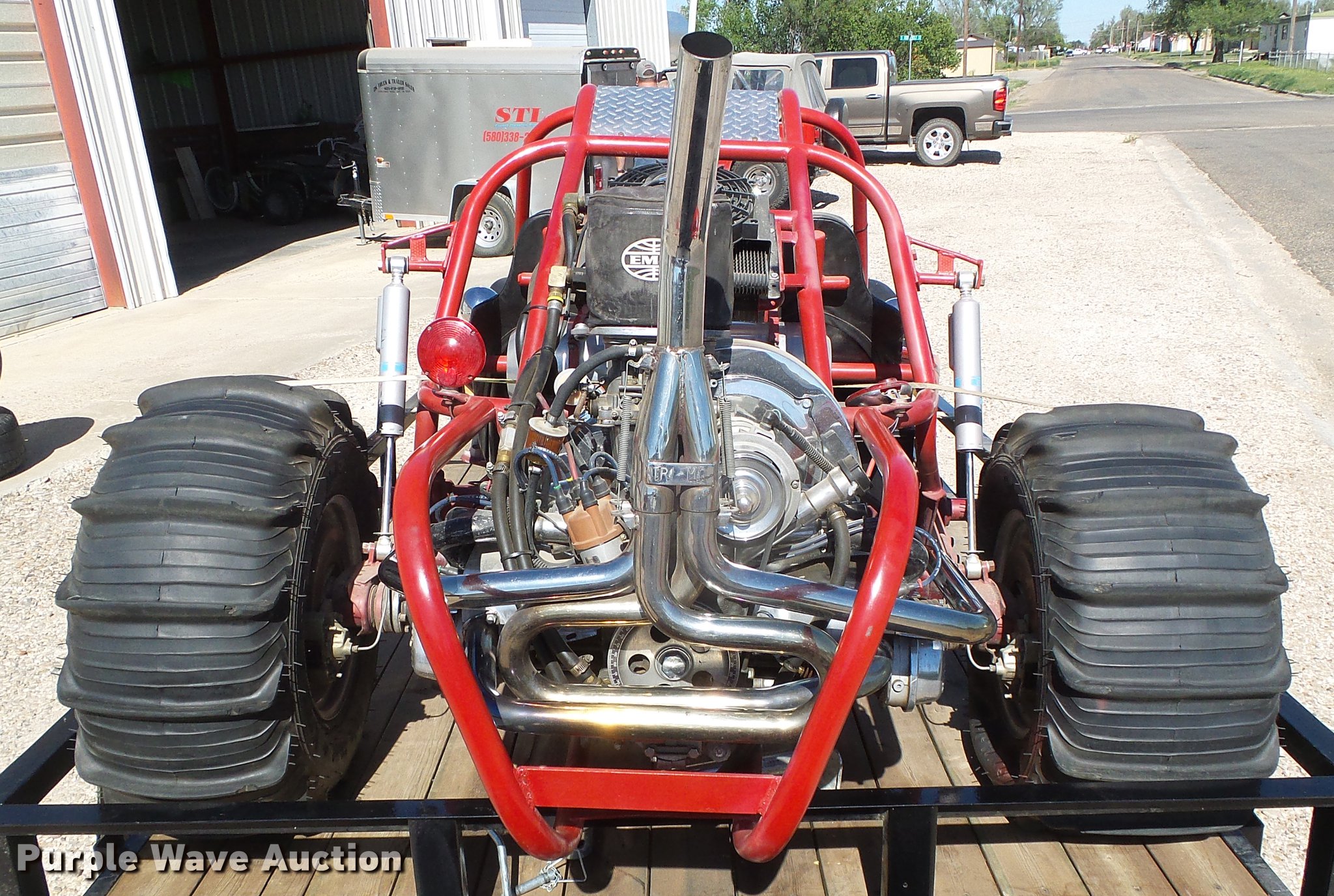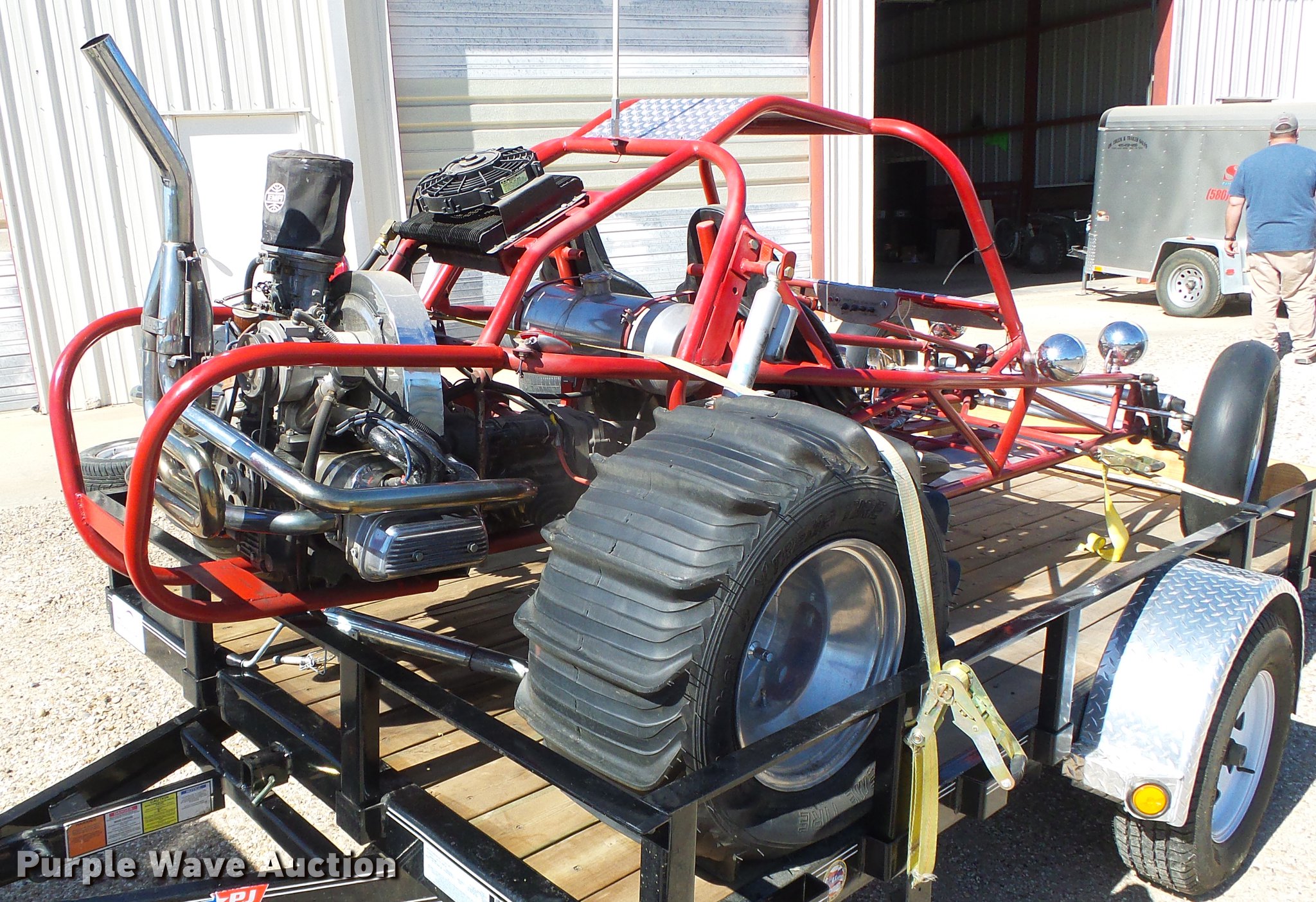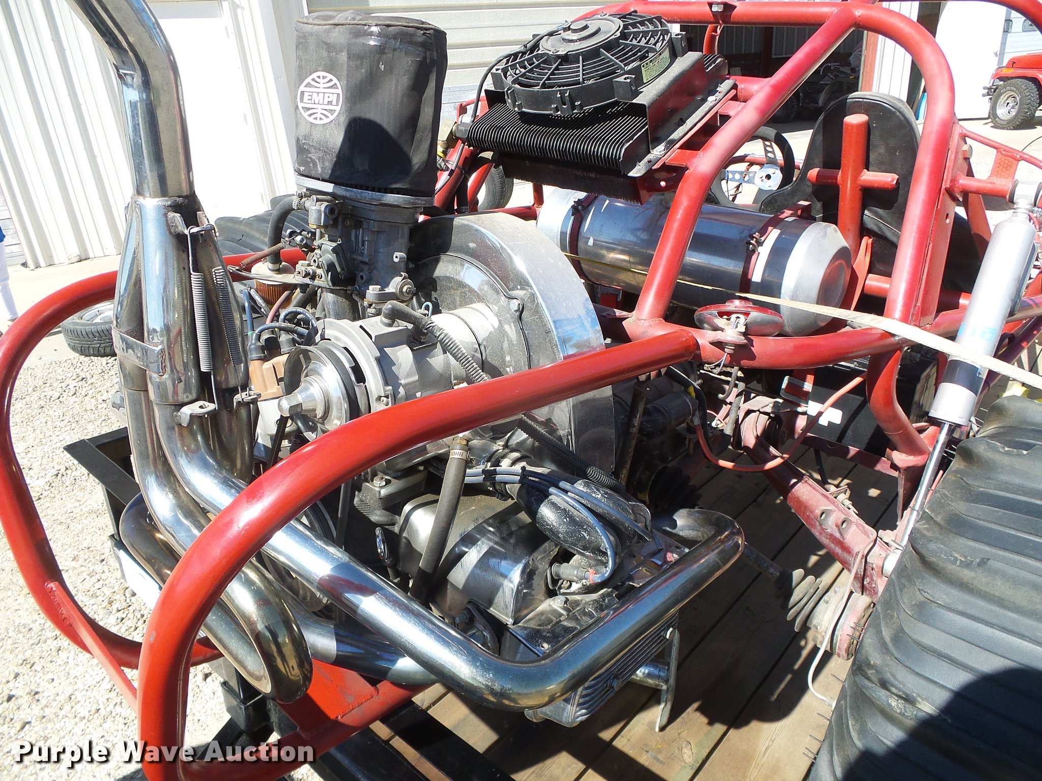 Purple Wave is selling a used Sporting Goods in Oklahoma. This item is a VW dune buggy and trailer with the following: Four cylinder gas engine, IRS transmission, Lights, Aluminum wheels, 6.80-15 smooth front tires, 13.50-15 paddle track rear tires, (4) Cooper Cobra P275/60R15 tires, (3) helmets