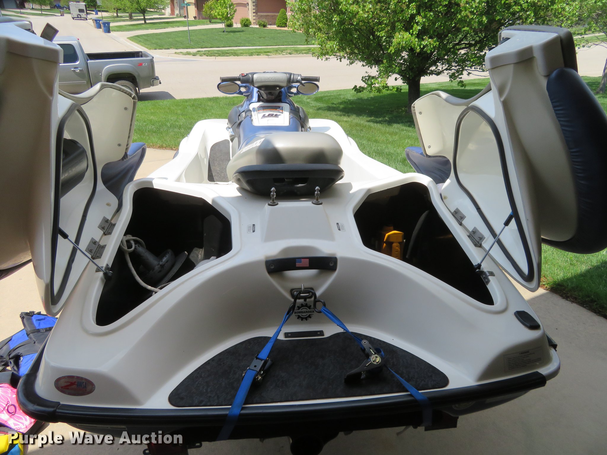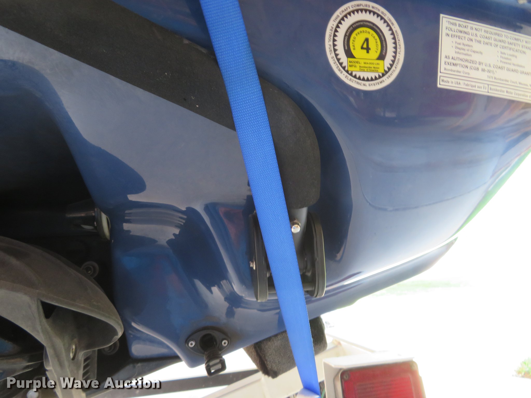 Purple Wave is selling a used Boat in Kansas. This item is a Bombardier Sea Doo LRV personal watercraft with the following: 128 hours on meter, 951cc gas engine, Forward/reverse transmission, Four person capacity, Life jackets, Cover, Hull ID CECA0225J001, Trailer, 4.80-12 tires, Battery need to be replaced