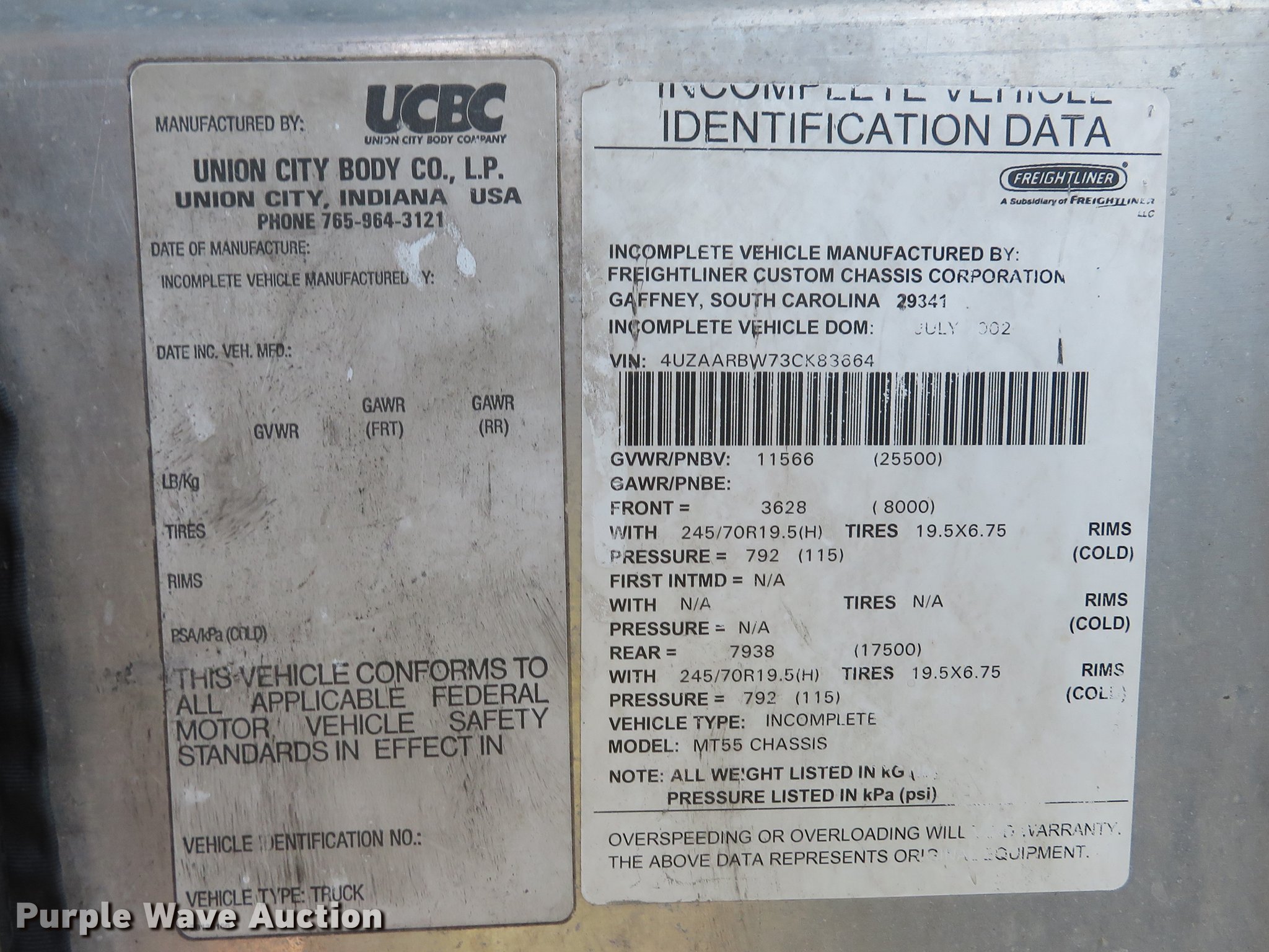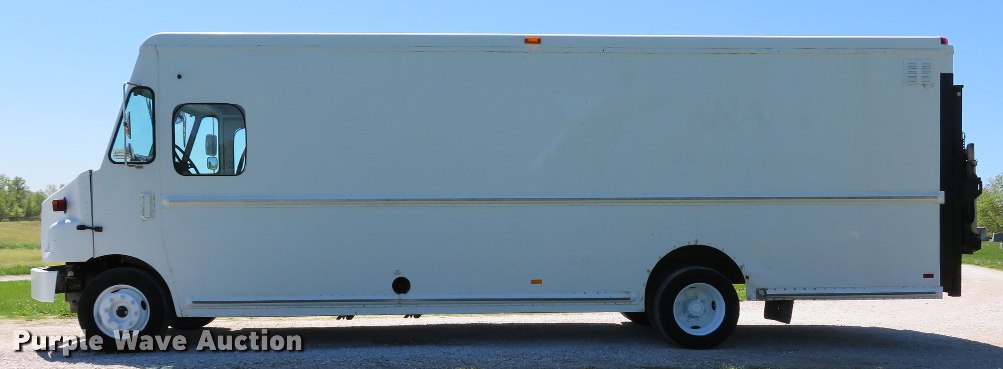 Purple Wave is selling a used Delivery Truck or Van in Missouri. This item is a 2003 Freightliner MT55 delivery truck with the following: Unknown miles on odometer, Cummins ISB 5.9L L6 diesel engine, Allison automatic transmission, Heat, Union City body, 21'8"L, Aluminum floor, Roll-up end gate, Thieman end gate lift, 1,600 lbs maximum lift capacity,, 218" wheelbase, Spring suspension, Hydraulic brakes, 245/70R19.5 tires, GVWR 25,500 lbs, Non-operational backup camera, Non-operational sliding door between cab and body