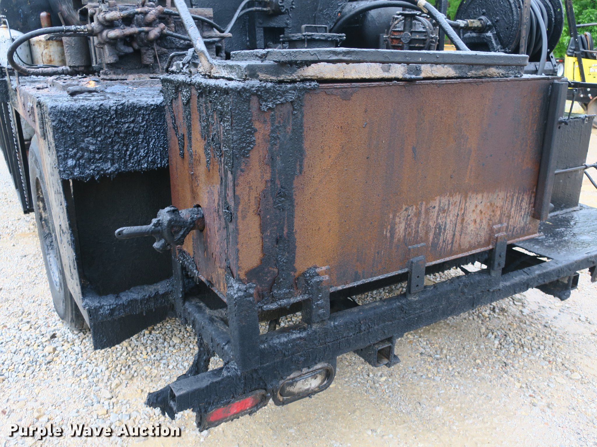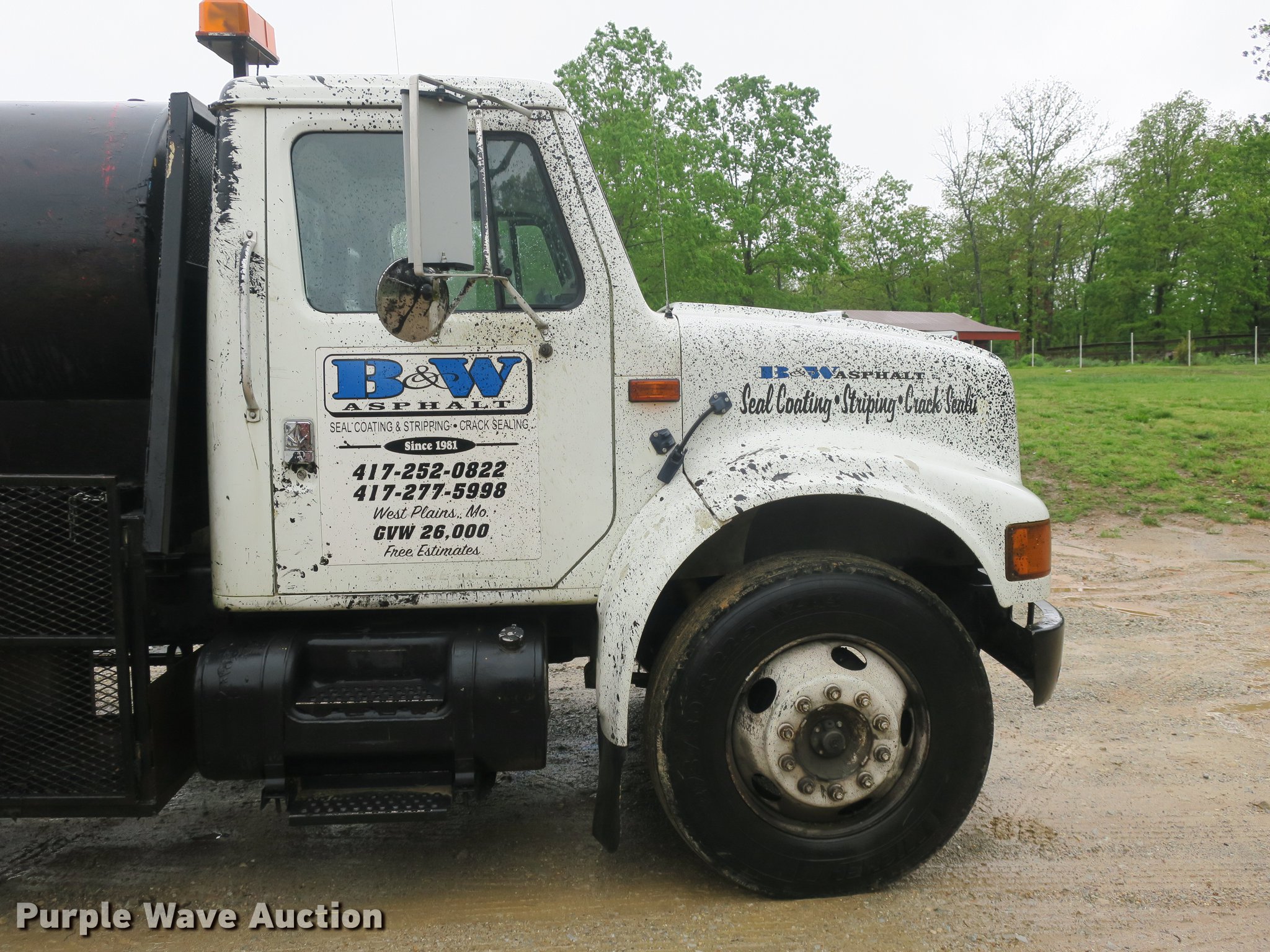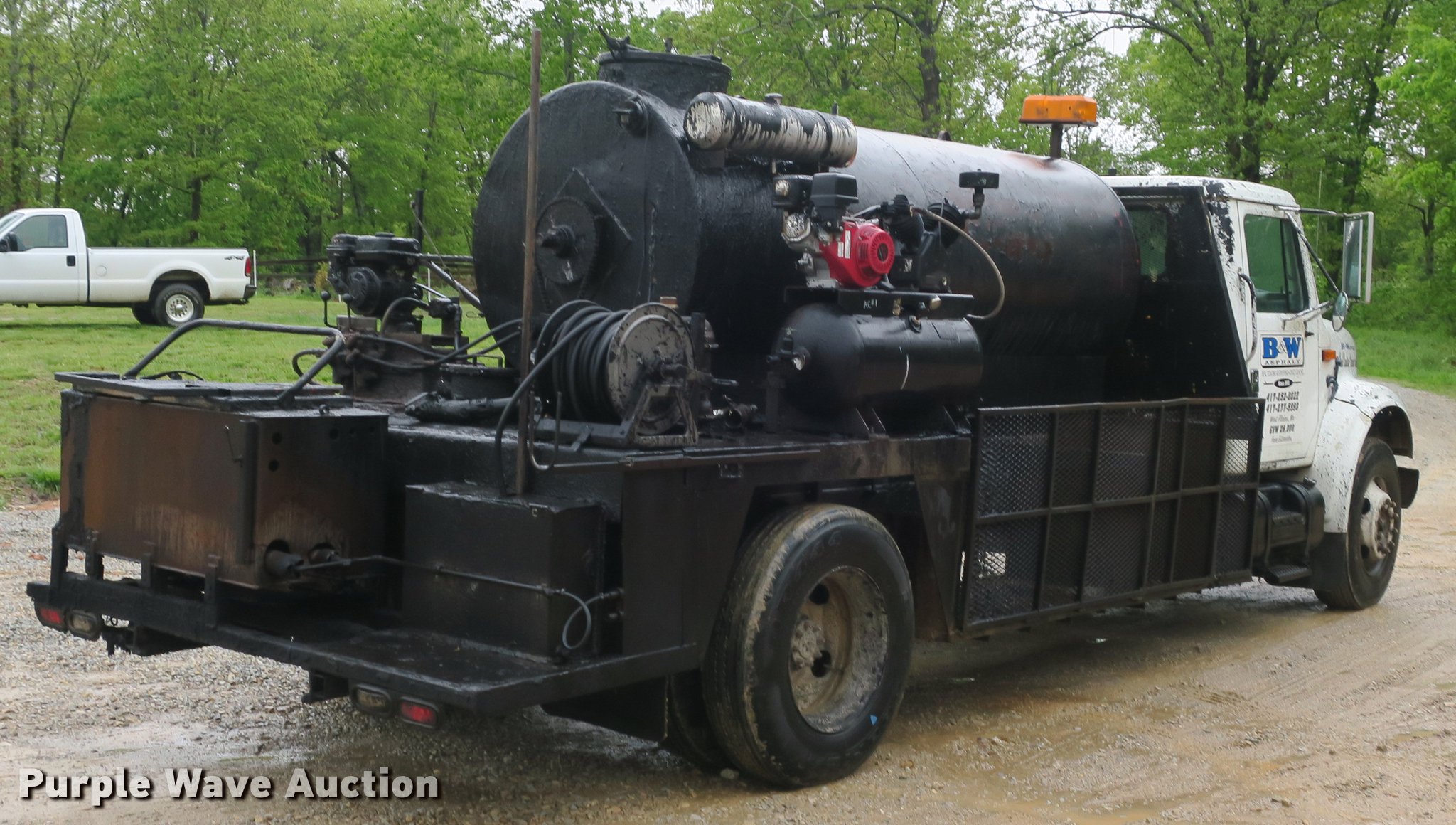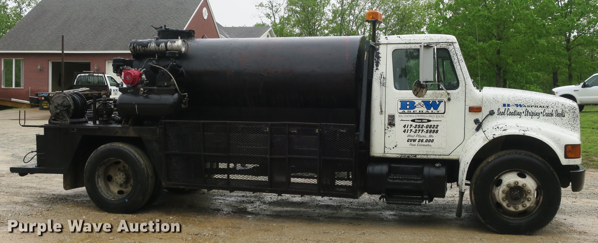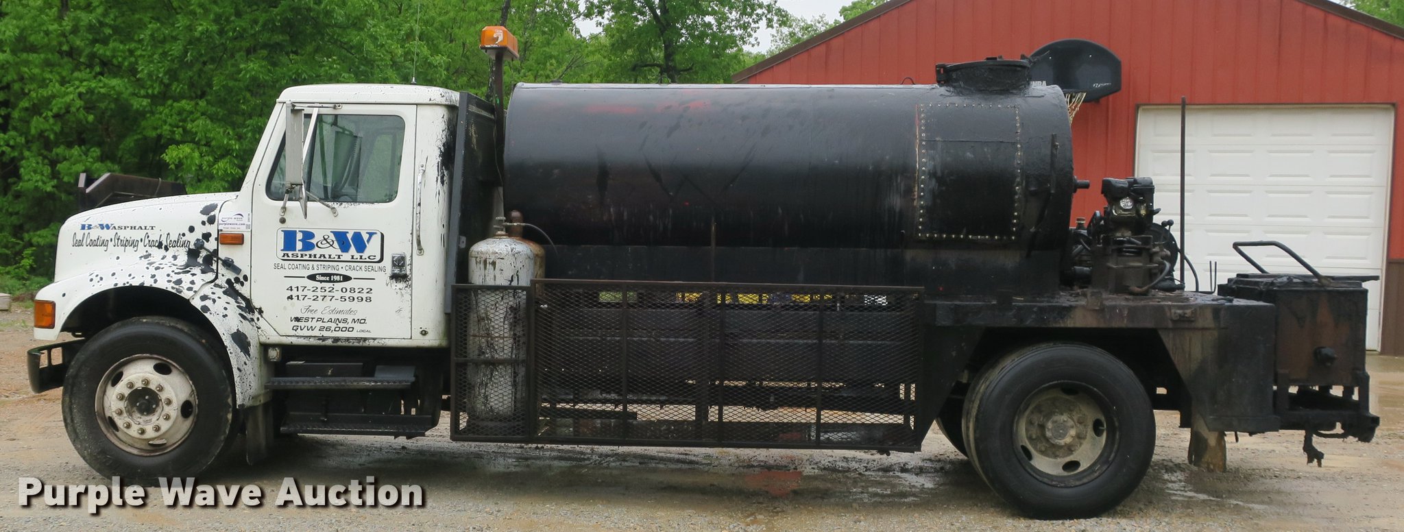 Purple Wave is selling a used Oil Distributor Truck in Missouri. This item is a 1999 International 4700 seal coat truck with the following: 37,661 miles on odometer, International 7.3L V8 diesel engine, Spicer five speed manual transmission, Single axle, AC and heat, Cruise, Suspension seat, Backup camera, 1,000 gallon tank, Paddles, Cleasby 55 gallon direct fire crack melter, Hydraulic agitation power unit, Wilden P4 diaphragm pump, Two gallon filter pot, Strainer, Hannay hose reel, 100'L hose, Air compressor, Honda GX270 gas engine, Shultz pump,, Spring suspension, Hydraulic brakes, 275/80R22.5 tires, Propane tanks included