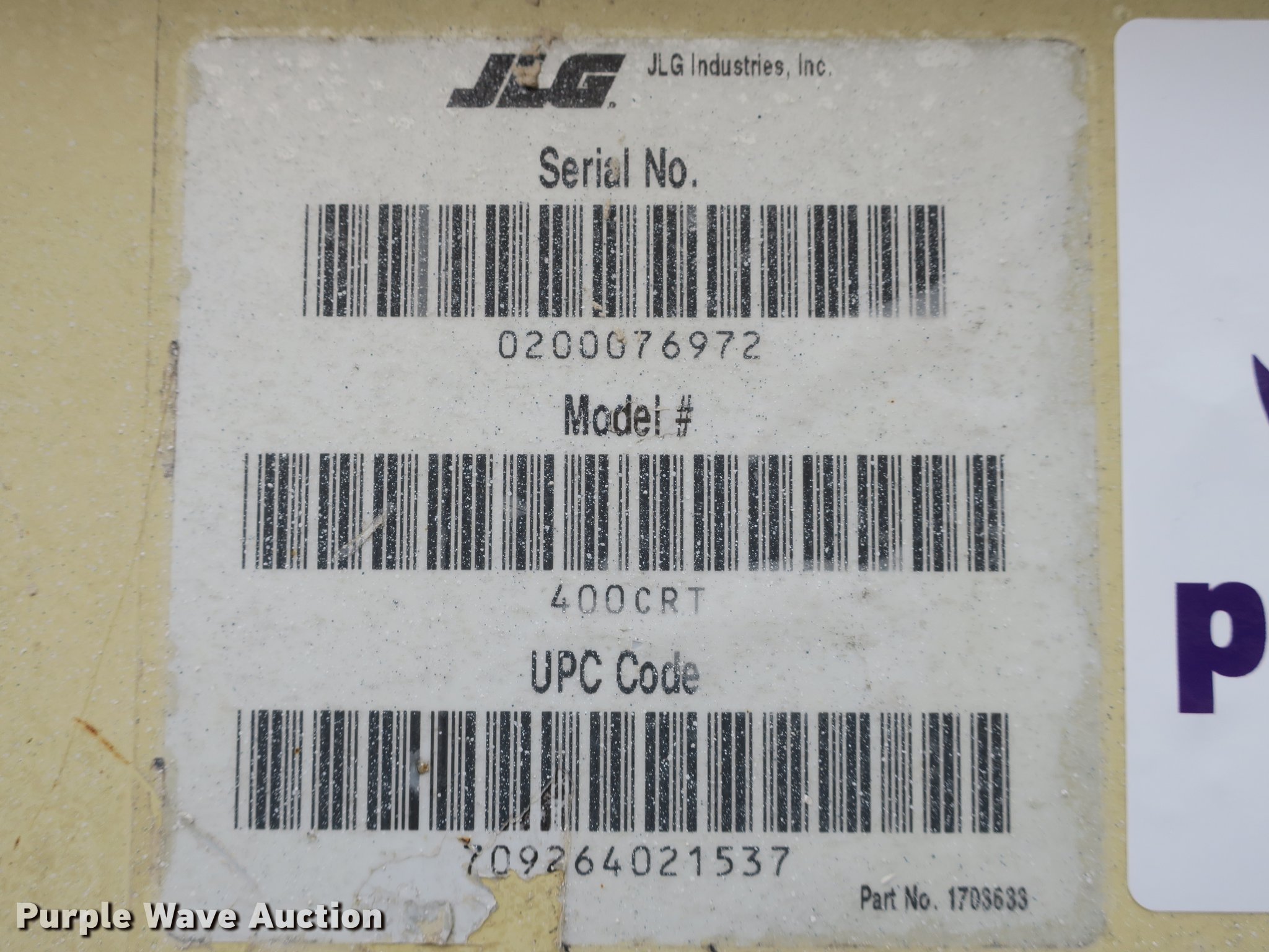 JLG 400CRT scissor lift. 2,811 hours on meter, Dual fuel engine Gas or propane capable, Four wheel drive, 800 lbs maximum lift capacity, 40' maximum lift height, 115"L x 58"W platform Platform and ground controls, AC power outlet, Manual platform extensions, 10-16.5 foam-filled tires, Serial 0200076972. Cecco, Inc.. Mountain Grove, MO 65711