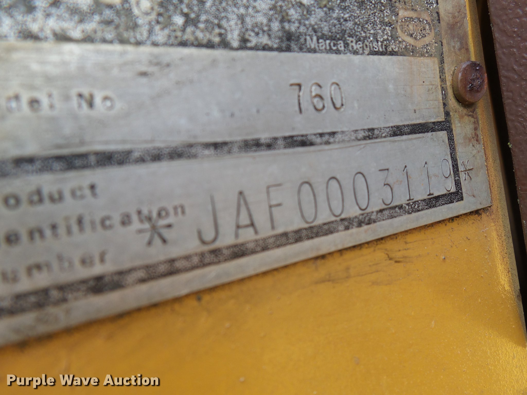 Purple Wave is selling a used Cable Plow in Missouri. This item is a 1988 Case 760 cable plow with the following: 645 hours on meter, Cummins 4B four cylinder diesel engine, Serial 44250568, Manual transmission, 4F-4R gears, Four wheel drive, Four wheel steer, OROPS, Suspension seat, Vibratory plow model 108917A1, 36" pull blade depth, 1 1/4" thick, Reel carrier, 57" maximum width, Titan 38 x 18-20 tires, Serial JAF0003119
