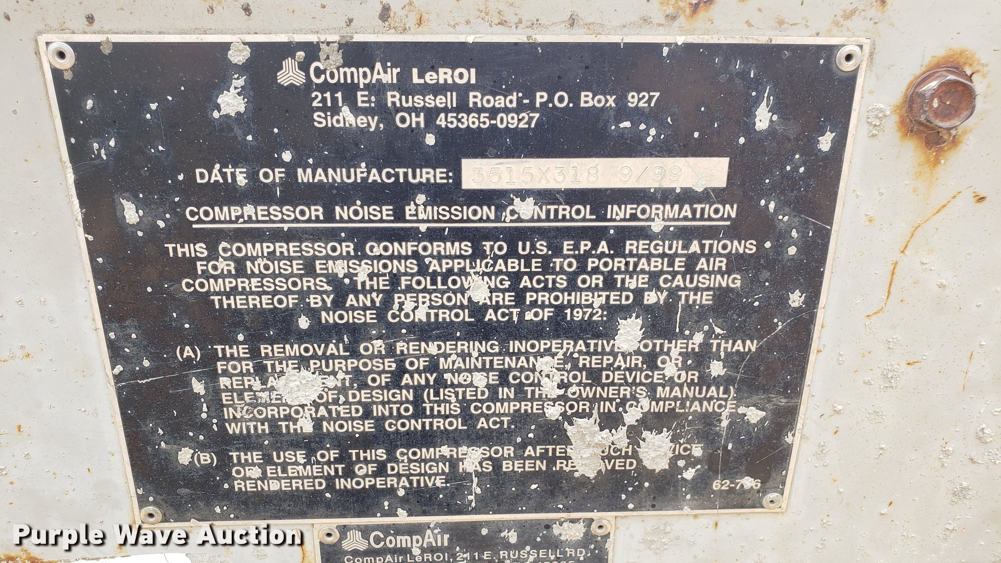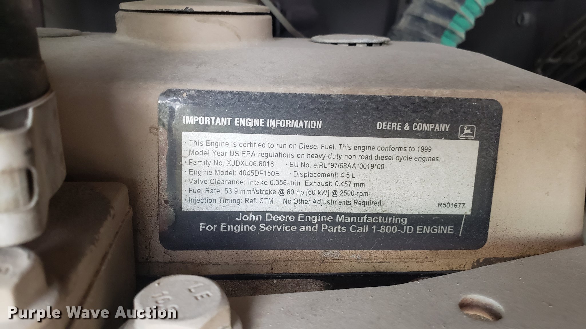 Leroi 185 air compressor. 5,798 hours on meter, John Deere 4.5L four cylinder diesel engine Serial PE4045D053479, Pintle hitch, Jack stand, 225/75R15 tires. Transfer of ownership documentation will be a bill of sale. Epic Concrete Construction. 3810 Fremont Ave. Kansas City, MO 64129