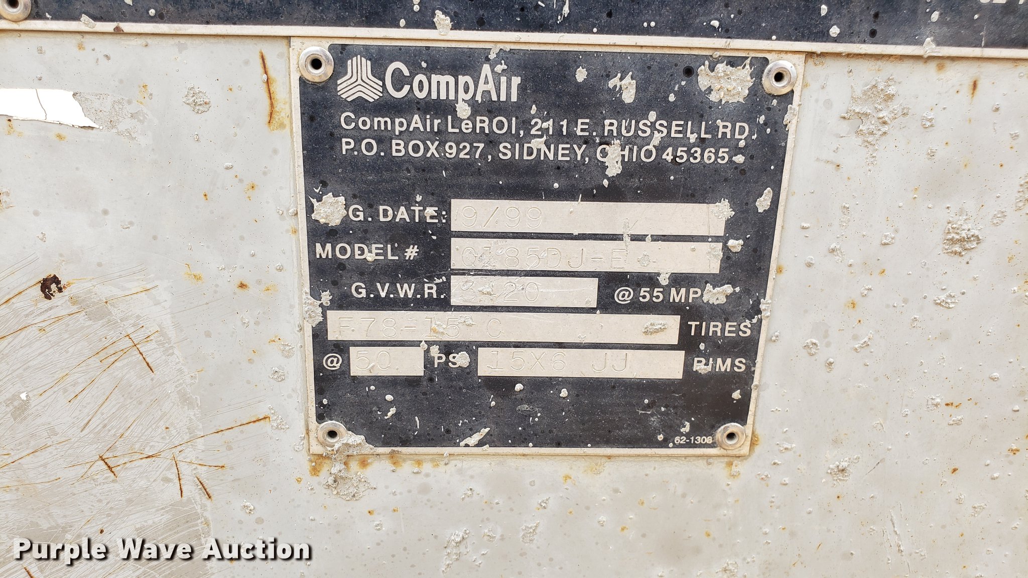 Purple Wave is selling a used Air Compressor in Missouri. This item is a Leroi 185 air compressor with the following: 5,798 hours on meter, John Deere 4.5L four cylinder diesel engine, Serial PE4045D053479, Pintle hitch, Jack stand, 225/75R15 tires
