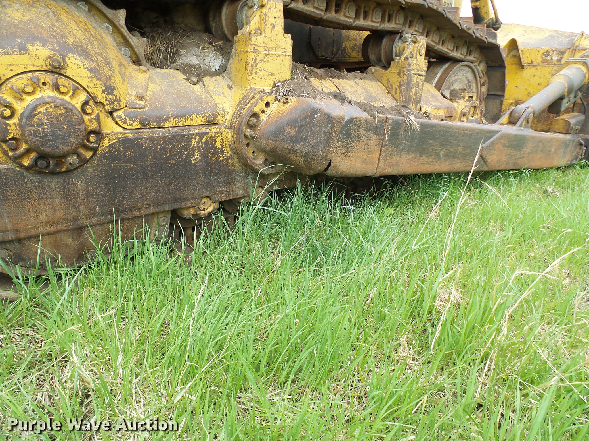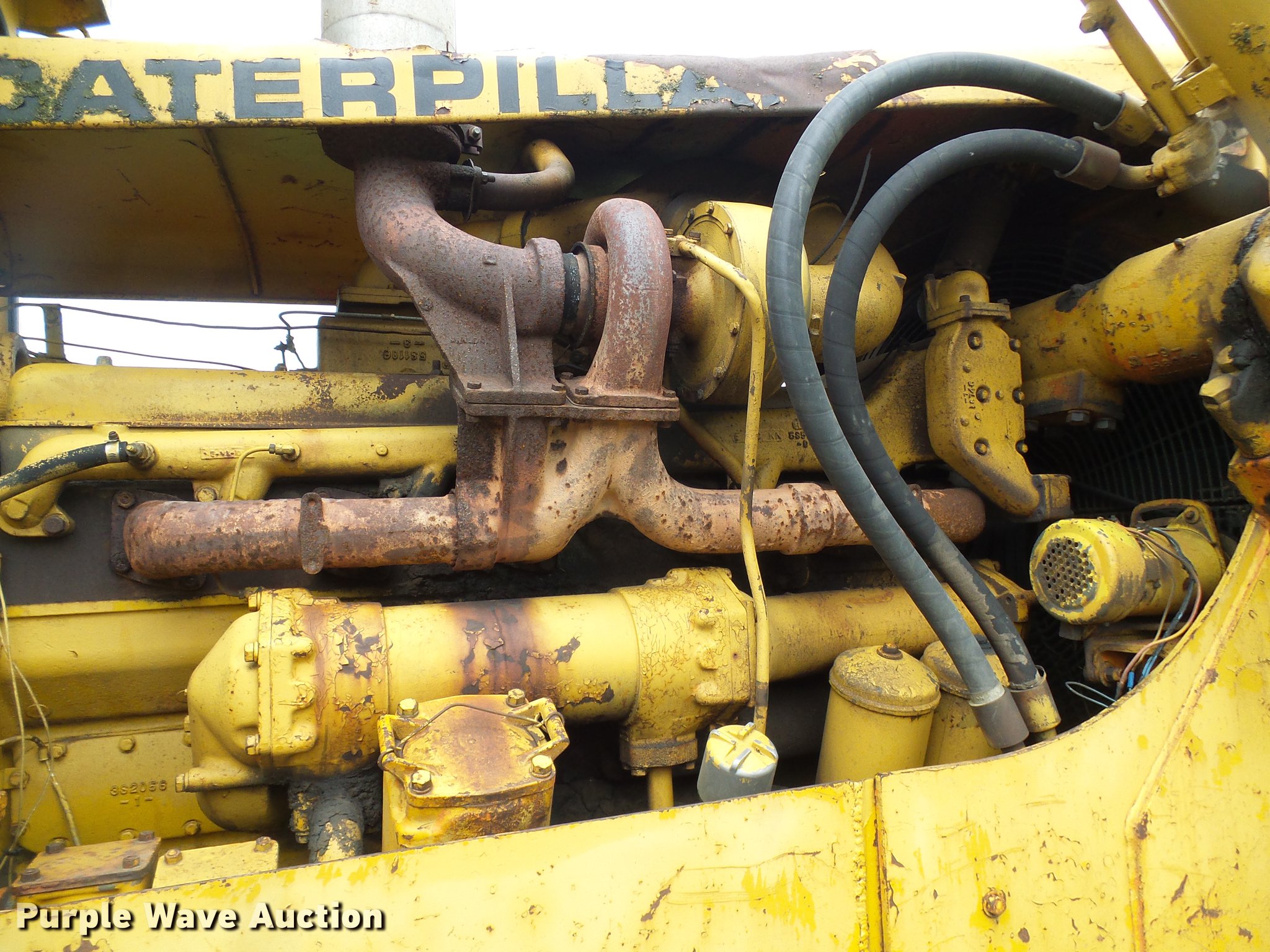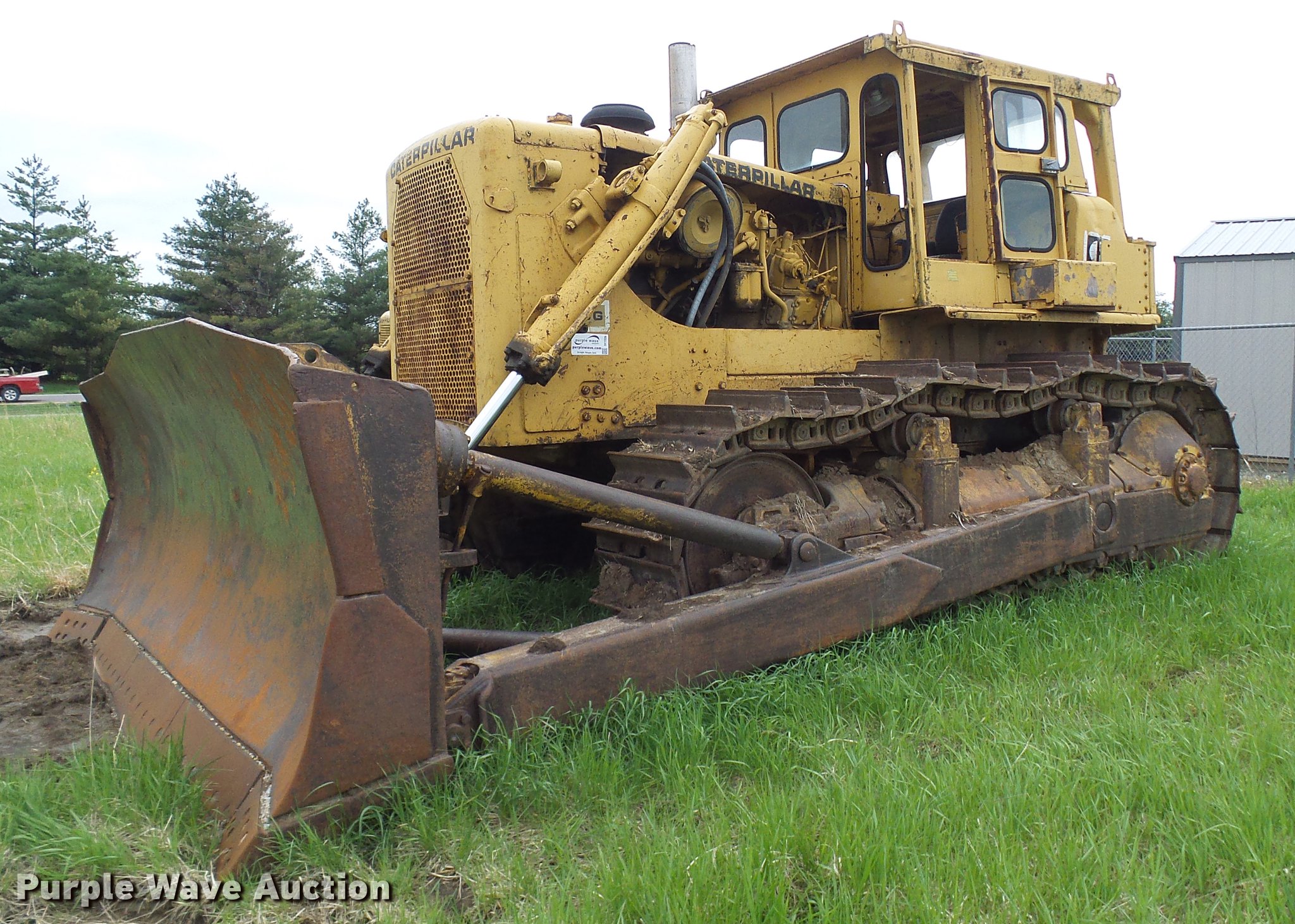 Purple Wave is selling a used Crawler Dozer in Missouri. This item is a 1969 Caterpillar D9G dozer with the following: 3,822 hours on meter, Caterpillar D353 six cylinder diesel engine, Powershift transmission, 3F-3R gears, Enclosed cab, Suspension seat, Clutch brake steering, 13'8" straight dozer blade, Draw bar, Seven bottom rollers, 24" single grouser track pads, Serial 66A7933