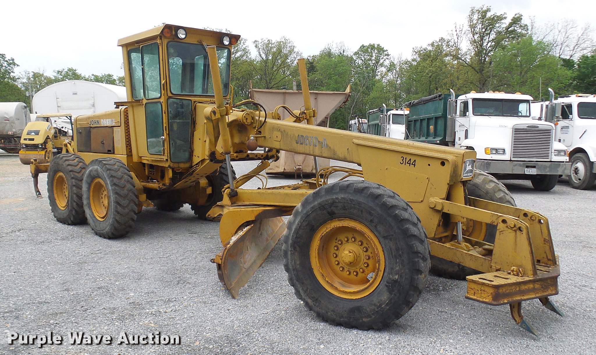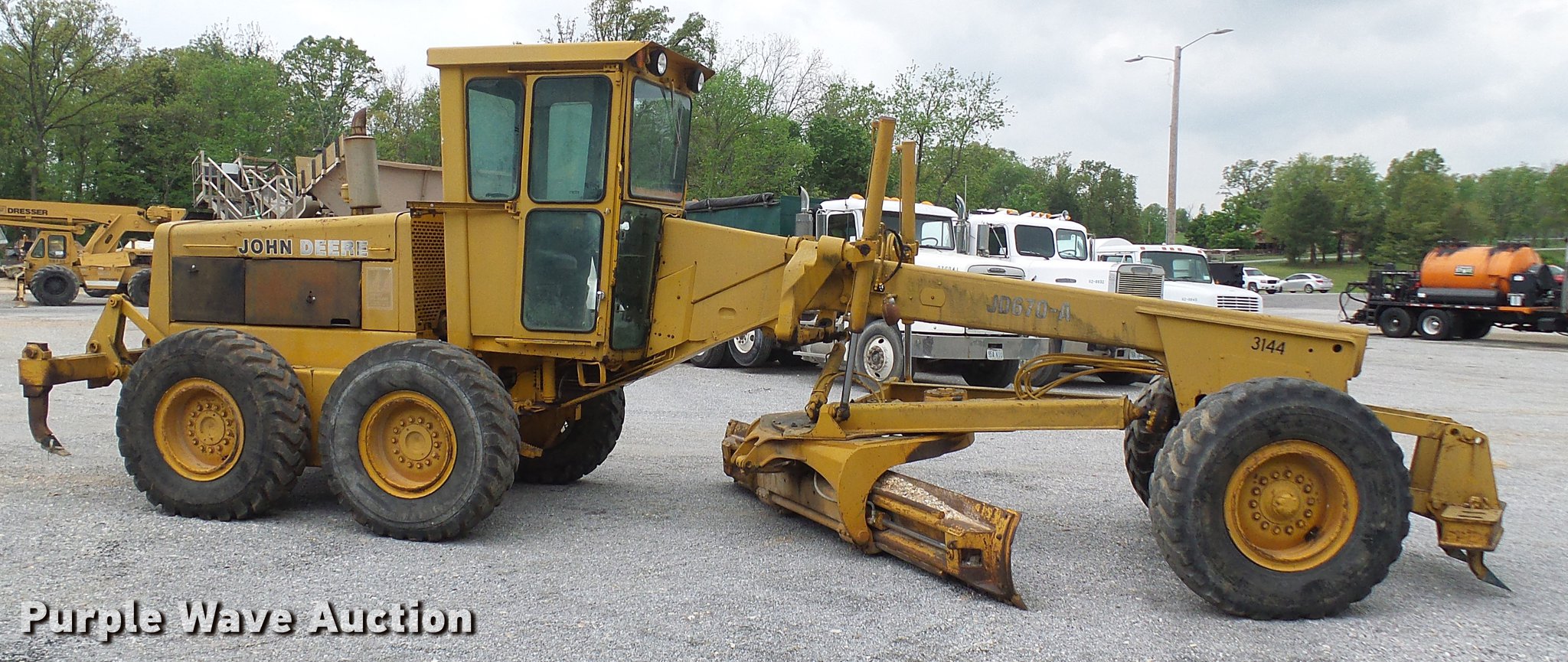Purple Wave is selling a used Motor Grader in Missouri. This item is a John Deere 670A motor grader with the following: John Deere six cylinder diesel engine, Powershift transmission, 8F-4R gears, EROPS, Seven hydraulic control valves, 13'W moldboard, Tip control, Side shift, John Deere front mounted scarifier, (2) teeth, Rear ripper, (3) shanks, 14.00-24 tires, Unit# 3144