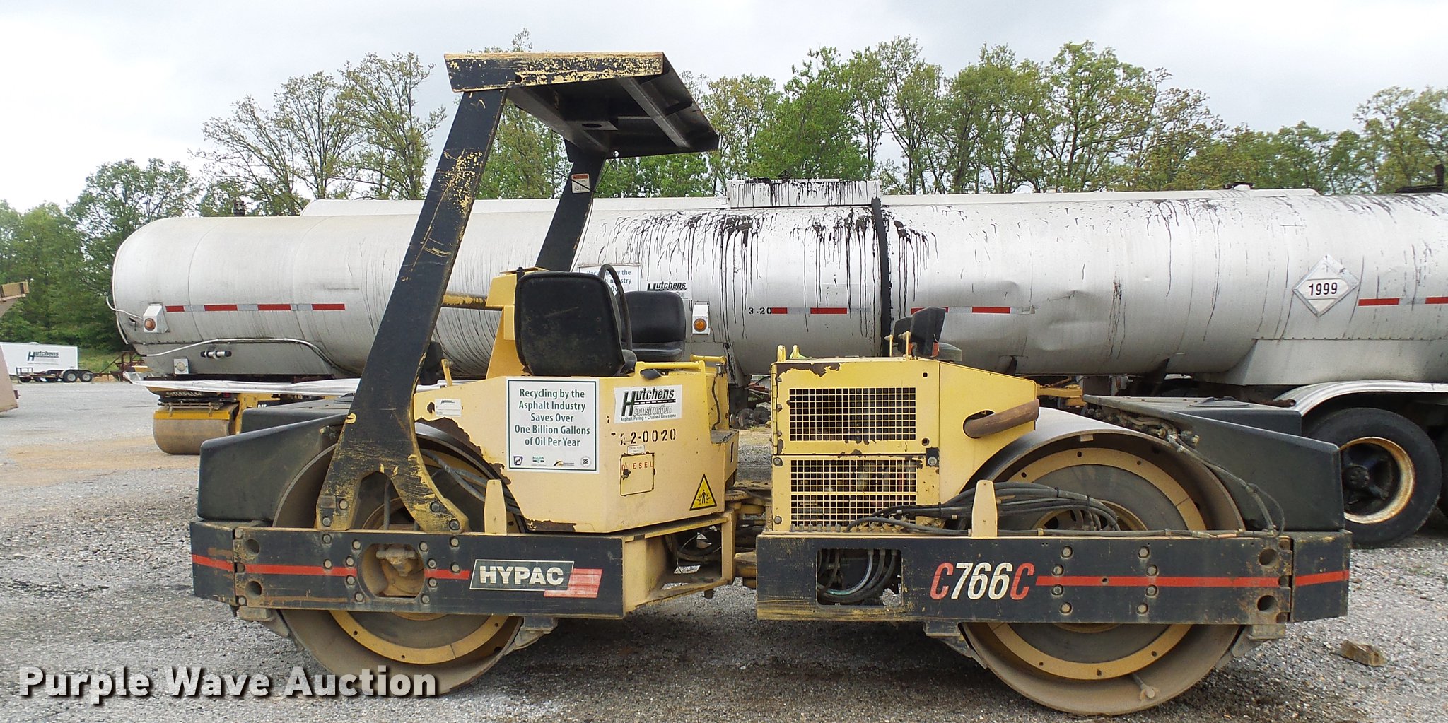 Purple Wave is selling a used Double Drum Roller Compactor in Missouri. This item is a Hypac C766C vibratory double drum roller with the following: 5,064 hours on meter, Cummins four cylinder diesel engine, Hydrostatic transmission, Canopy, Suspension seat, 66"W x 48" diameter smooth drums, Double vibratory system, Front and rear drum scrapers, Front and rear water application, Serial 901C20902554, Unit# 22-0020