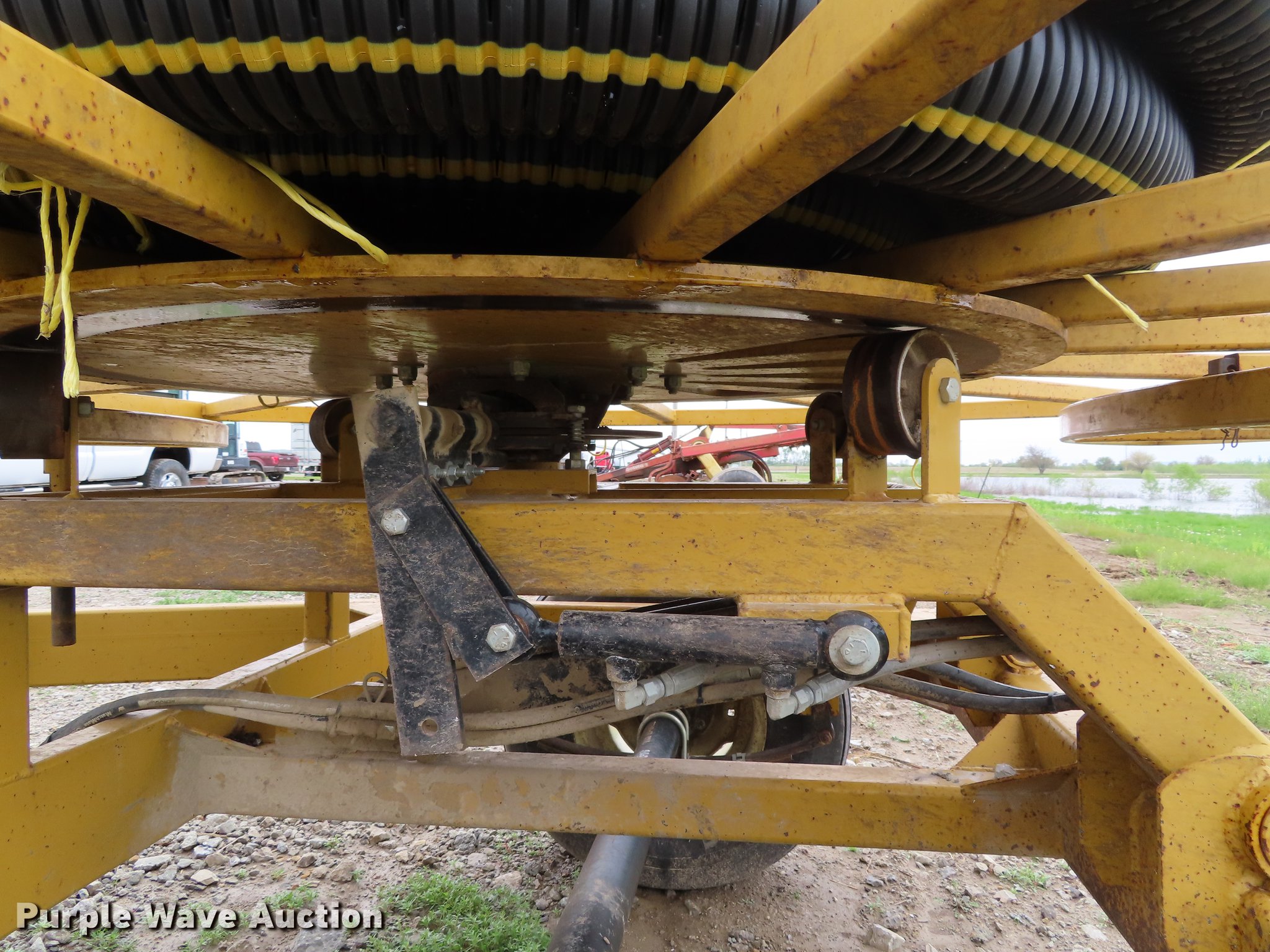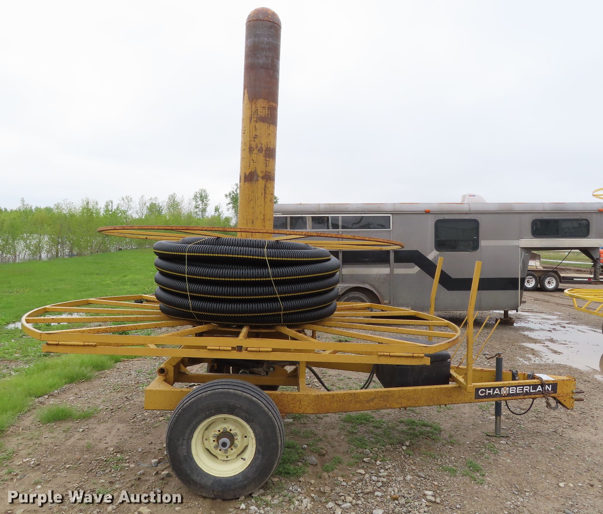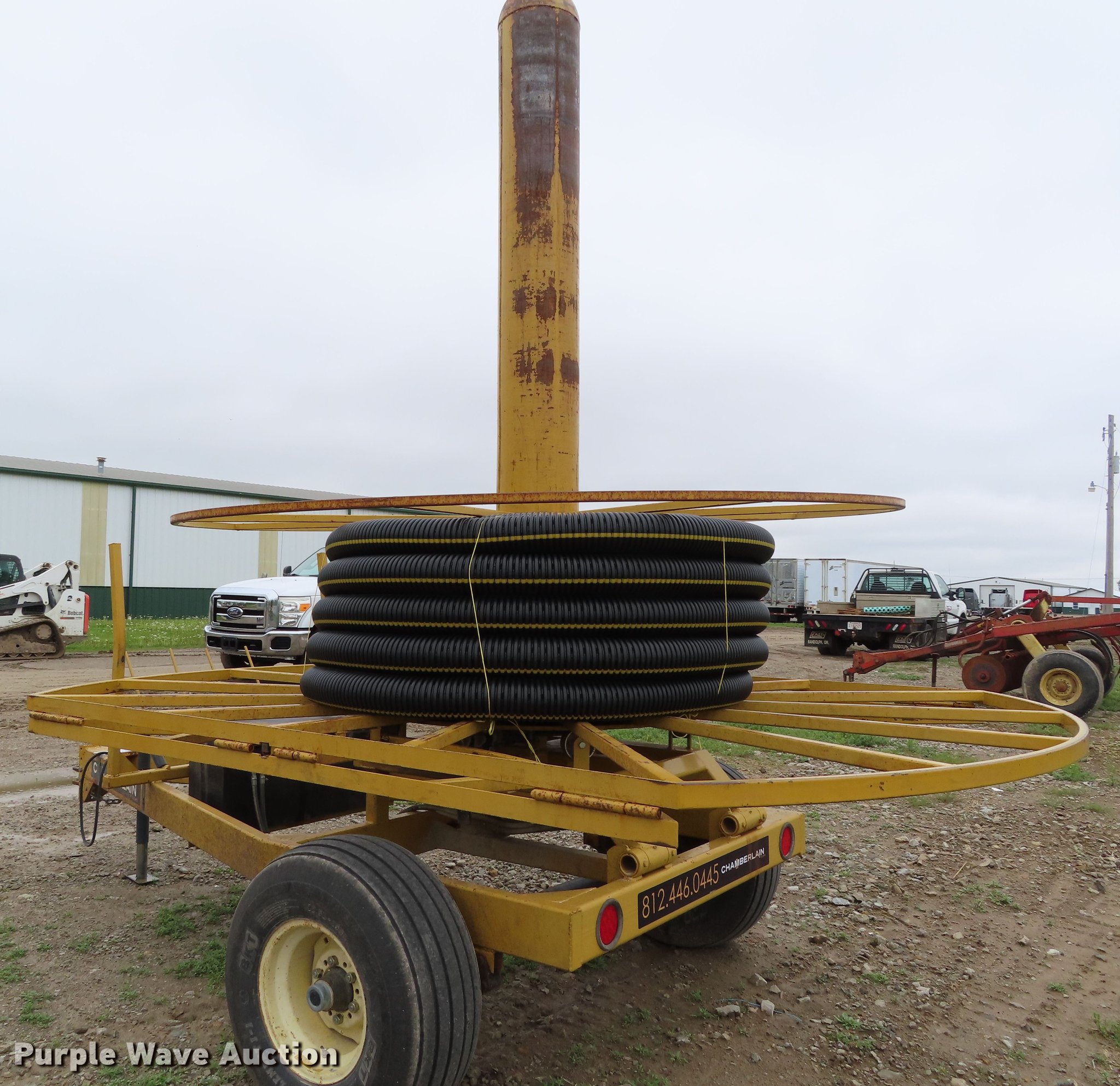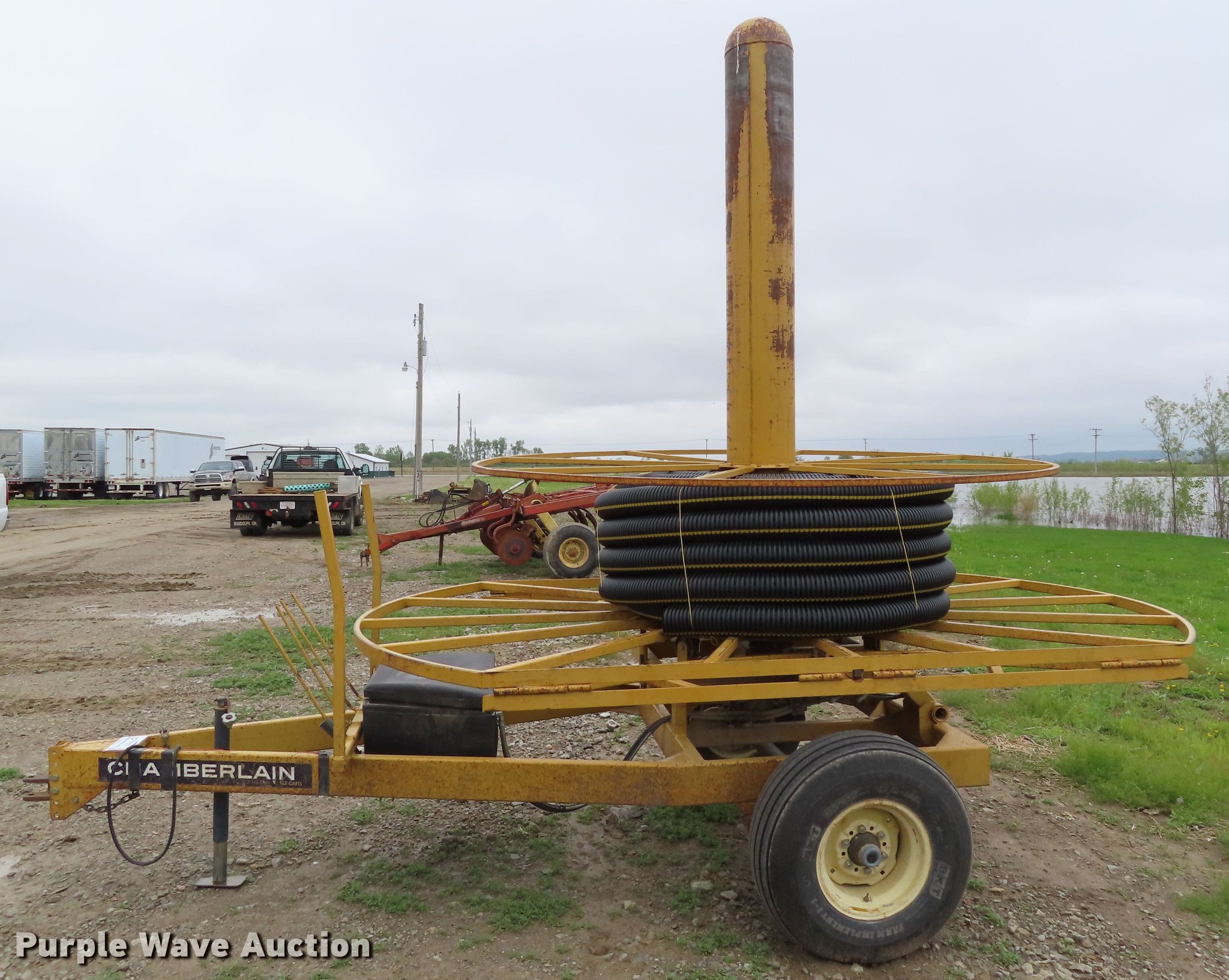 Purple Wave is selling a used Reel Trailer in Kansas. This item is a Chamberlain tile trailer with the following: Electric over hydraulic operation, Hydraulic reel brake, Hydraulic loading, Pin hitch, 12.5L-15 tires, Serial 91011612