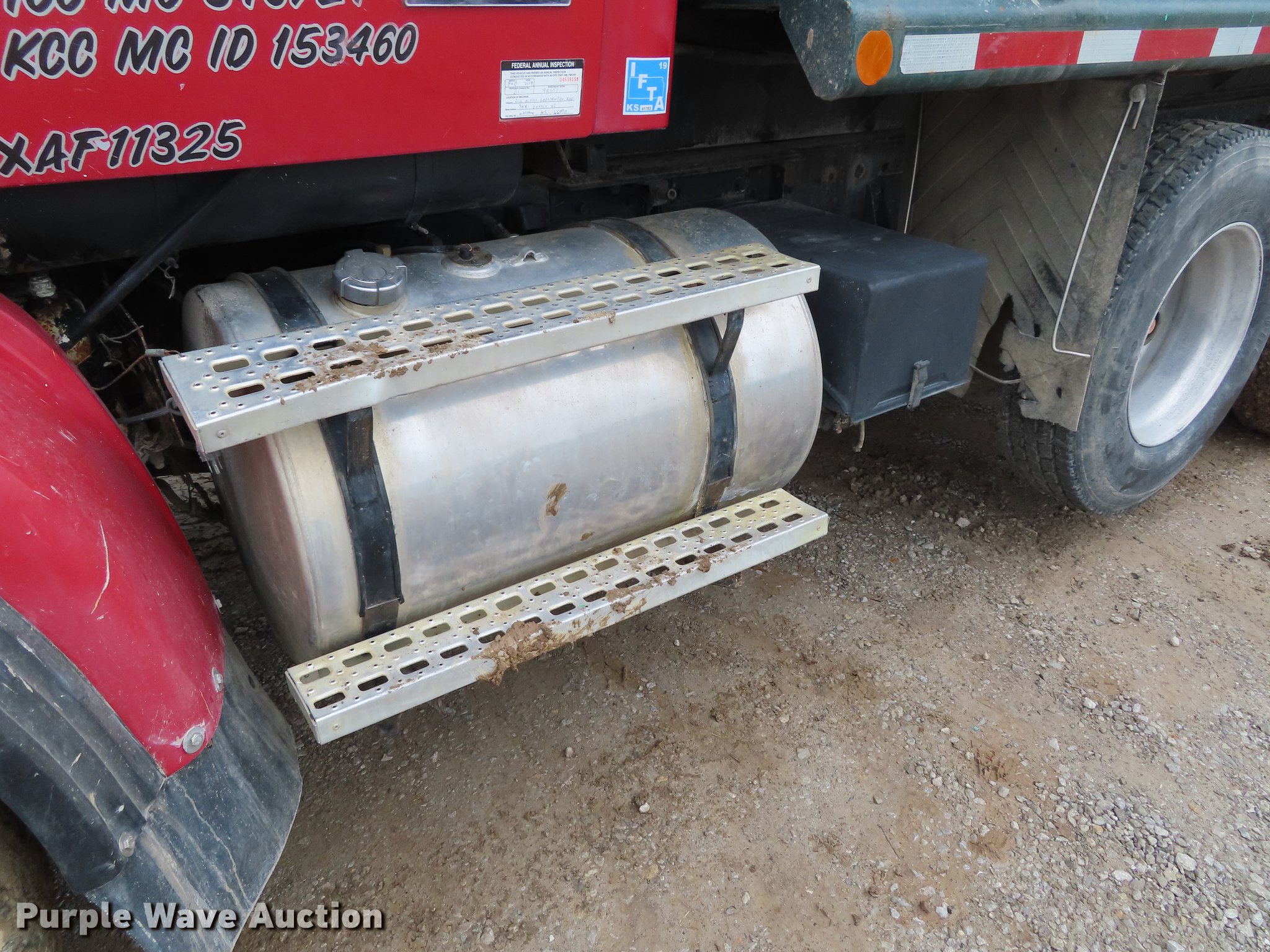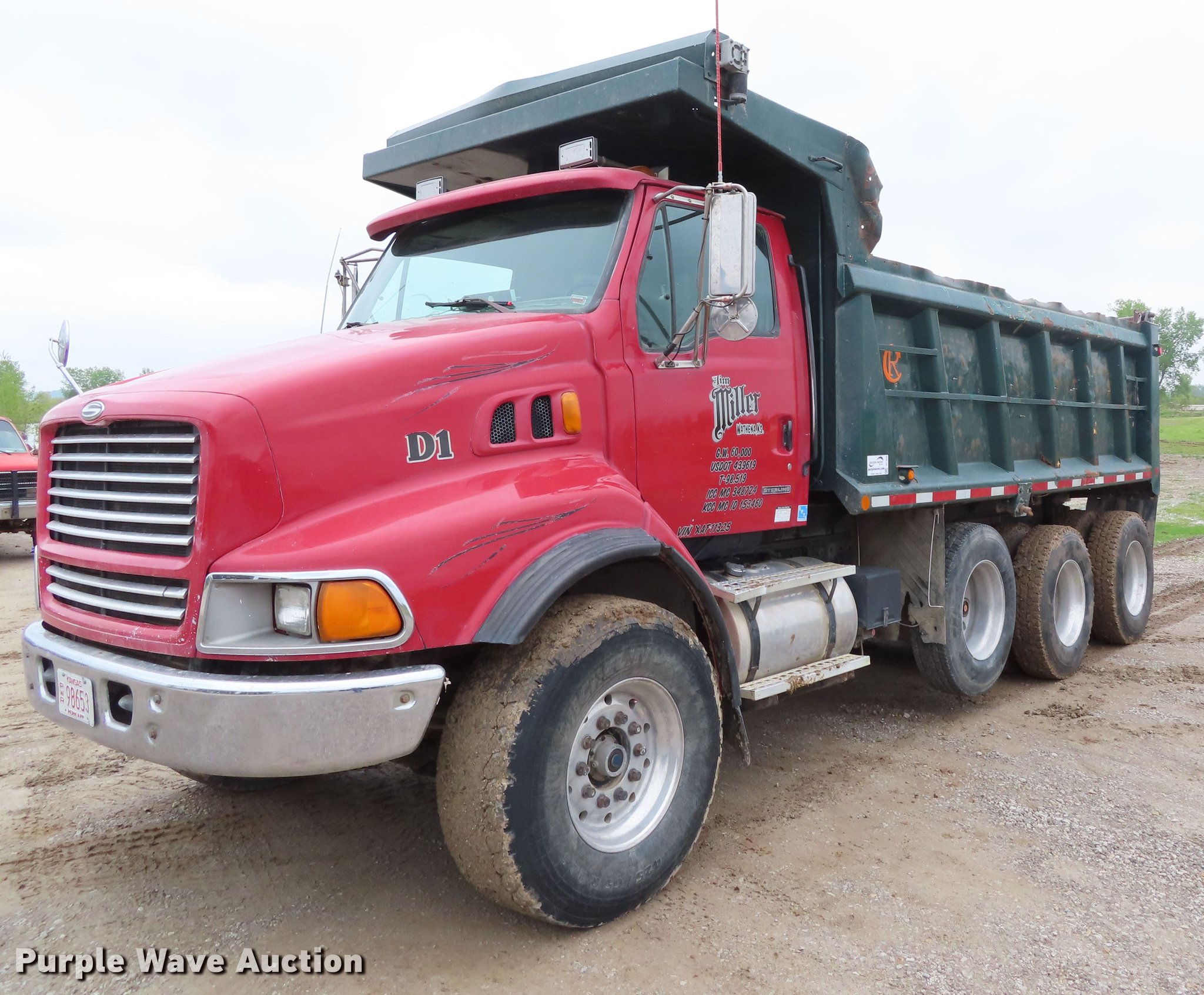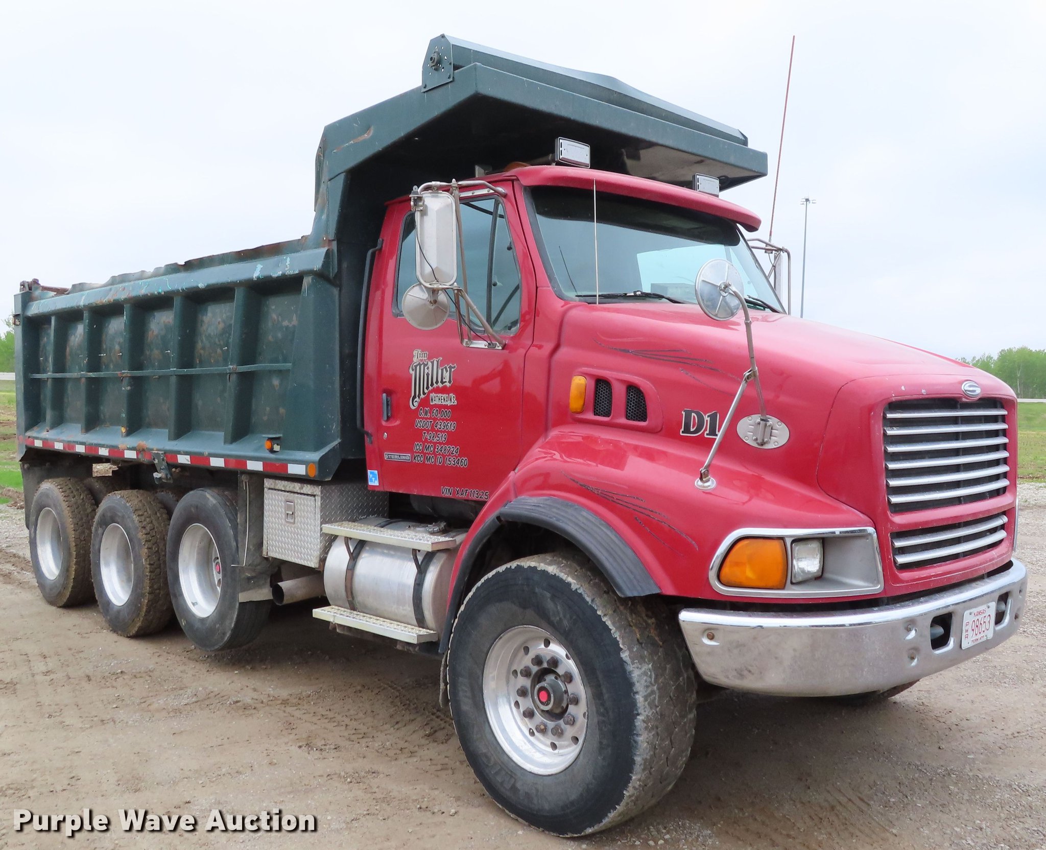 1999 Sterling A-Line dump truck. 590,344 miles on odometer, Cummins M11-400E 10.8L L6 diesel engine 400 HP, Eaton Fuller eight speed manual transmission Lo-Lo, Triple axle Pusher lift axle, Inter-axle differential lock, AC and heat, Heated mirrors, Air suspension seat, PTO, 16'L x 96"W steel dump bed 44" side height, Single ram hoist, Air operated end gate, Dual fuel tanks, Walking beam suspension, Air brakes, 425/65R22.5 front tires, 295/75R22.5 pusher axle tires, 11R22.5 rear tires, GVWR 86,000 lbs, FAWR 20,000 lbs, Lift axle GAWR 20,000 lbs, IAWR 23,000 lbs, RAWR 23,000 lbs. Kansas title. 2FZXKMDB6XAF11325. Jim Miller Construction Inc.. 2335 165th Rd. Wathena, KS 66090