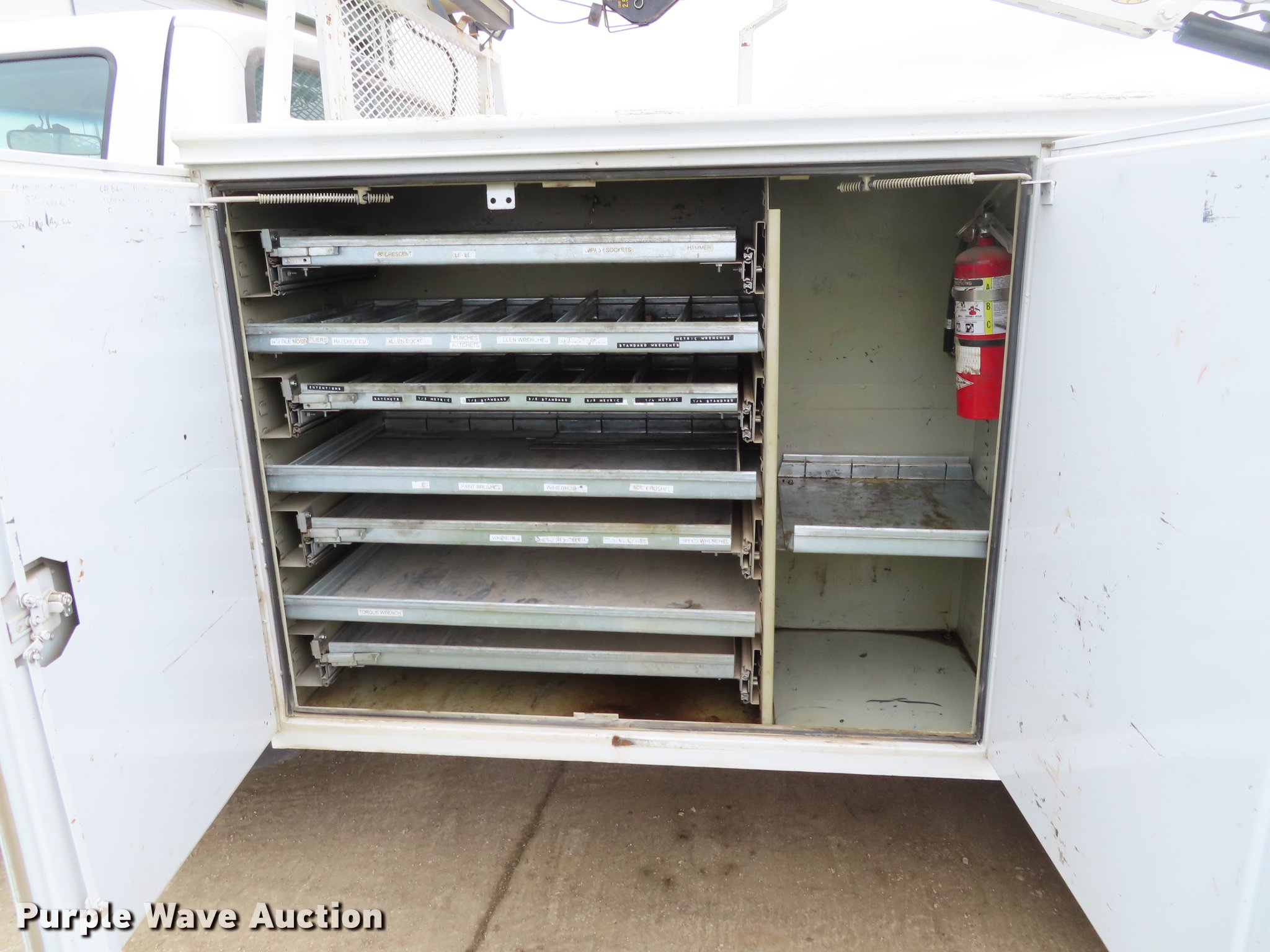 Purple Wave is selling a used Service Truck in Kansas. This item is a 2007 Ford F550 utility truck with crane with the following: 191,297 miles on odometer, 6.0L V8 OHV 32V diesel engine, Automatic transmission, Single axle, AC and heat, Knapheide utility bed, 11'L, Shelving, Slide-out drawers, Work lights, Inverter, Toolbox, Tommy Gate end gate lift, IMT 2020 crane, 20'L boom, 5,000 lbs max lift capacity, Remote control, (2) outriggers, Spring suspension, Hydraulic brakes, 225/70R19.5 tires, GVWR 17,950 lbs